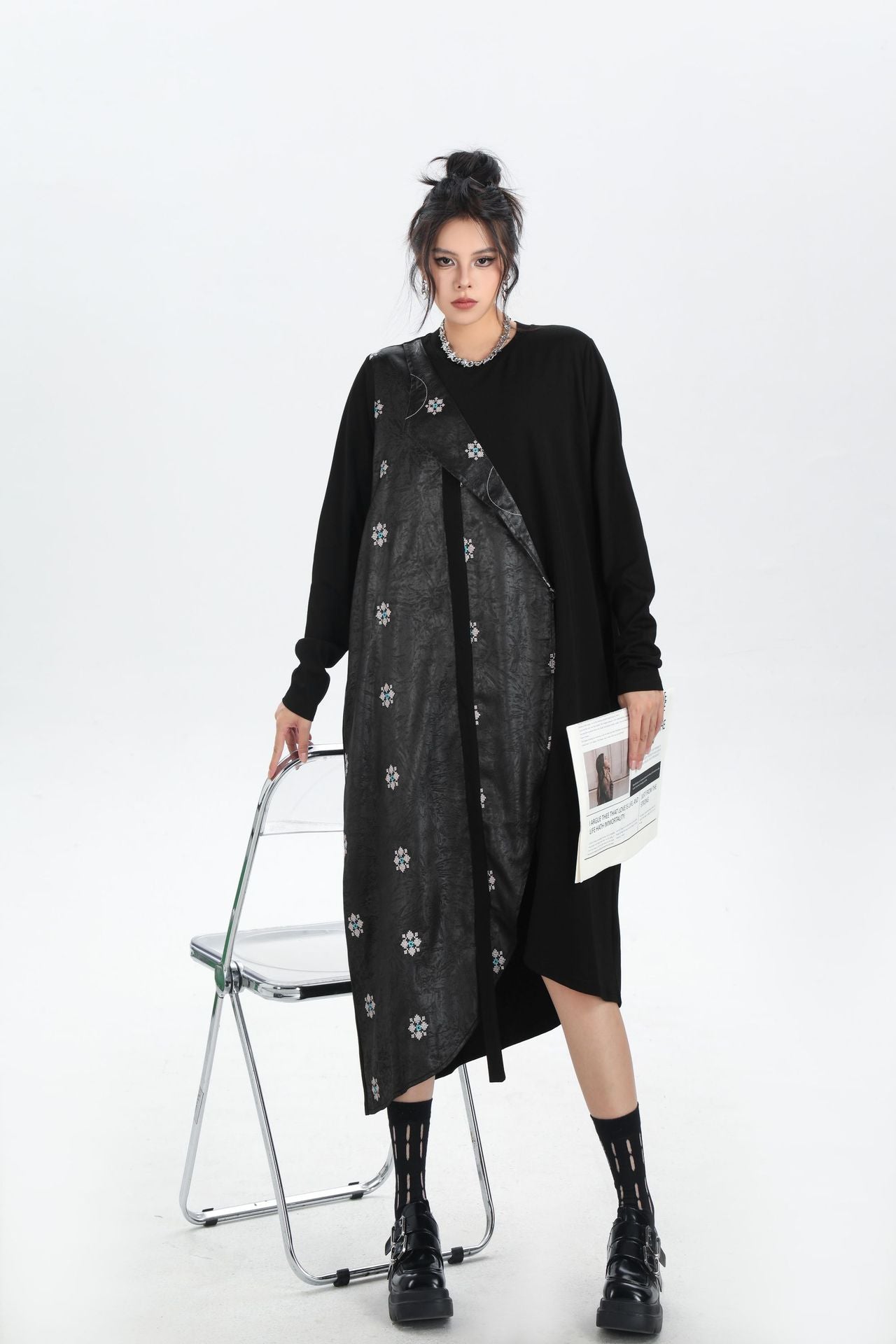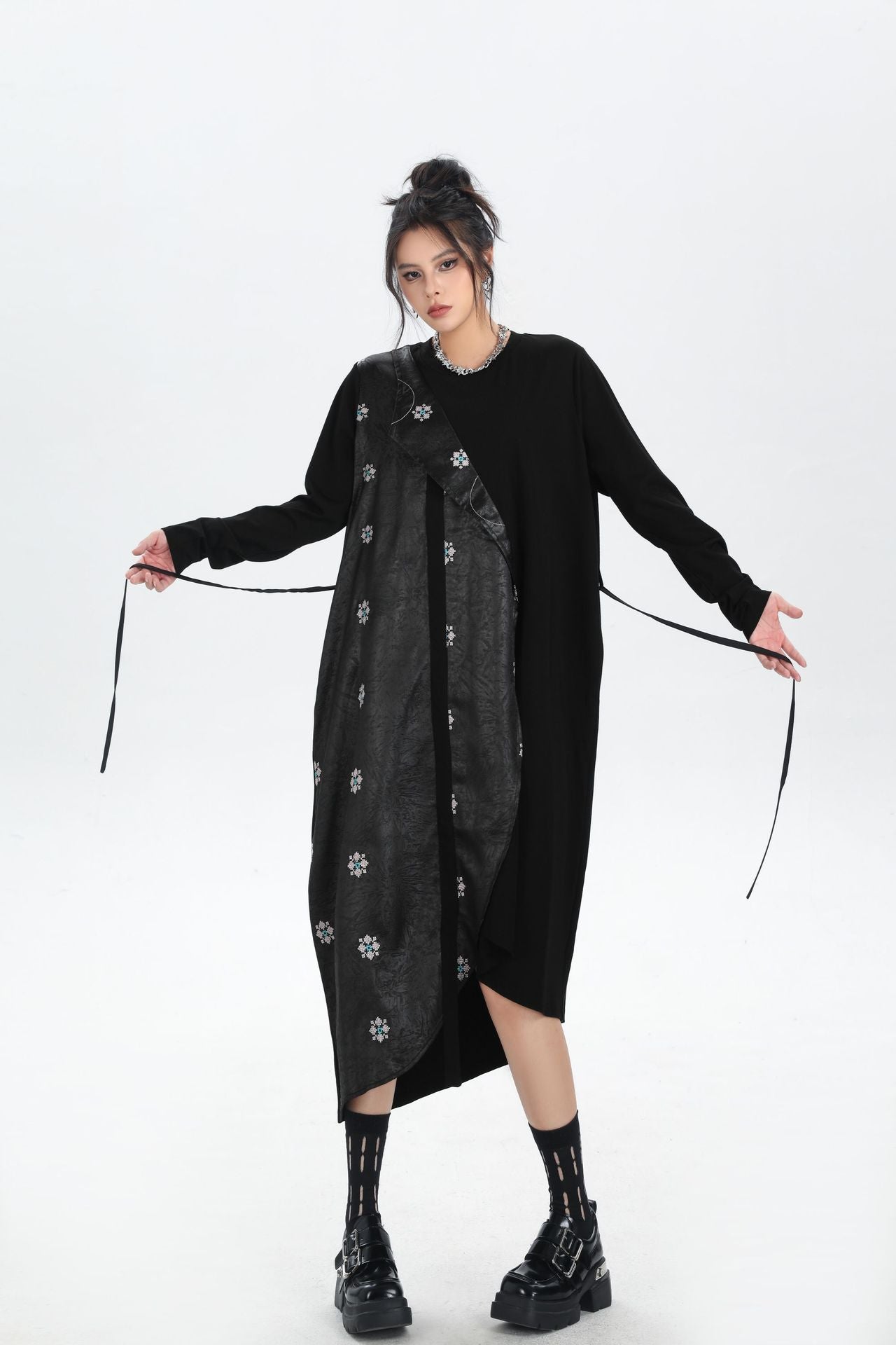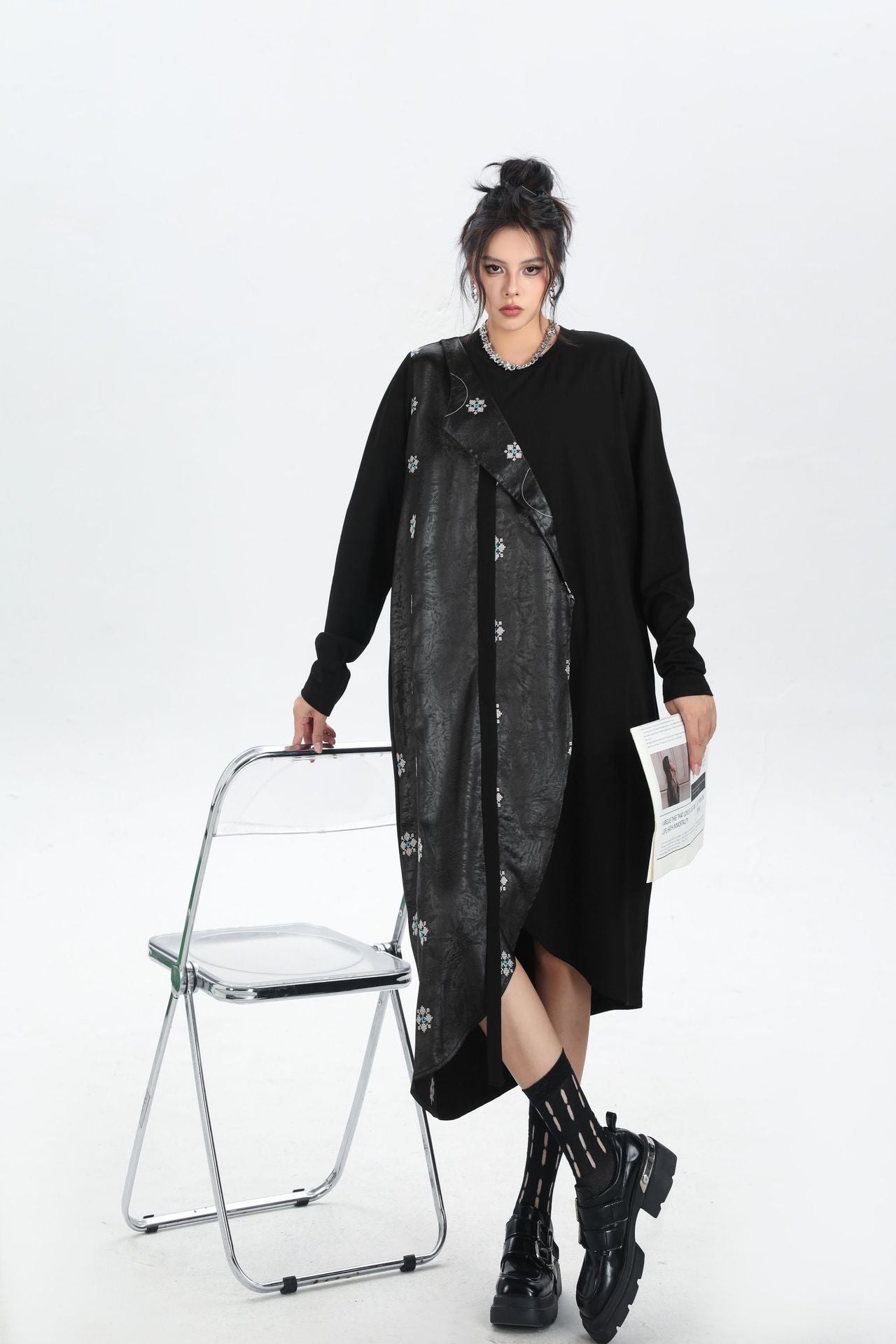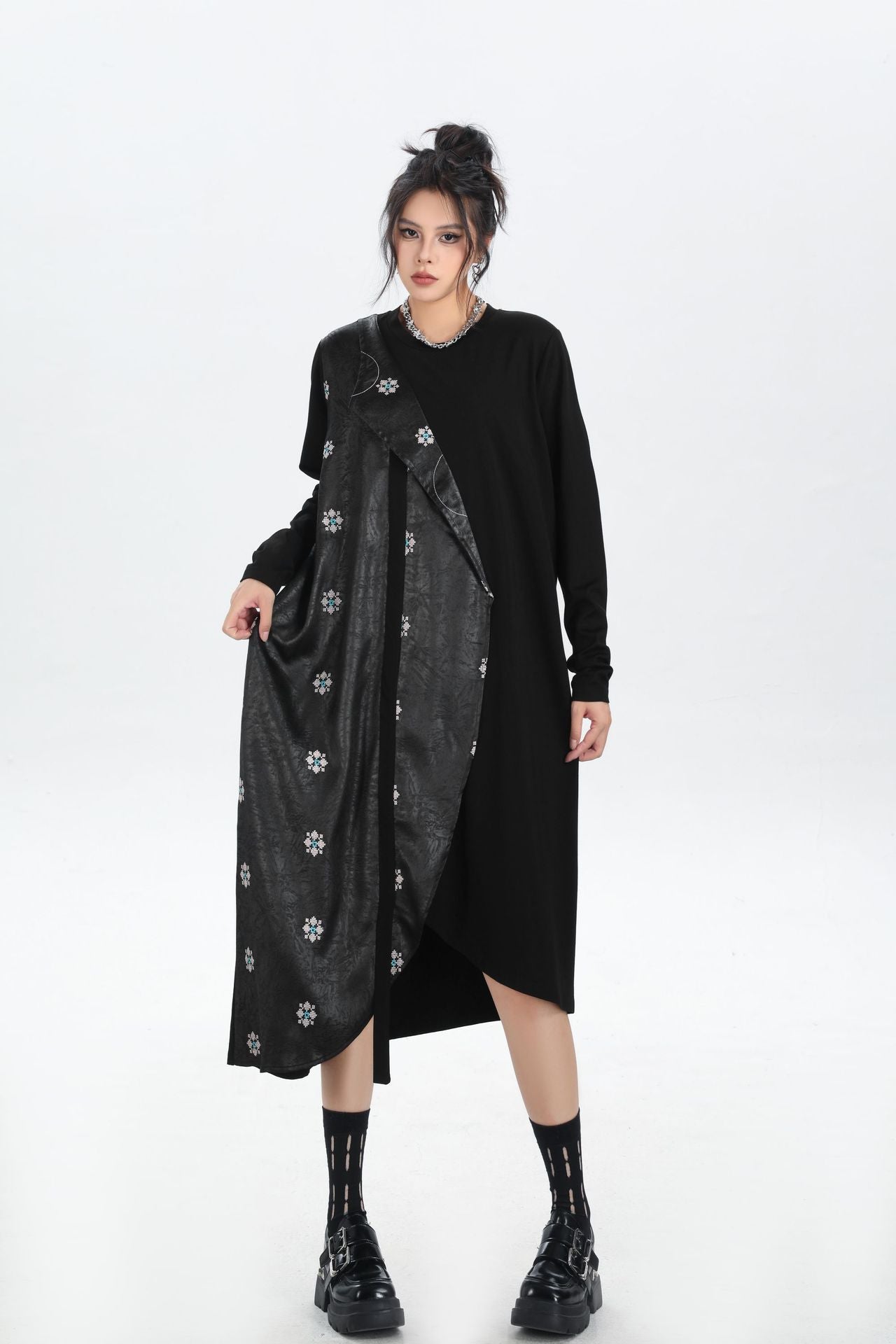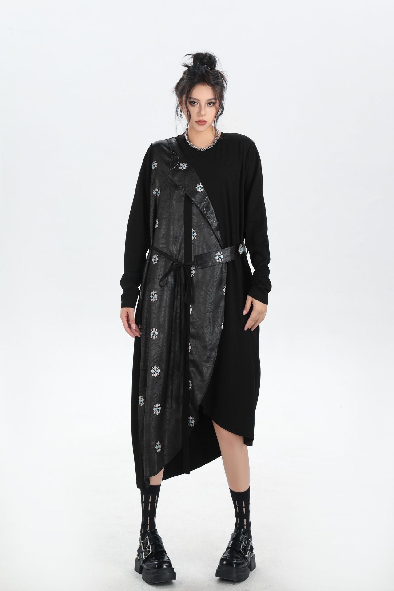 片側に施された艶のあるPU素材のパネルが特徴的なデザインドレス。パネルには小花を思わせる規則的な刺繍模様が施され、立体的な質感が全体に華やかさをプラス。ベースはブラックのカットソー素材で、ストンと落ちるロングシルエットが体のラインを拾わず、美しく着こなせる構造。アシンメトリックに垂れるフロントのデザインはドレープを強調し、洗練された印象を与える。バックにはシンプルなラインが施されており、全体のバランスも秀逸。