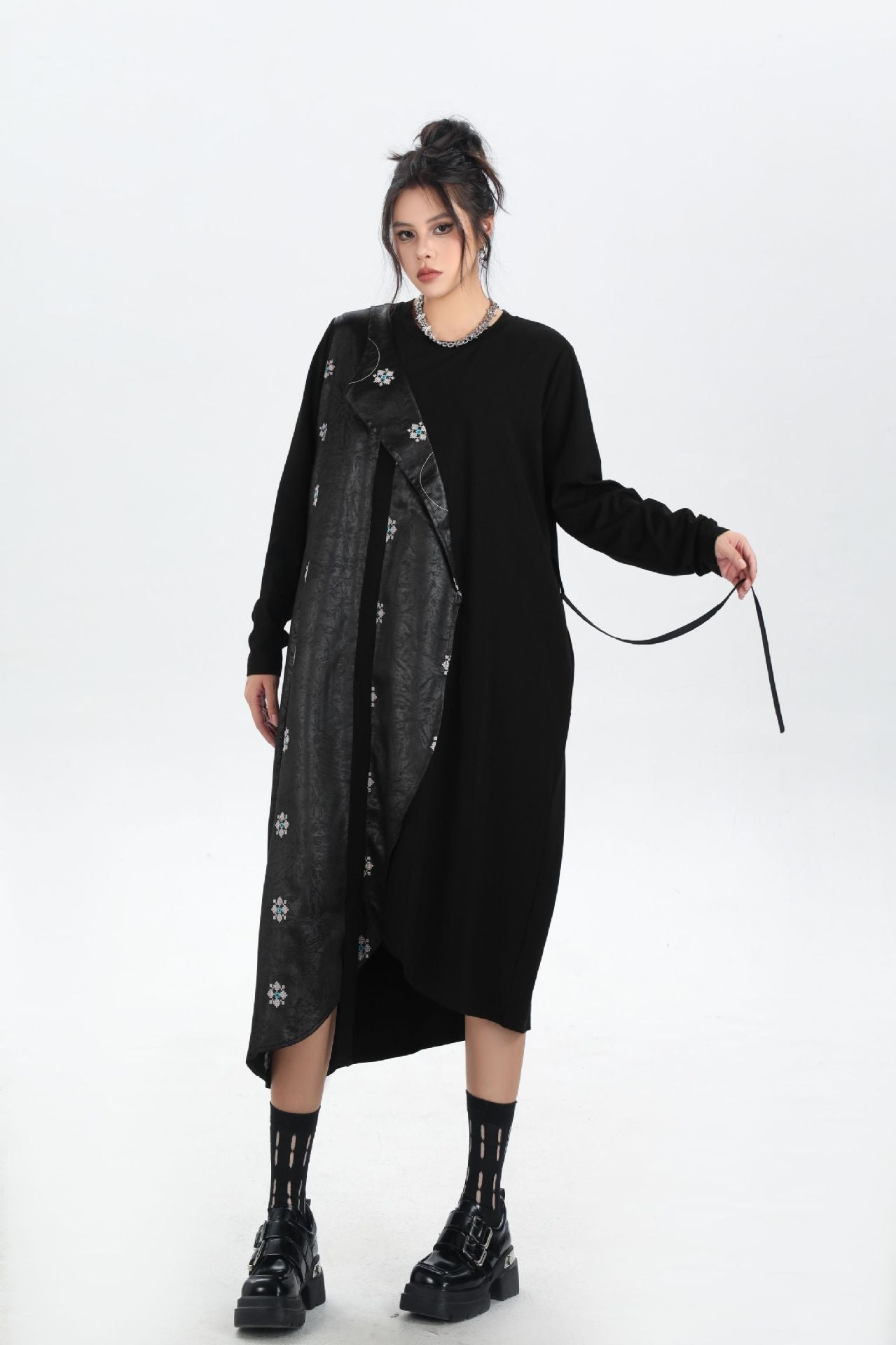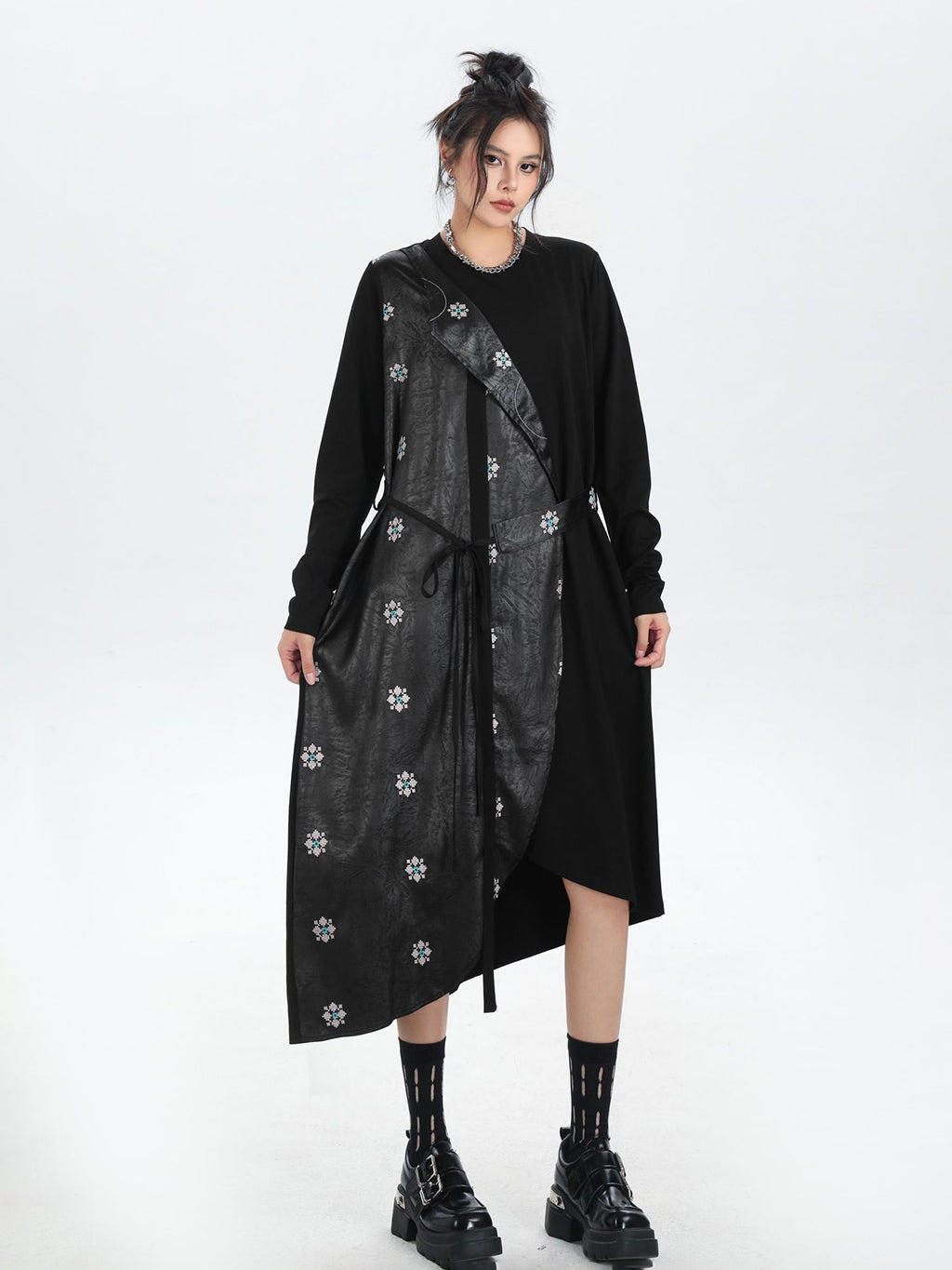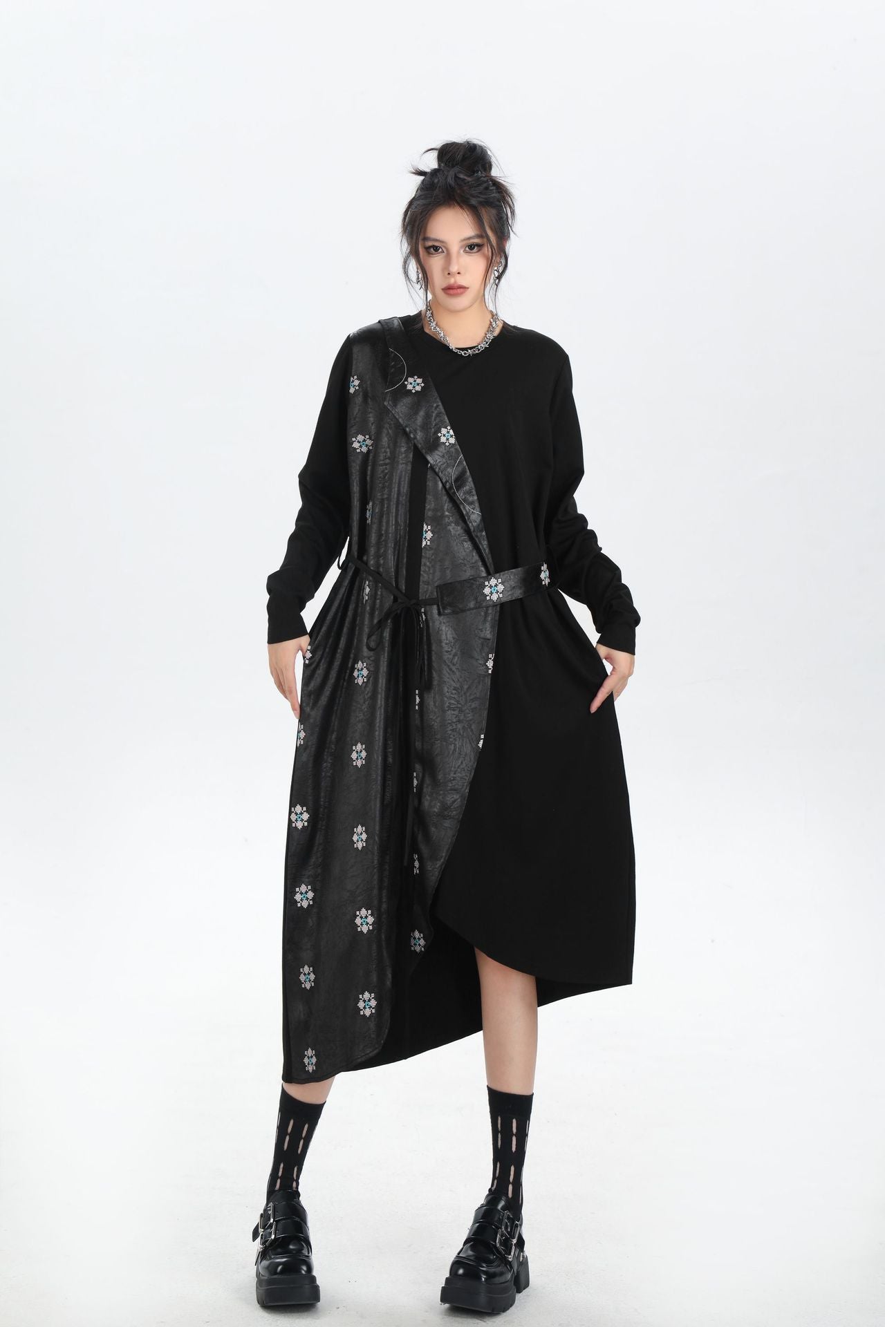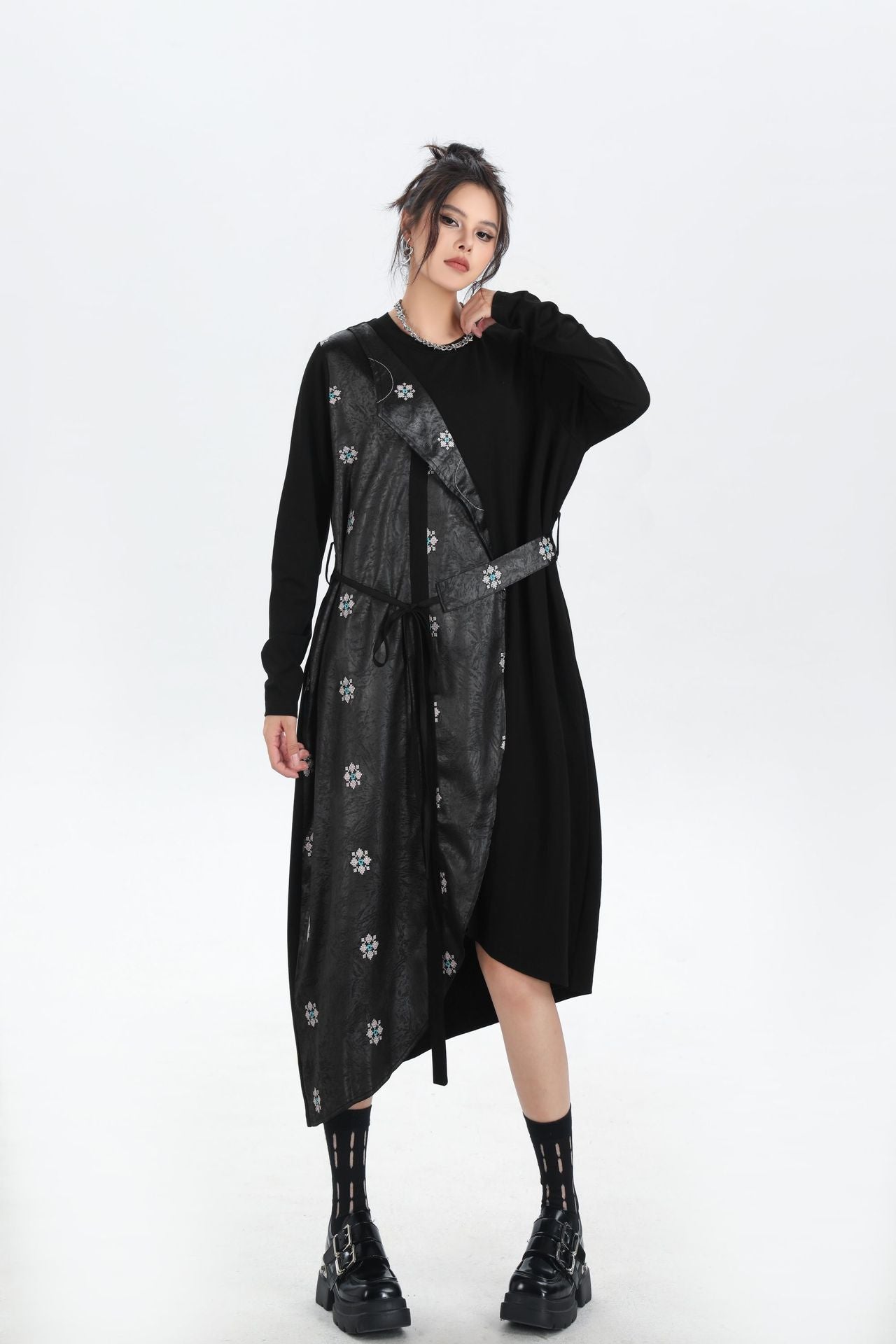 片側に施された艶のあるPU素材のパネルが特徴的なデザインドレス。パネルには小花を思わせる規則的な刺繍模様が施され、立体的な質感が全体に華やかさをプラス。ベースはブラックのカットソー素材で、ストンと落ちるロングシルエットが体のラインを拾わず、美しく着こなせる構造。アシンメトリックに垂れるフロントのデザインはドレープを強調し、洗練された印象を与える。バックにはシンプルなラインが施されており、全体のバランスも秀逸。