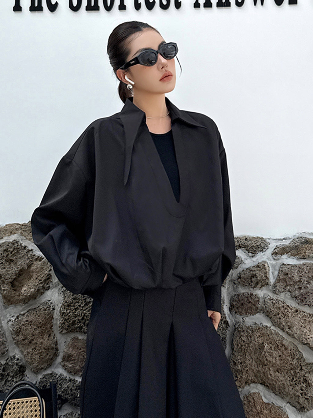 深く開いたVネックにシャープな襟を合わせ、洗練された印象を演出するトップス。肩を落としたドルマンスリーブが生み出すゆるやかなシルエットと、軽やかなドレープ感が特徴。やや光沢を帯びた生地が動きに合わせてニュアンスを変え、シックなカラーが全体を引き締める。ヒップラインまで届くゆったりとした着丈で、タックイン・アウトどちらのスタイルも楽しめるデザイン