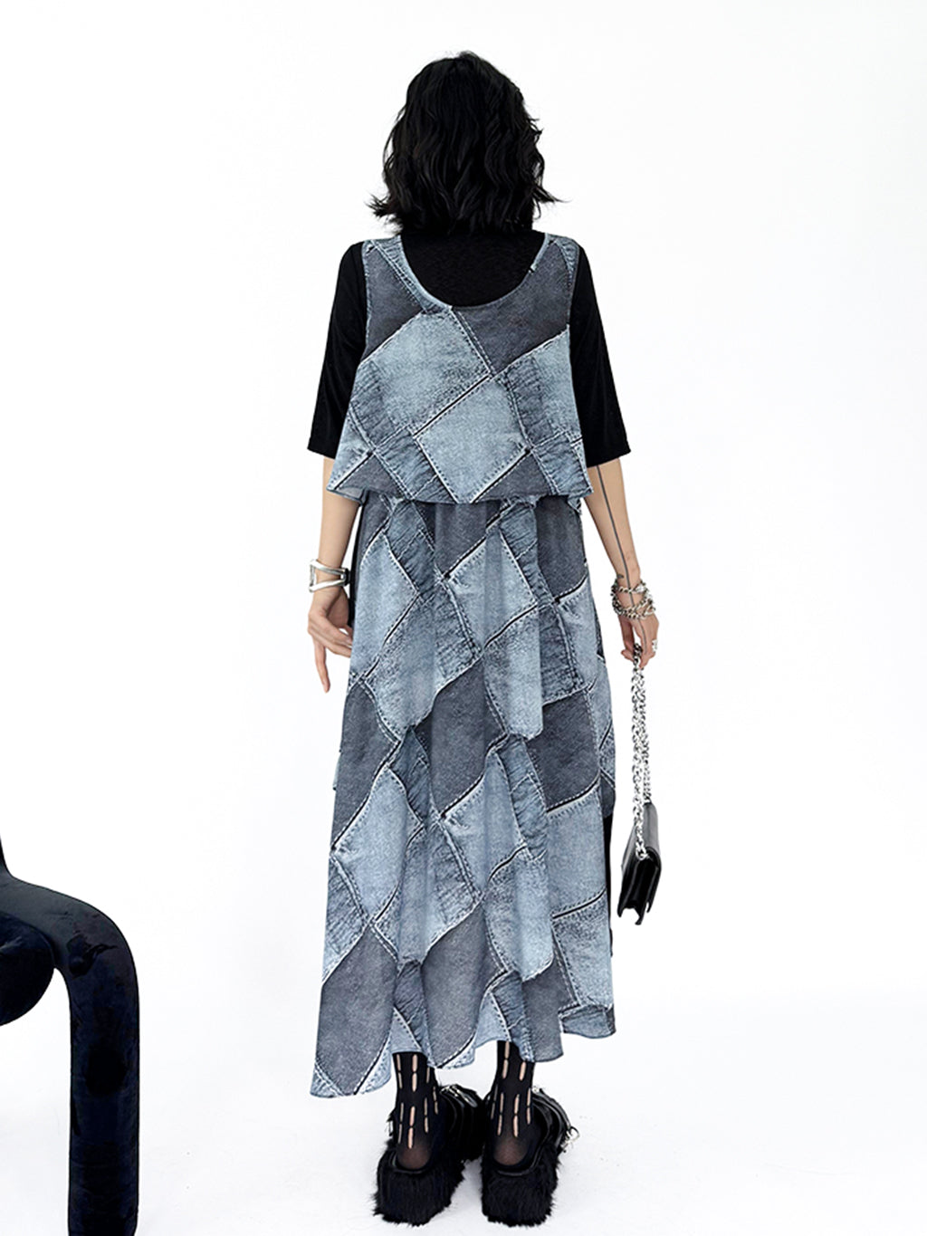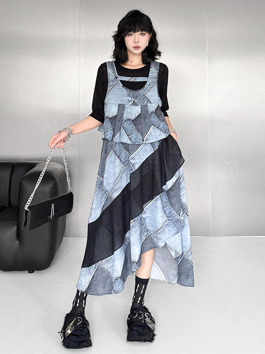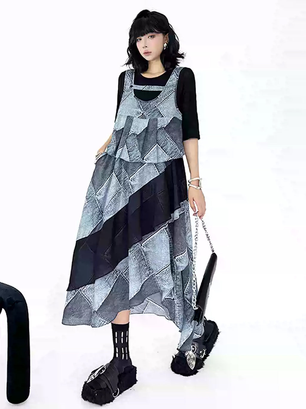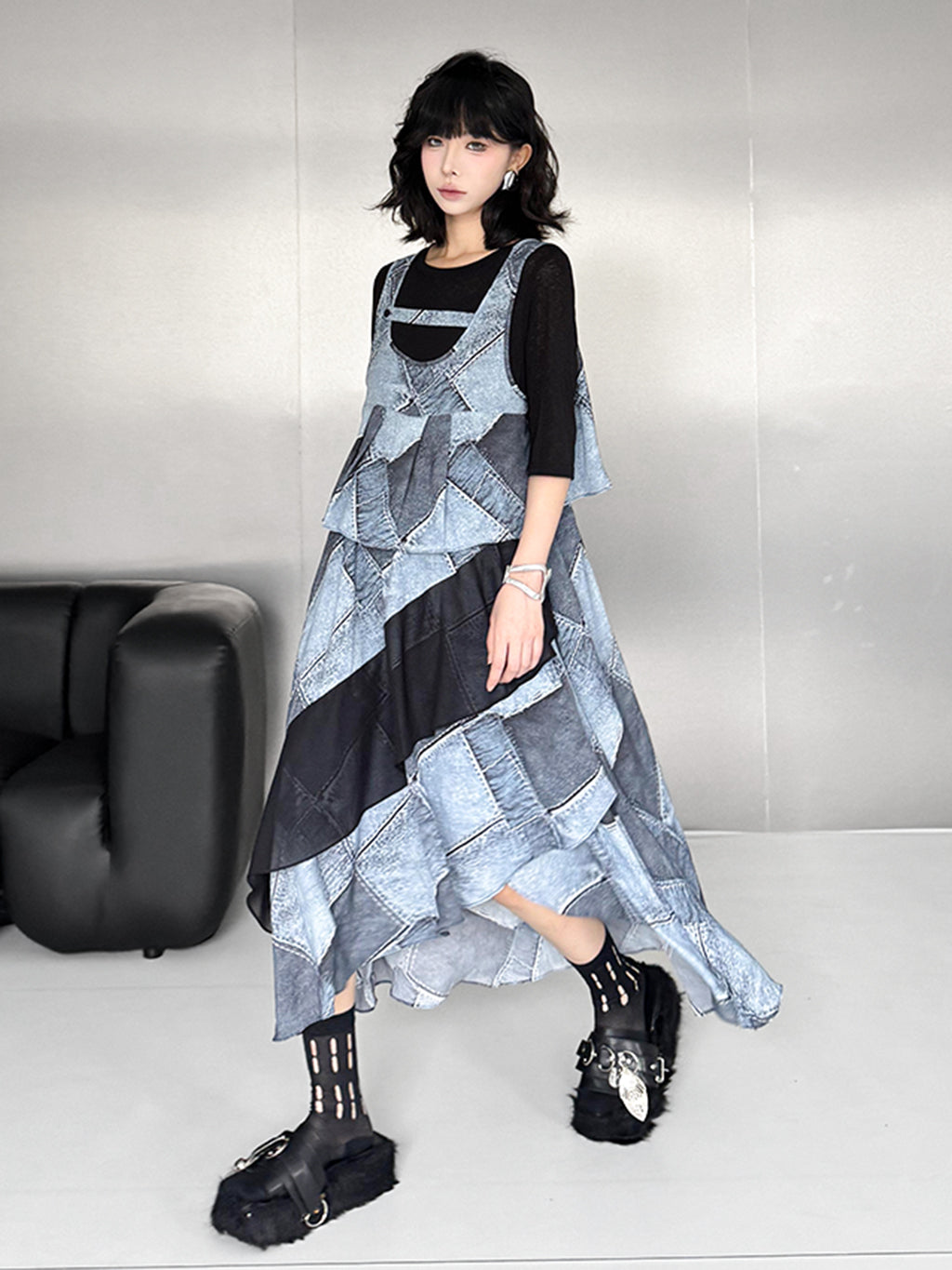 インディゴ調のパッチワーク柄が、洗練されたカジュアル感をまとわせる。