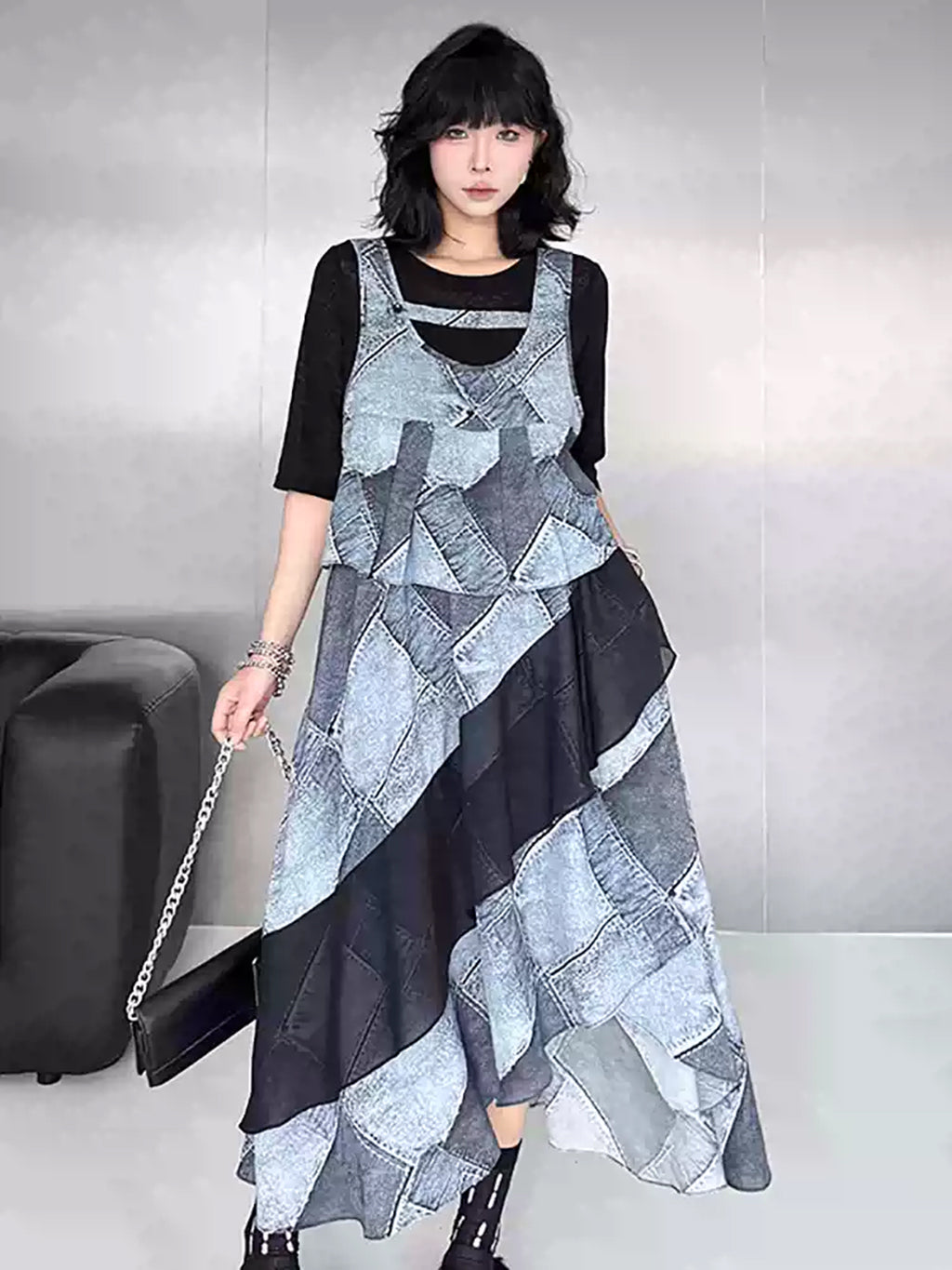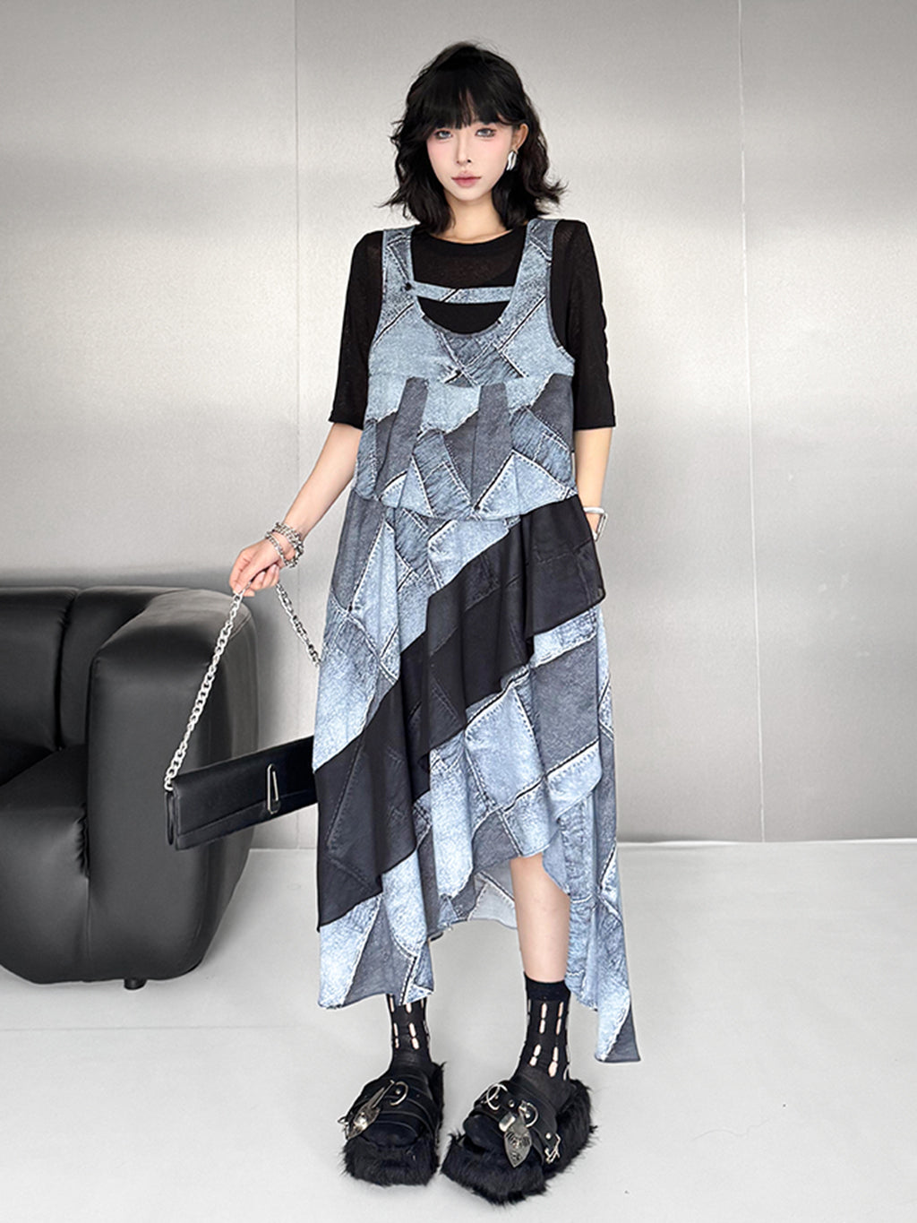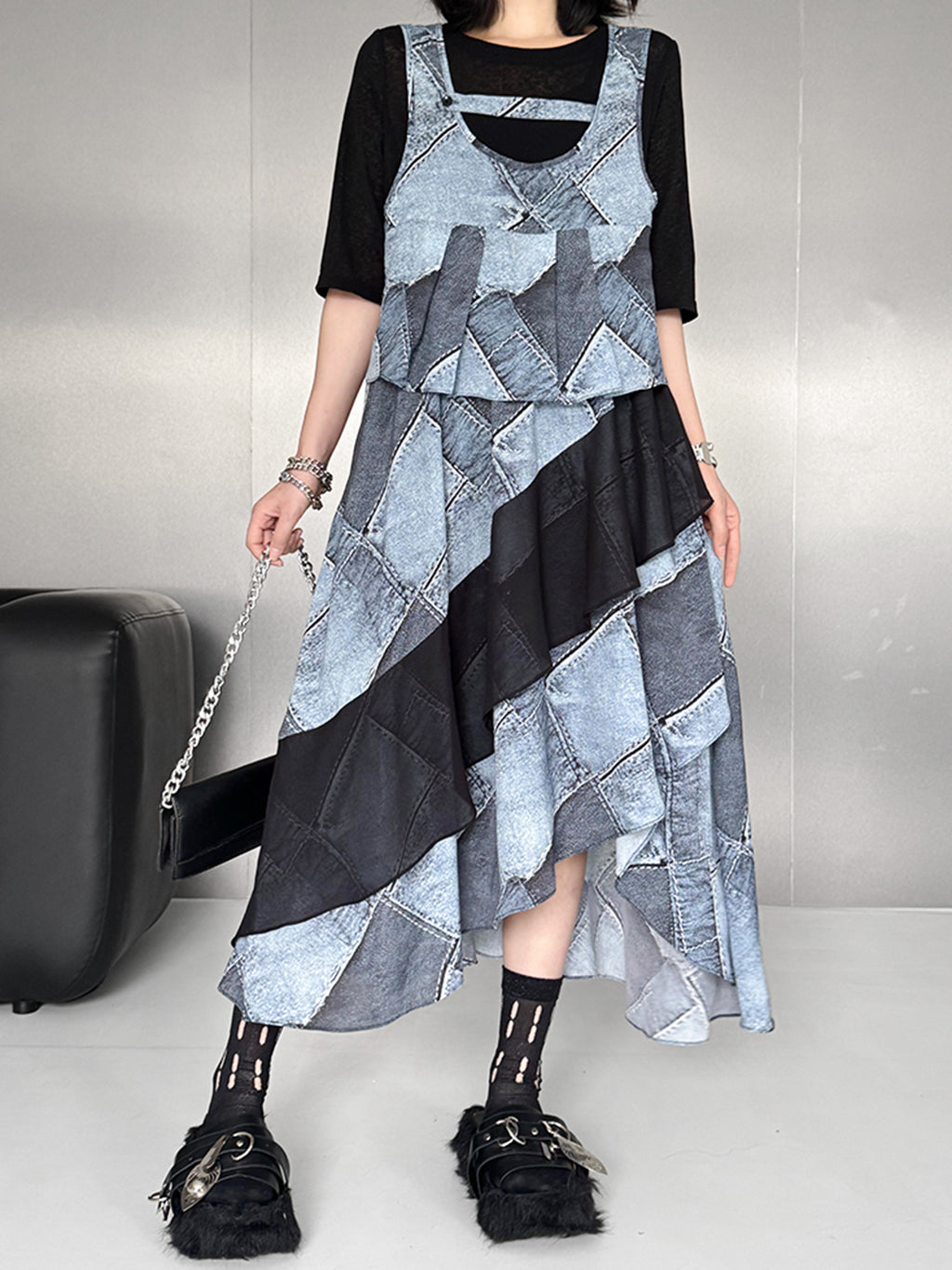 インディゴ調のパッチワーク柄が、洗練されたカジュアル感をまとわせる。