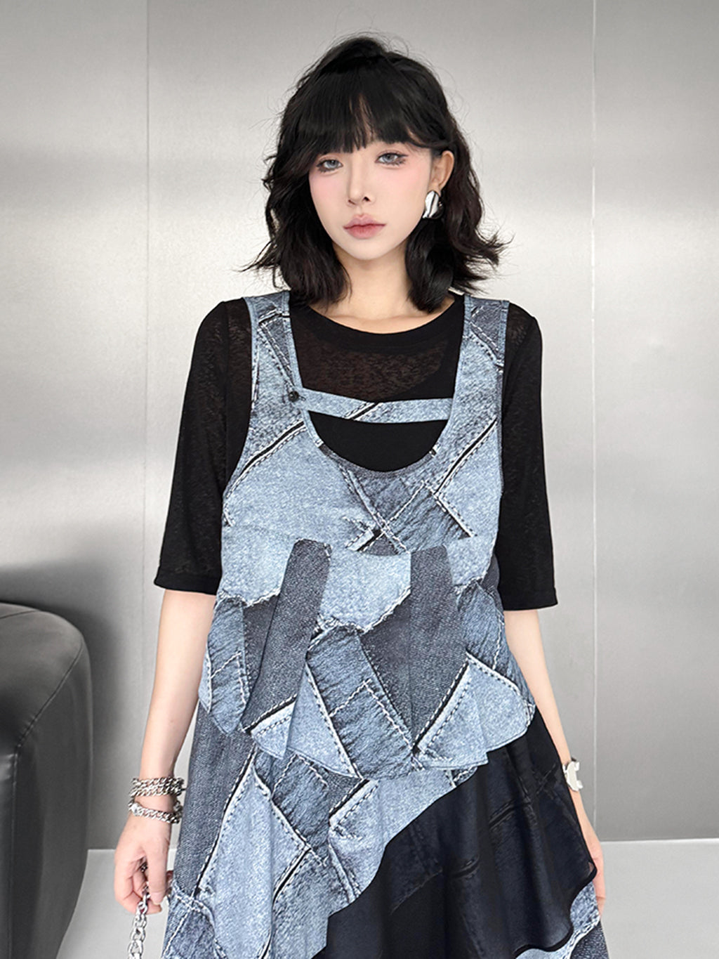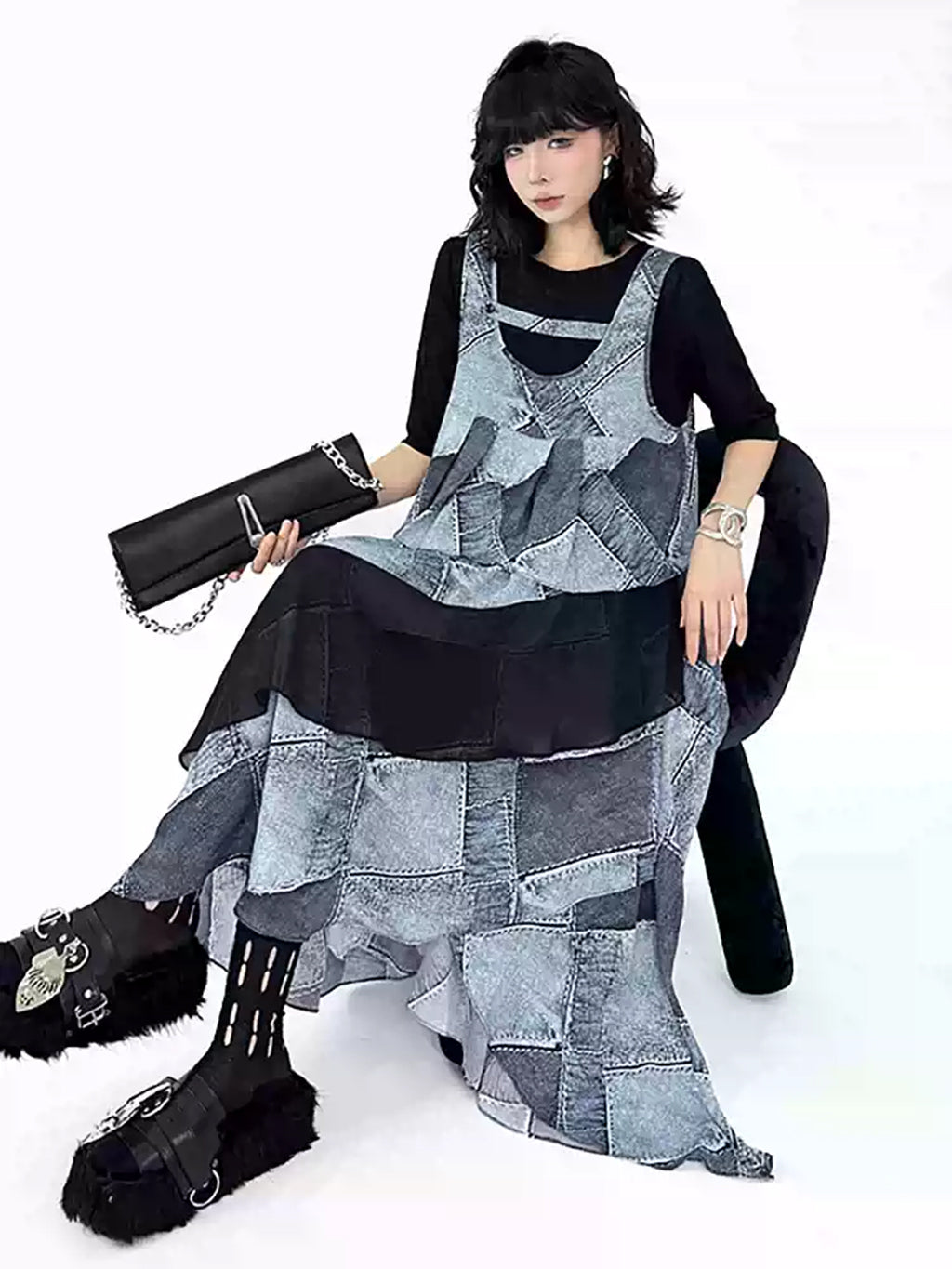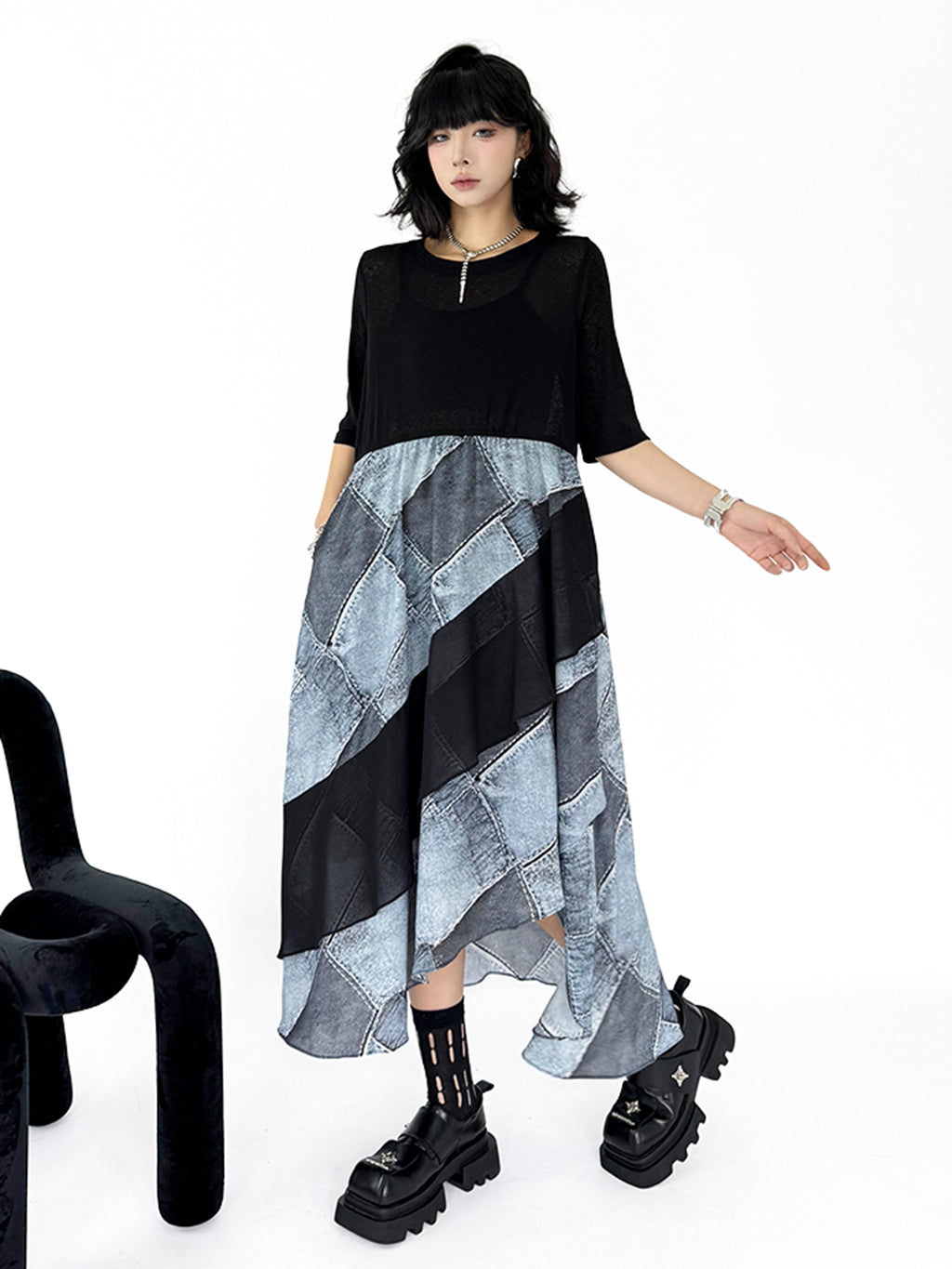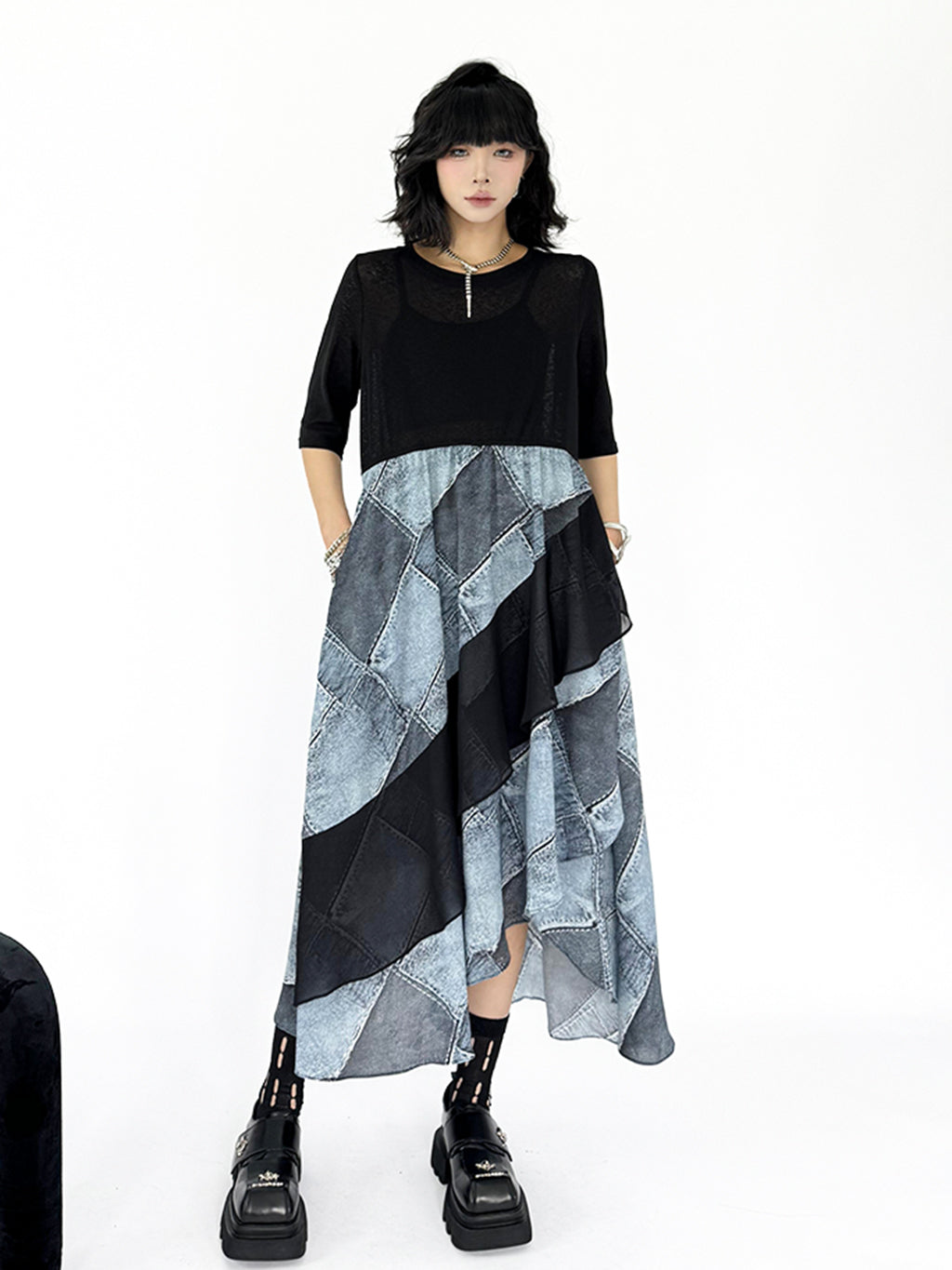 インディゴ調のパッチワーク柄が、洗練されたカジュアル感をまとわせる。