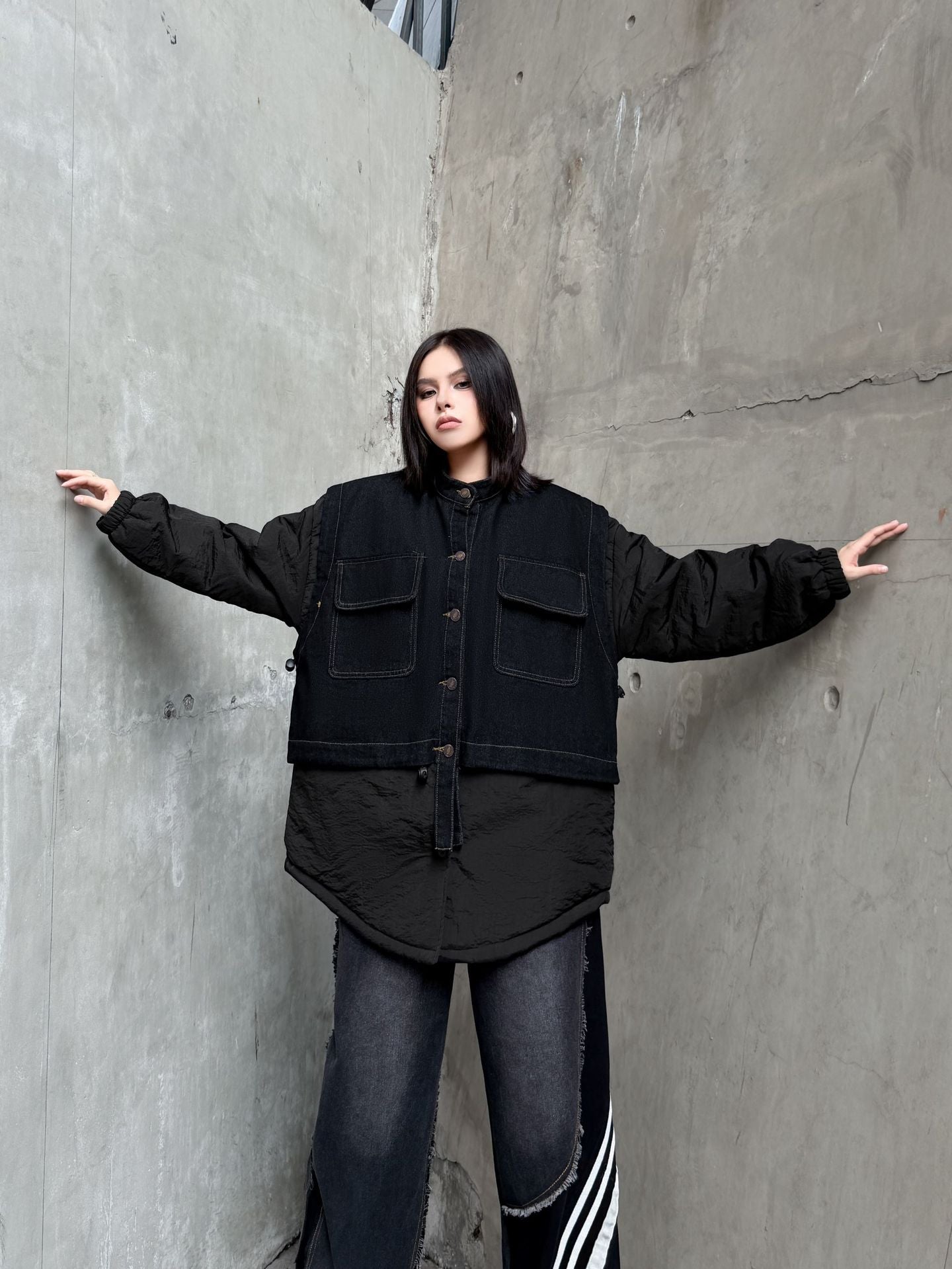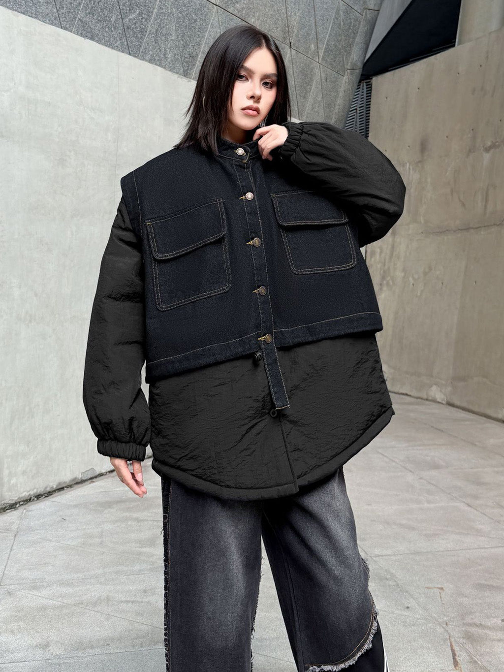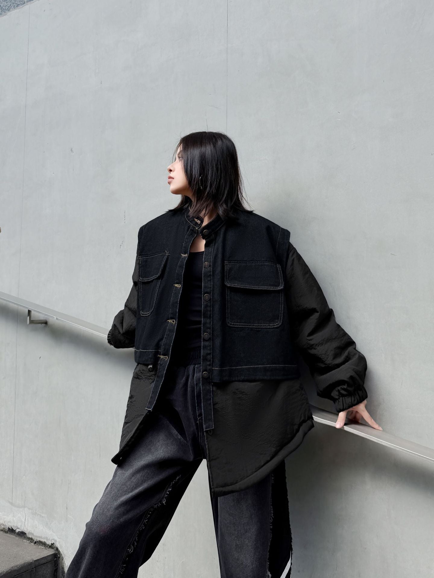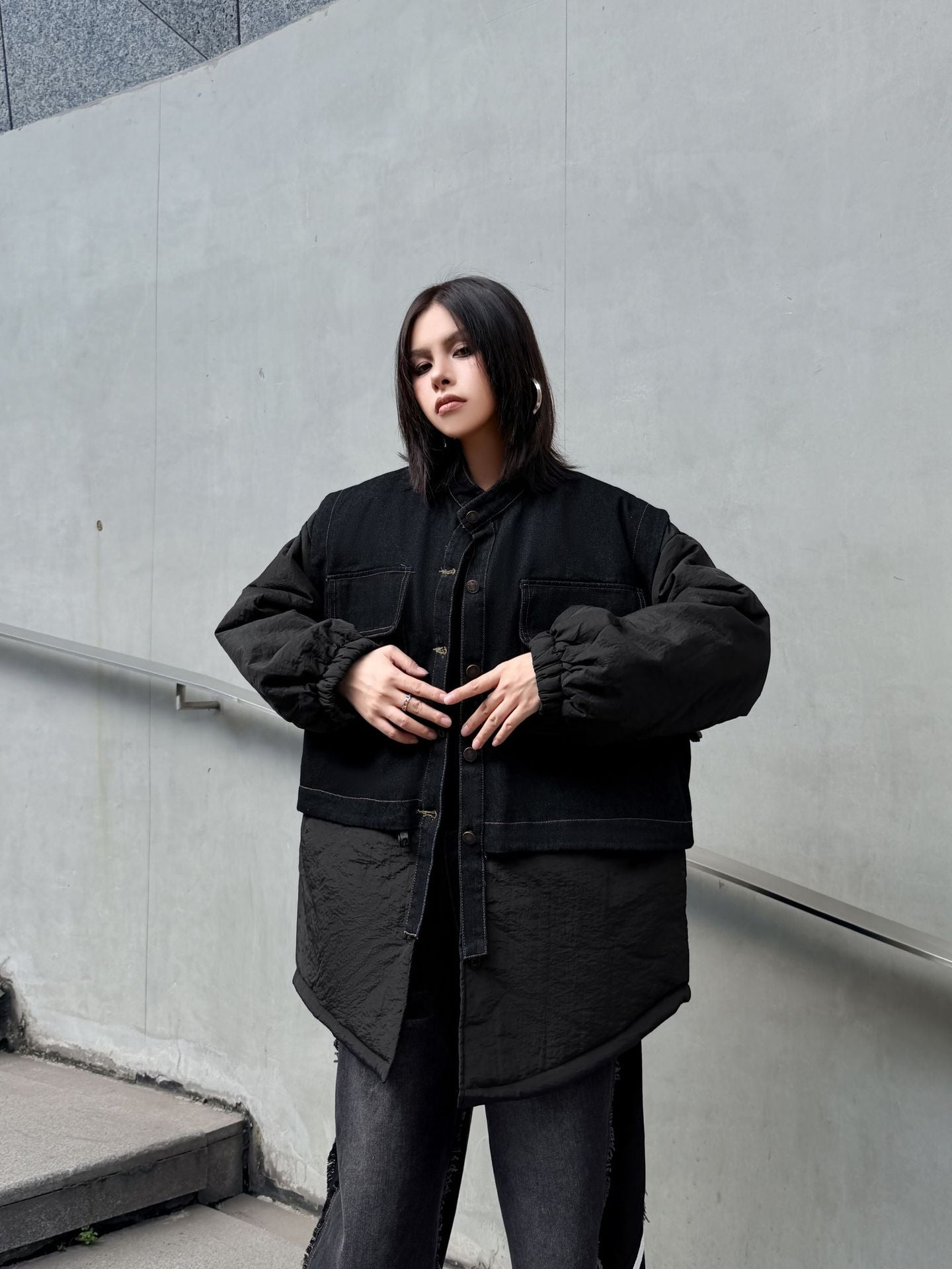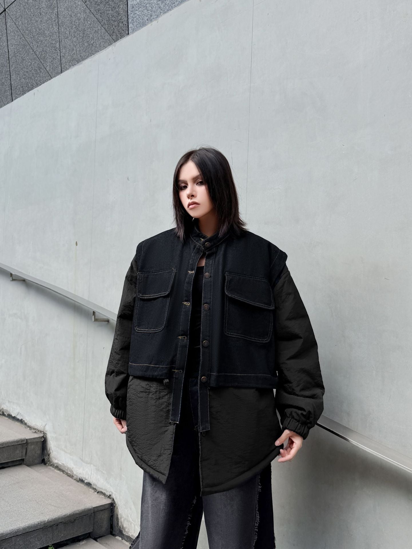 ウォッシュデニムとナイロンを組み合わせたオーバージャケット。上身頃はデニム素材をベースにしたワーク調のポケットデザイン、下部と袖は軽量なナイロン生地で構成され、異素材の質感差が際立つ。スタンドネックとドロップショルダーがモダンなシルエットを形成し、裾のラウンドカットが自然な動きを生む。全体にゆとりのあるフォルムながら、フロントのステッチラインが構築的な印象を引き立てる。