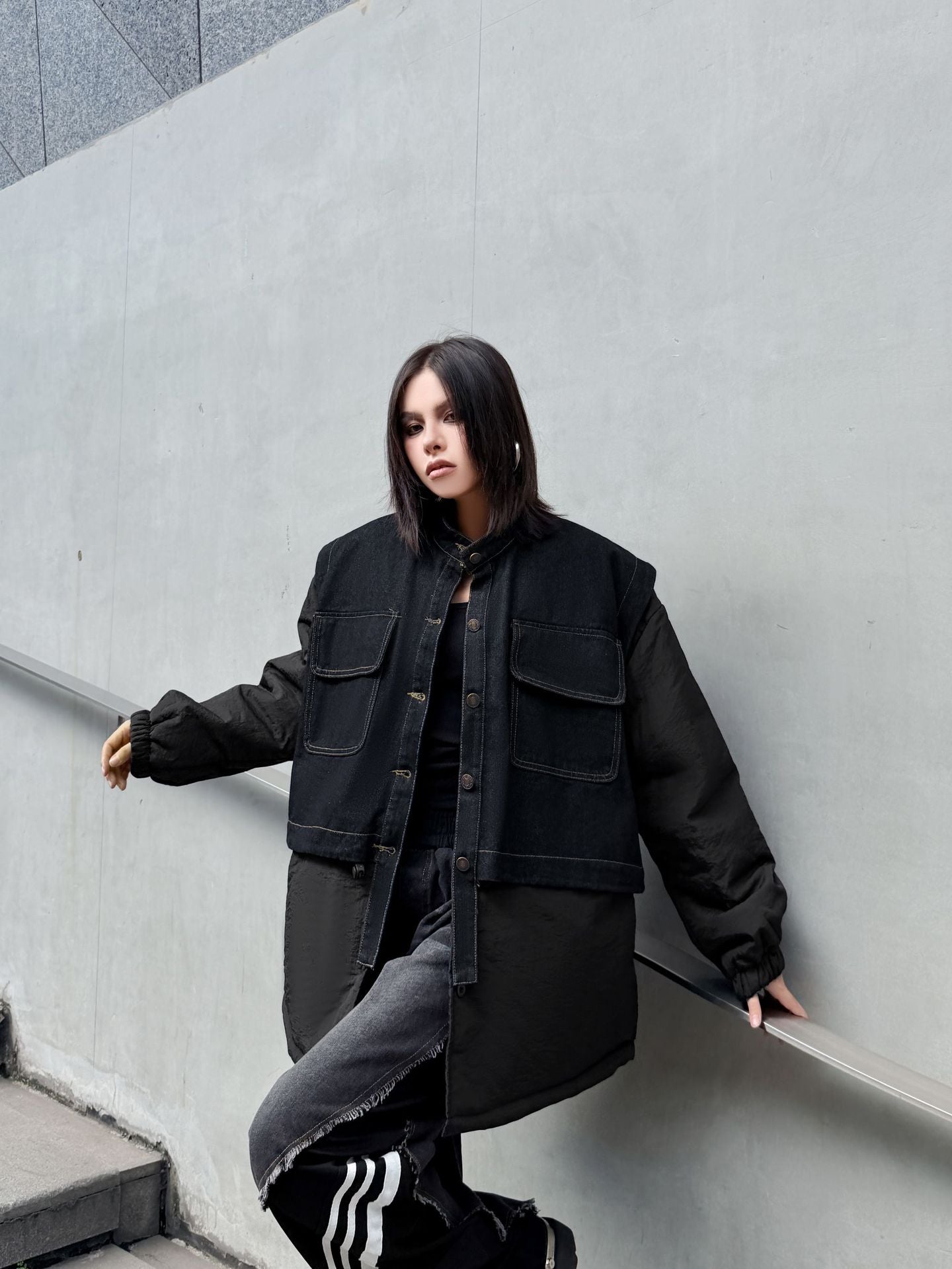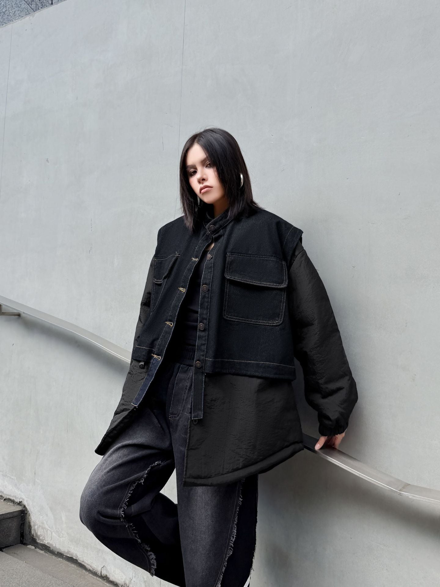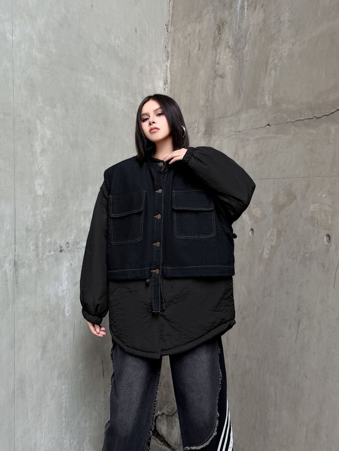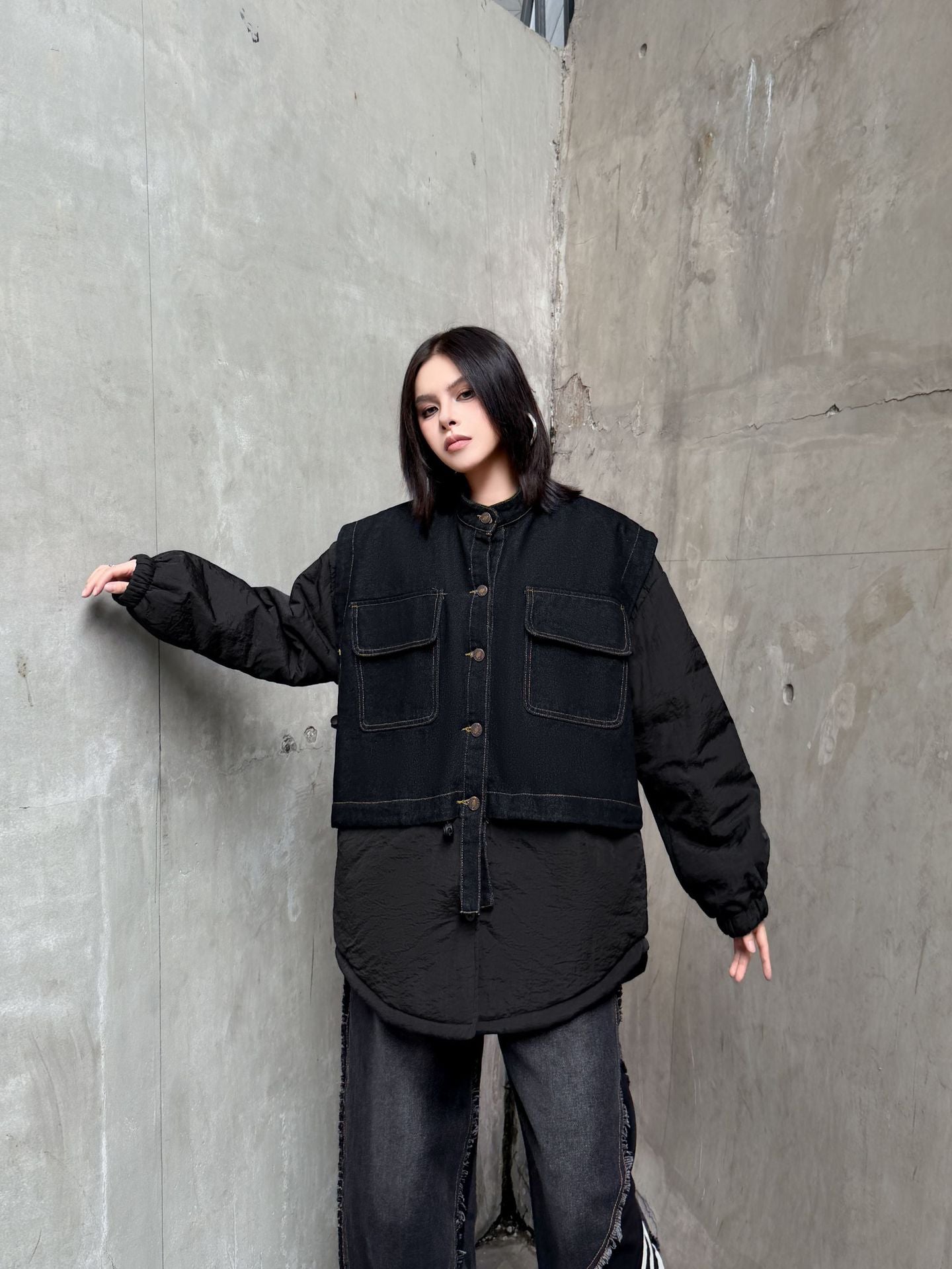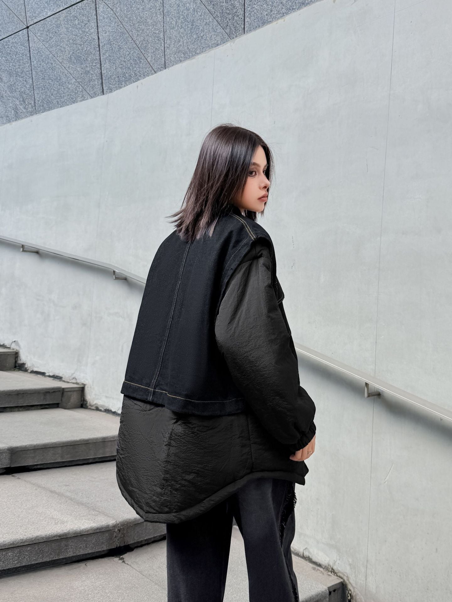 ウォッシュデニムとナイロンを組み合わせたオーバージャケット。上身頃はデニム素材をベースにしたワーク調のポケットデザイン、下部と袖は軽量なナイロン生地で構成され、異素材の質感差が際立つ。スタンドネックとドロップショルダーがモダンなシルエットを形成し、裾のラウンドカットが自然な動きを生む。全体にゆとりのあるフォルムながら、フロントのステッチラインが構築的な印象を引き立てる。