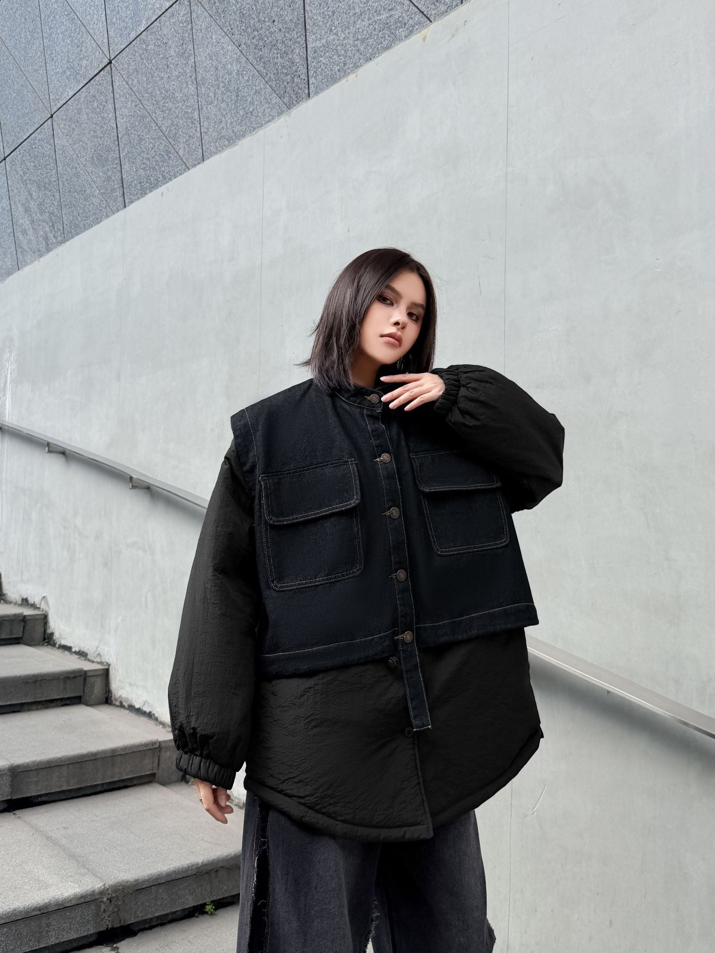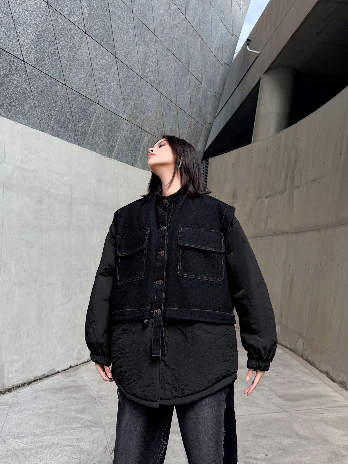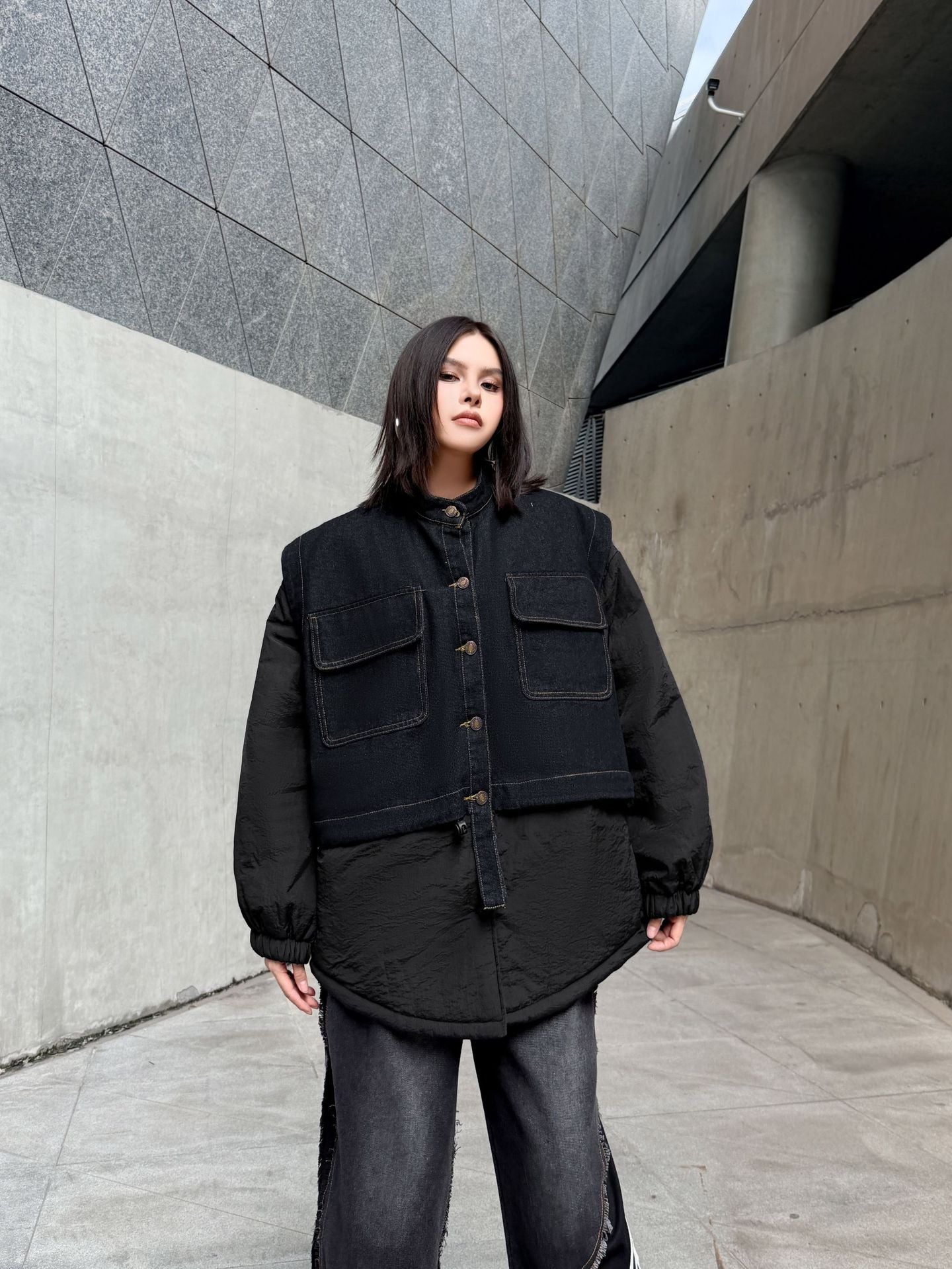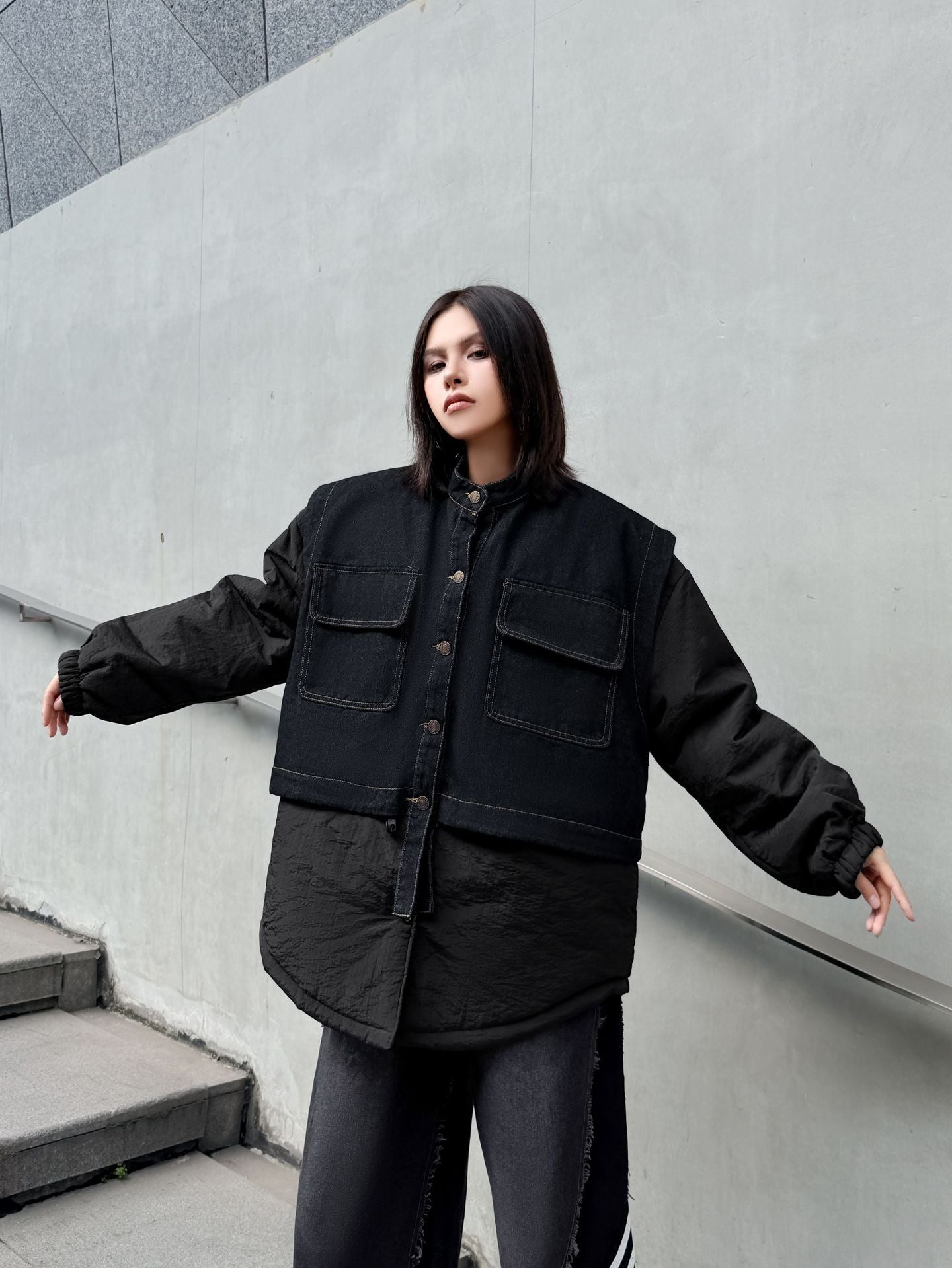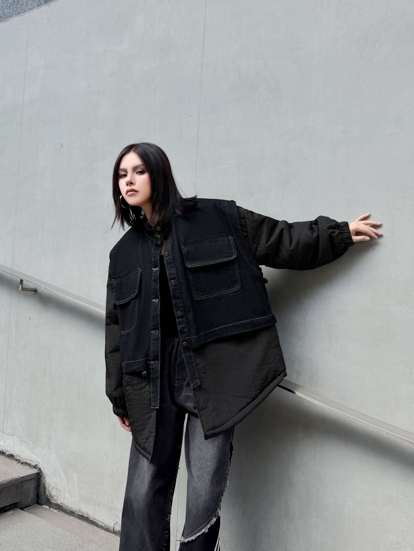 ウォッシュデニムとナイロンを組み合わせたオーバージャケット。上身頃はデニム素材をベースにしたワーク調のポケットデザイン、下部と袖は軽量なナイロン生地で構成され、異素材の質感差が際立つ。スタンドネックとドロップショルダーがモダンなシルエットを形成し、裾のラウンドカットが自然な動きを生む。全体にゆとりのあるフォルムながら、フロントのステッチラインが構築的な印象を引き立てる。