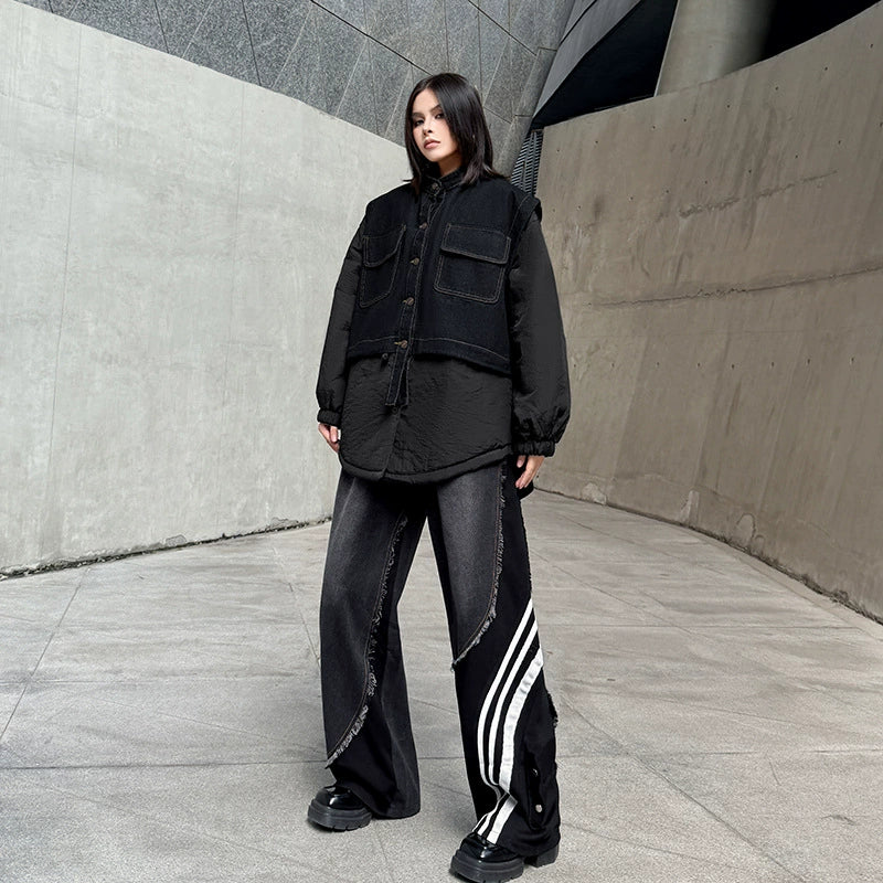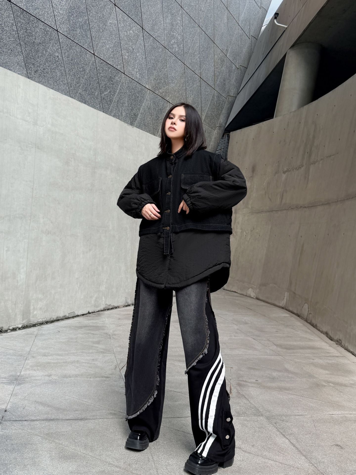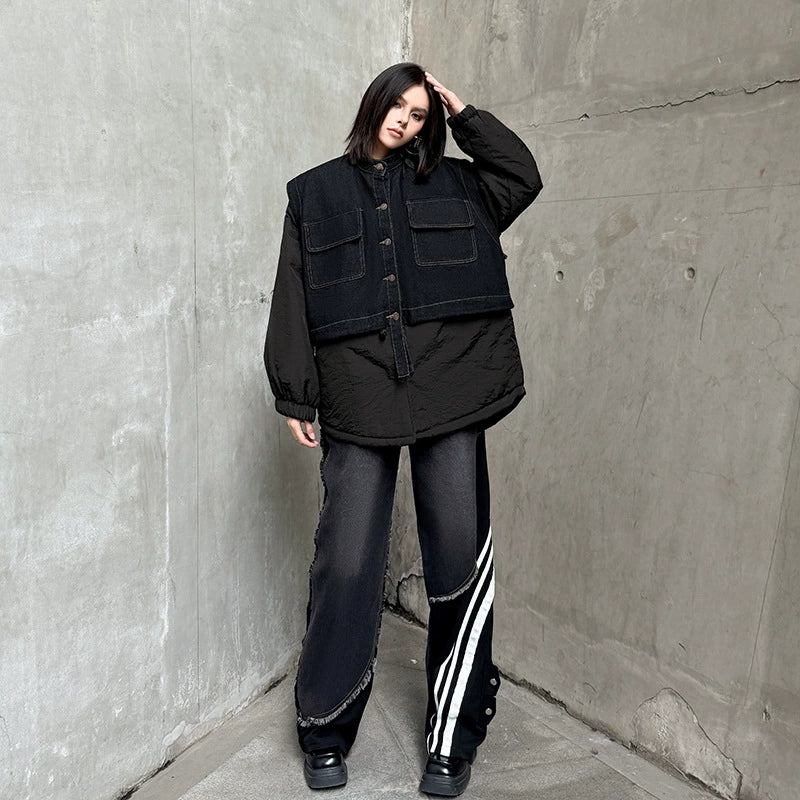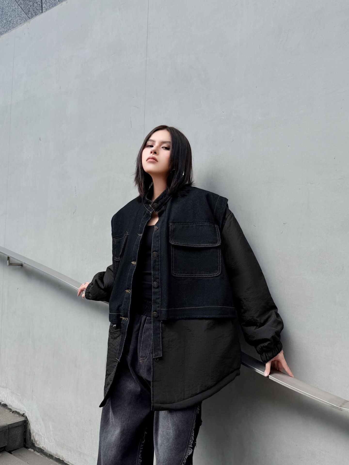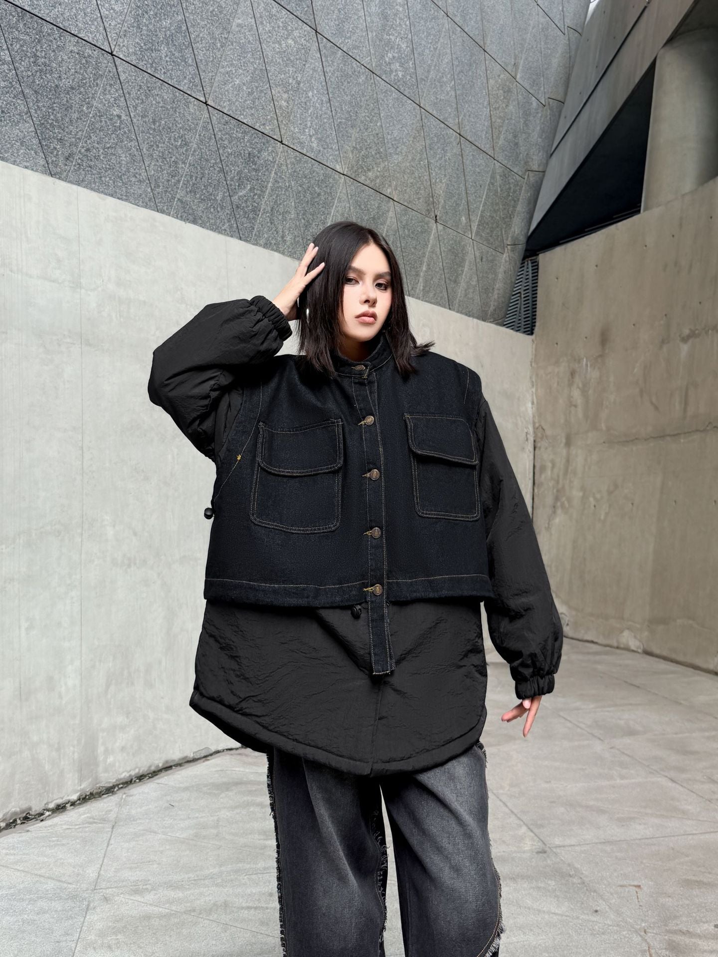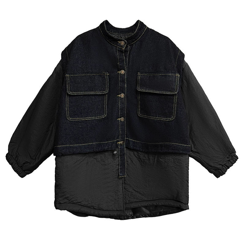 ウォッシュデニムとナイロンを組み合わせたオーバージャケット。上身頃はデニム素材をベースにしたワーク調のポケットデザイン、下部と袖は軽量なナイロン生地で構成され、異素材の質感差が際立つ。スタンドネックとドロップショルダーがモダンなシルエットを形成し、裾のラウンドカットが自然な動きを生む。全体にゆとりのあるフォルムながら、フロントのステッチラインが構築的な印象を引き立てる。