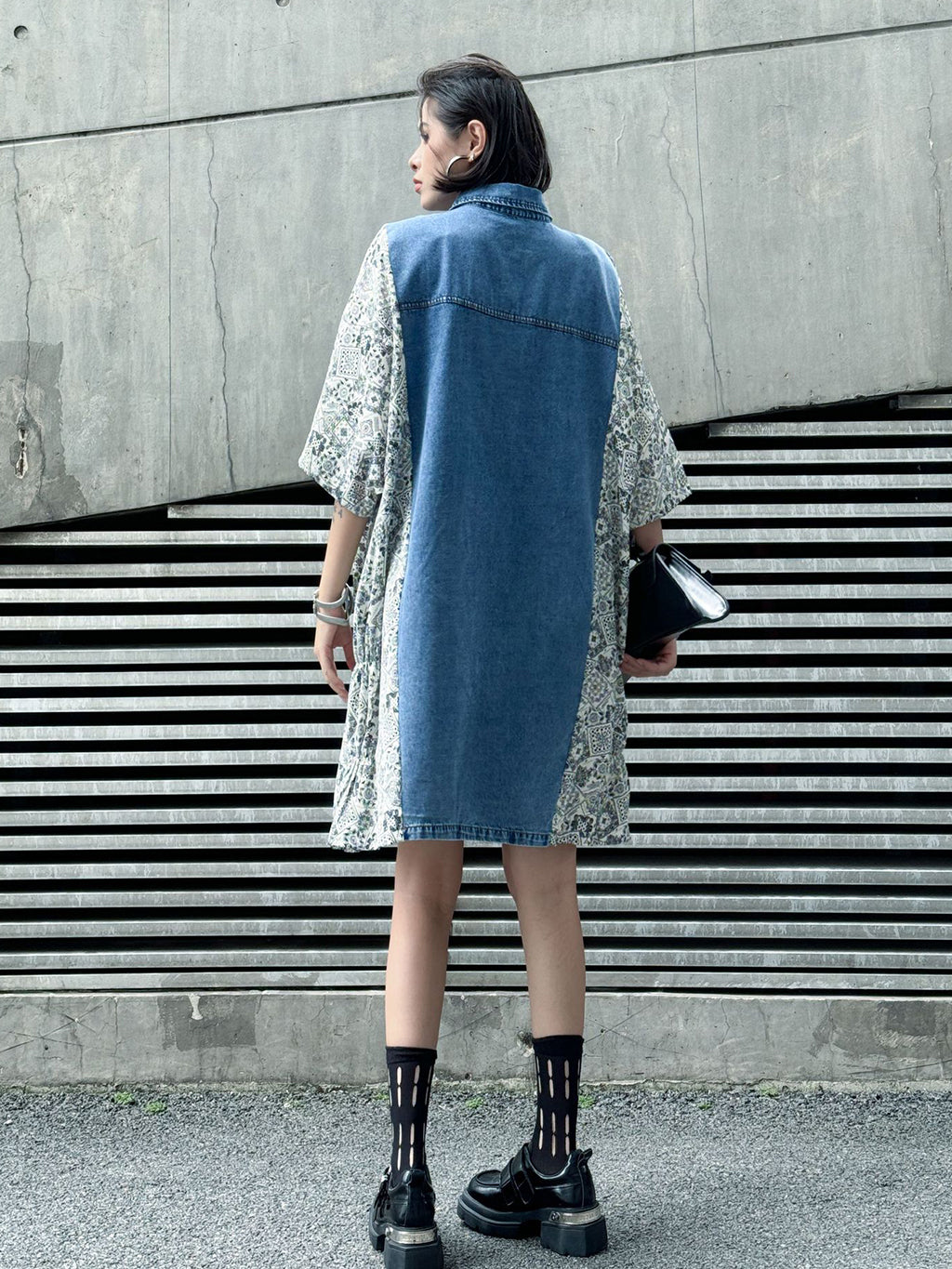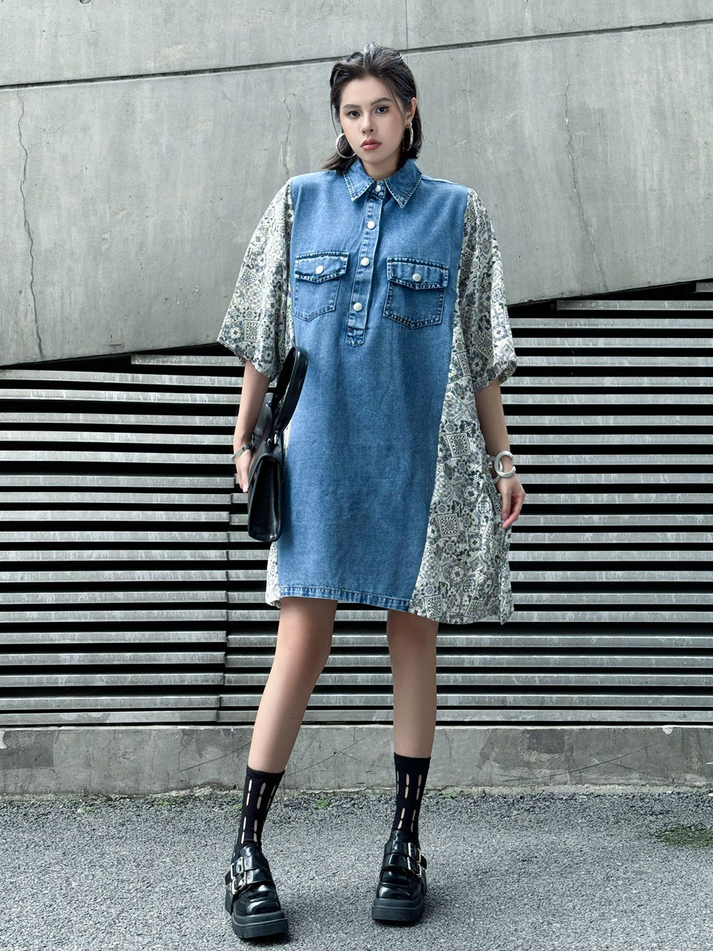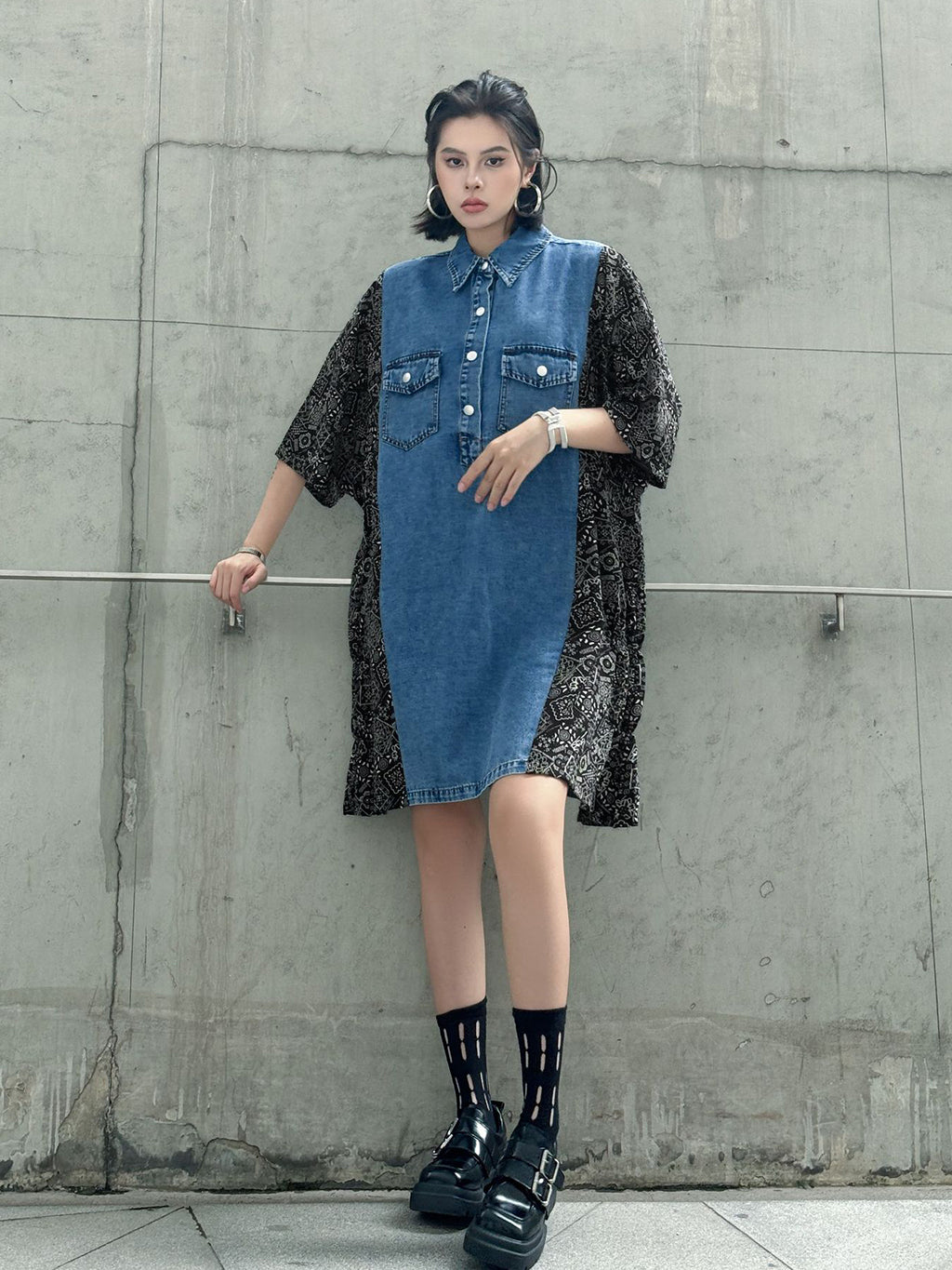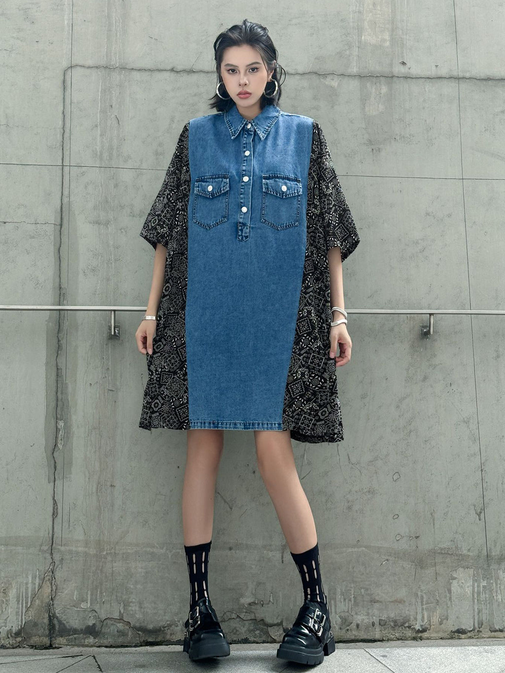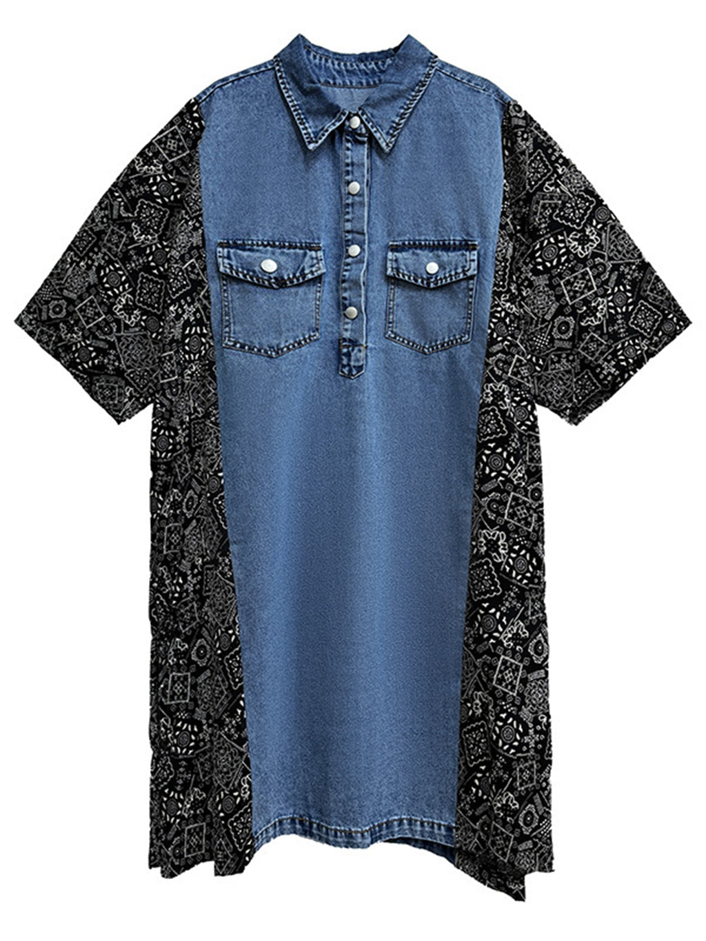 ヴィンテージ感漂うウォッシュデニムとオリエンタルな総柄ファブリックを組み合わせた、リラックス感のあるシャツドレス。肩から袖にかけての切り替えが印象的で、ゆったりとしたシルエットがこなれた雰囲気を演出。胸元のフラップポケットや前立てボタンがアクセントとなり、コーディネートの主軸として存在感を放つ一着。スニーカーからブーツまで幅広いスタイリングに対応。
