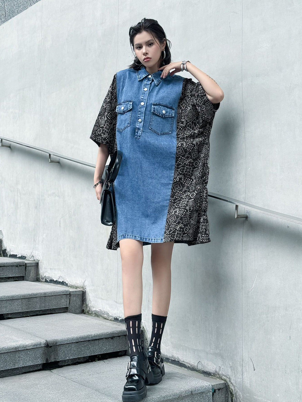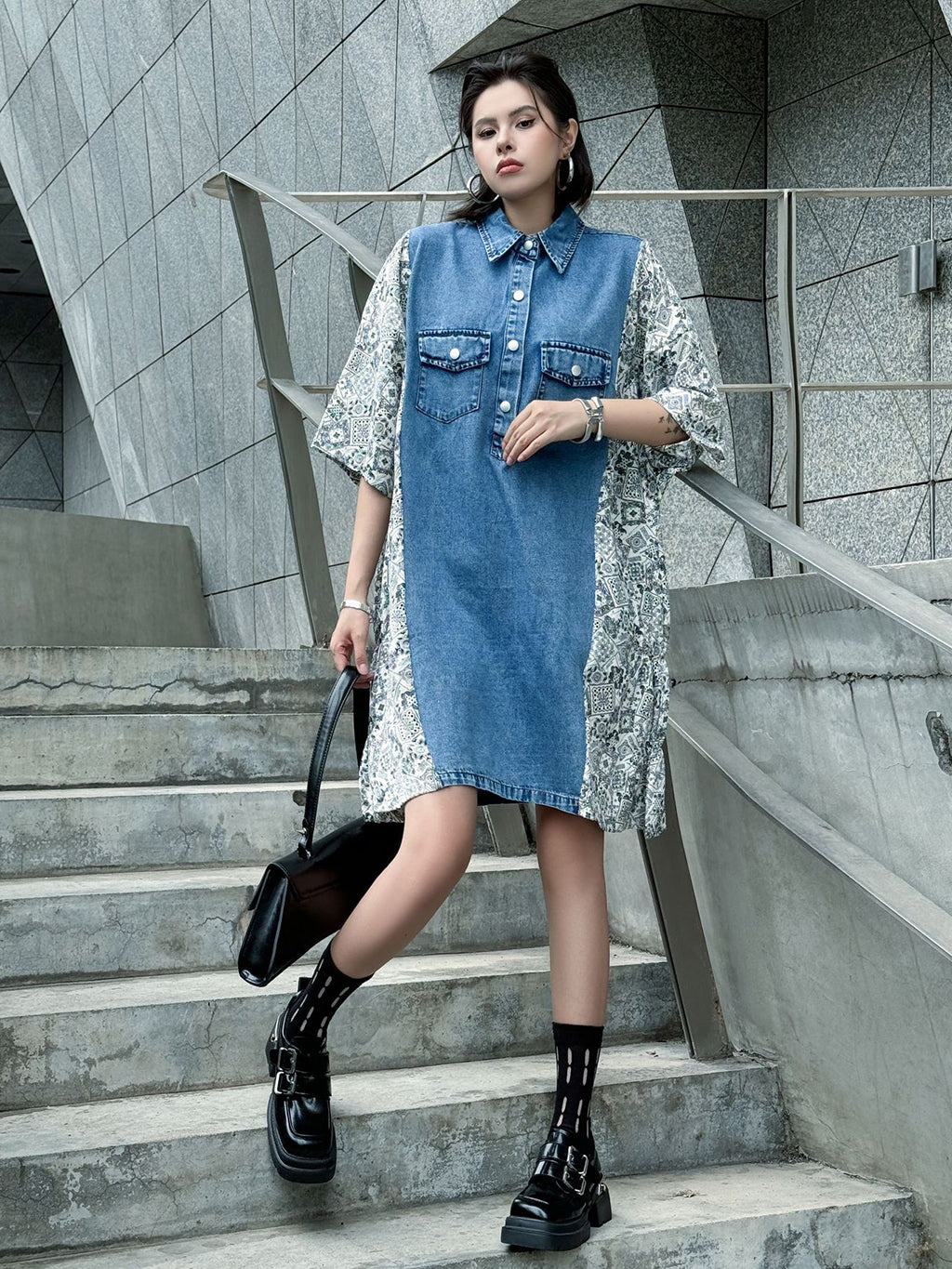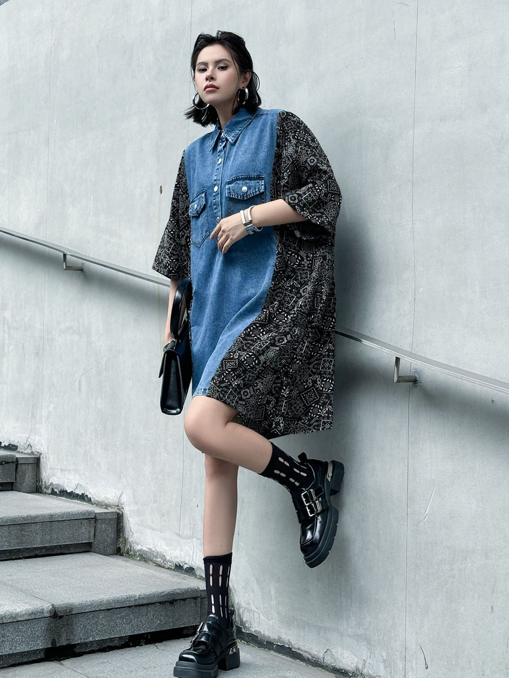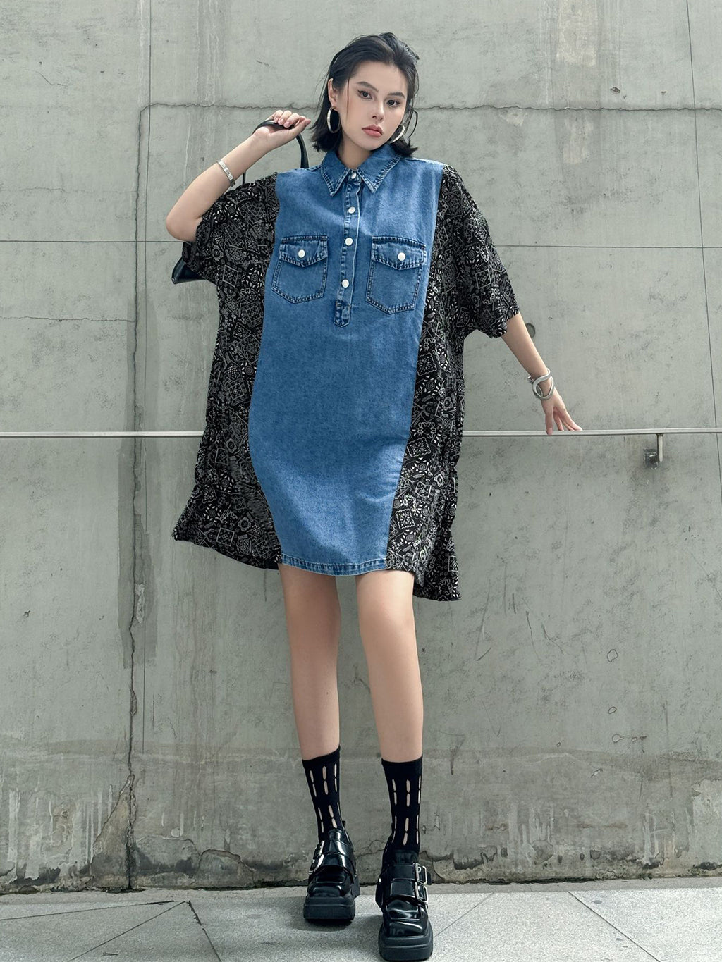 ヴィンテージ感漂うウォッシュデニムとオリエンタルな総柄ファブリックを組み合わせた、リラックス感のあるシャツドレス。肩から袖にかけての切り替えが印象的で、ゆったりとしたシルエットがこなれた雰囲気を演出。胸元のフラップポケットや前立てボタンがアクセントとなり、コーディネートの主軸として存在感を放つ一着。スニーカーからブーツまで幅広いスタイリングに対応。