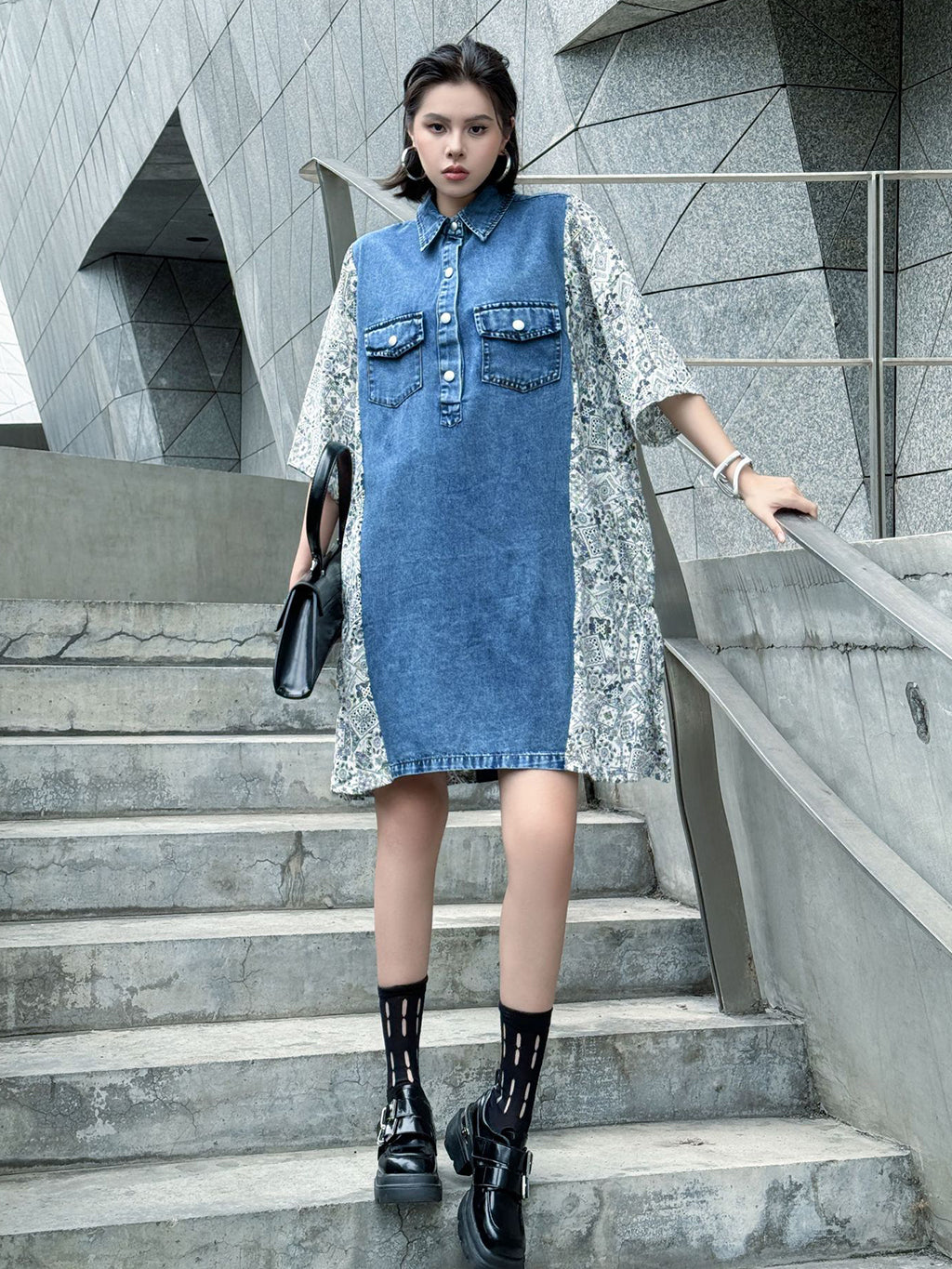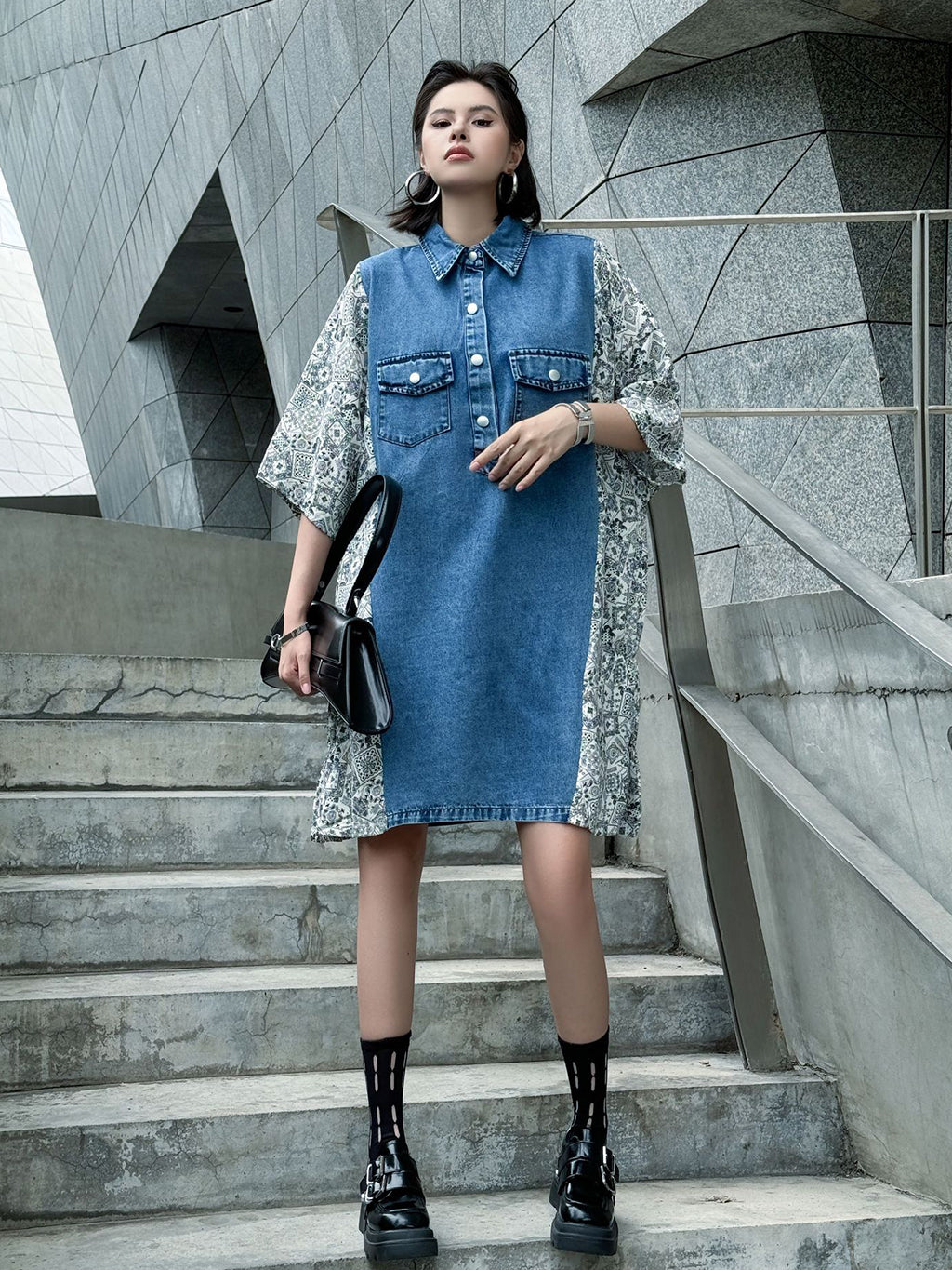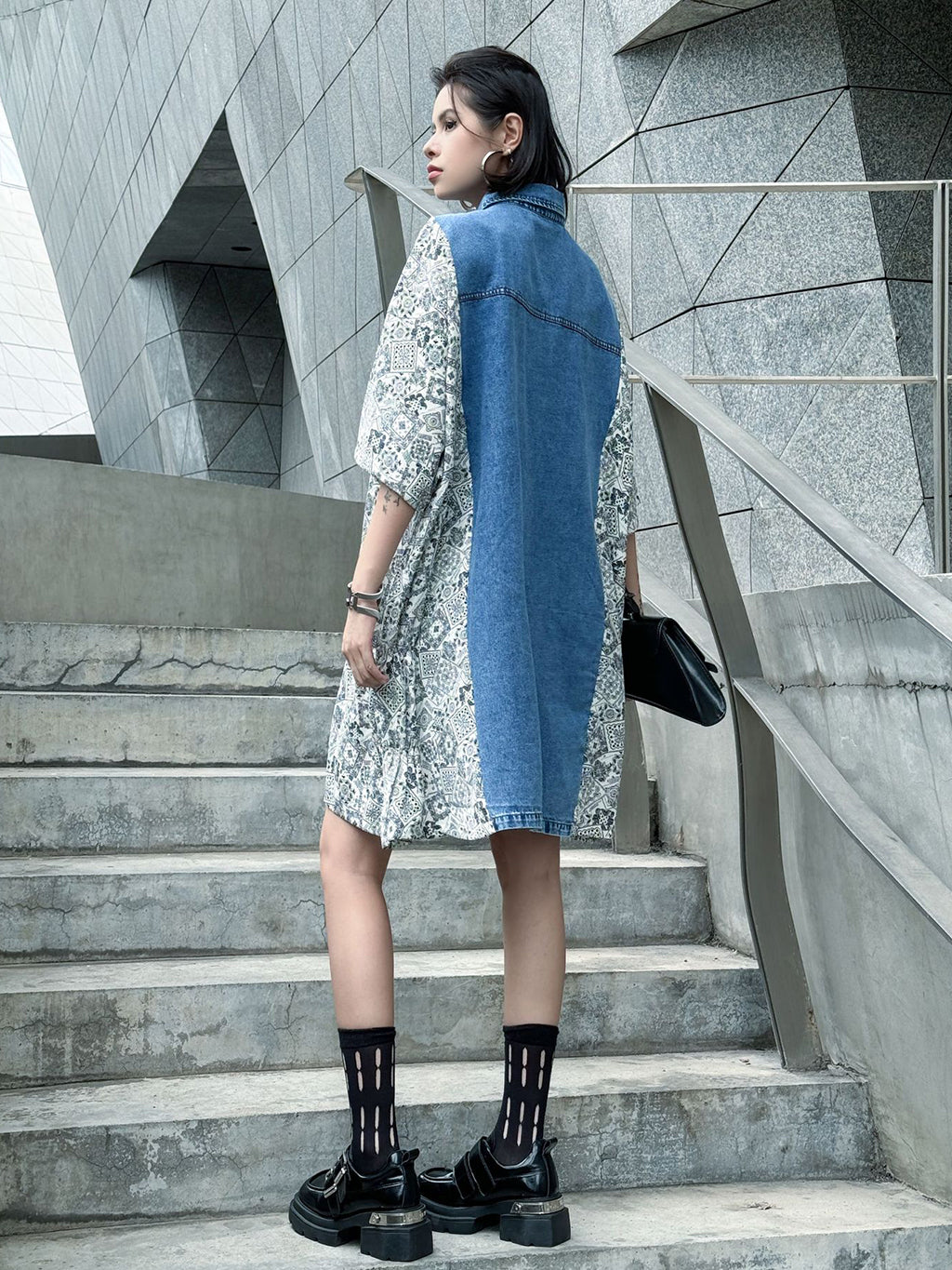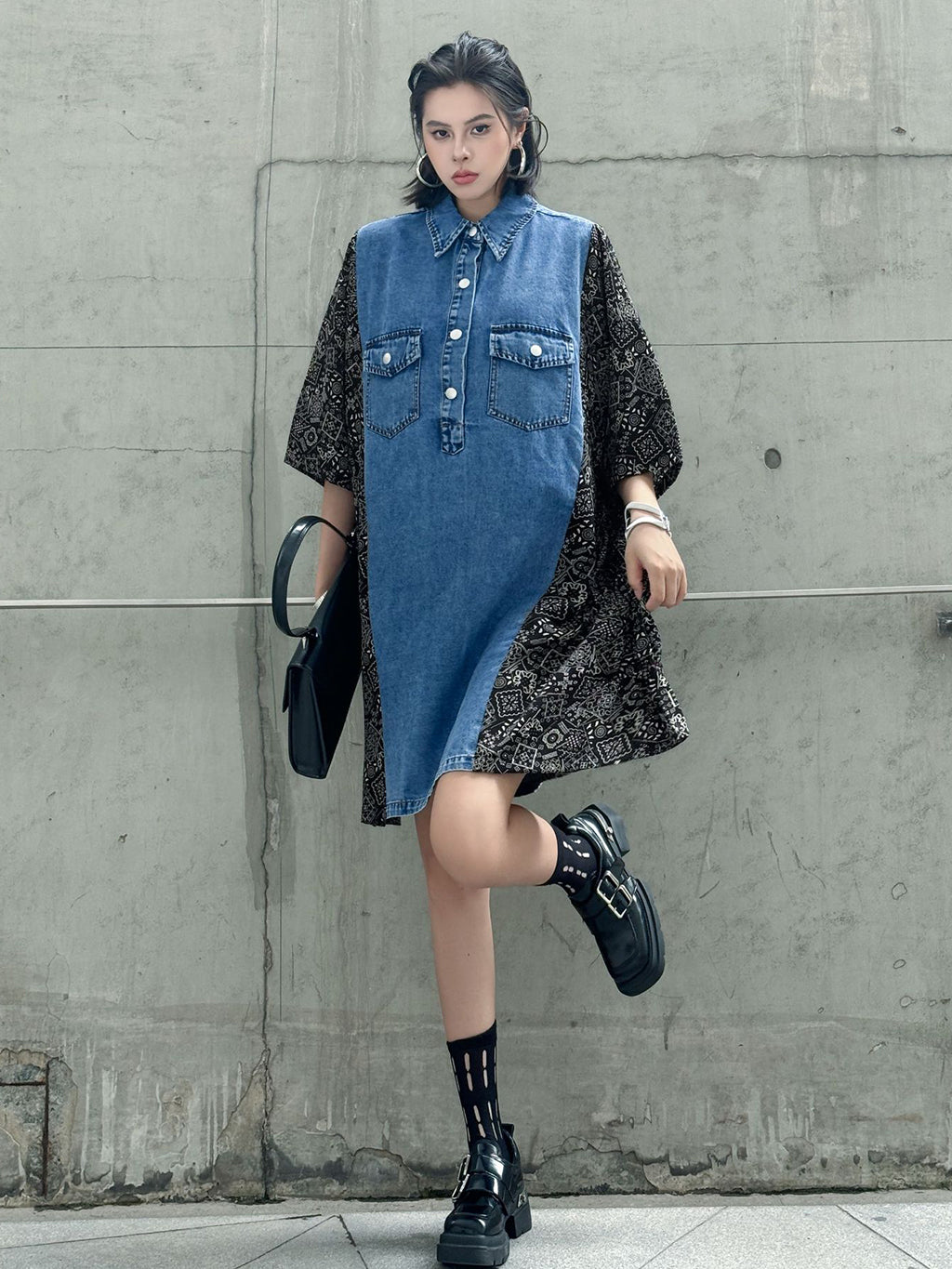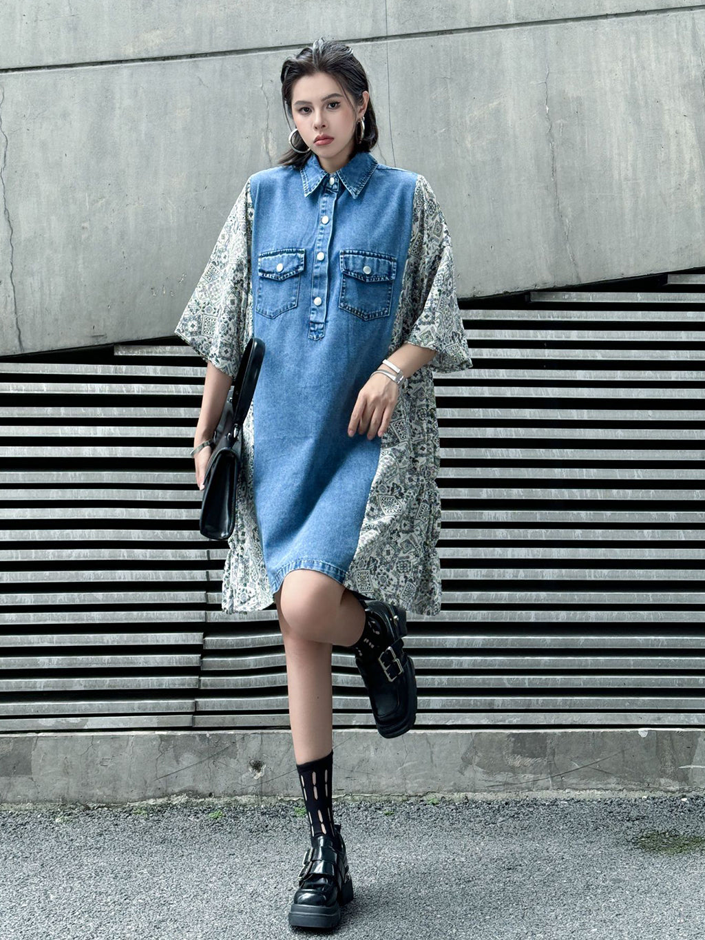ヴィンテージ感漂うウォッシュデニムとオリエンタルな総柄ファブリックを組み合わせた、リラックス感のあるシャツドレス。肩から袖にかけての切り替えが印象的で、ゆったりとしたシルエットがこなれた雰囲気を演出。胸元のフラップポケットや前立てボタンがアクセントとなり、コーディネートの主軸として存在感を放つ一着。スニーカーからブーツまで幅広いスタイリングに対応。