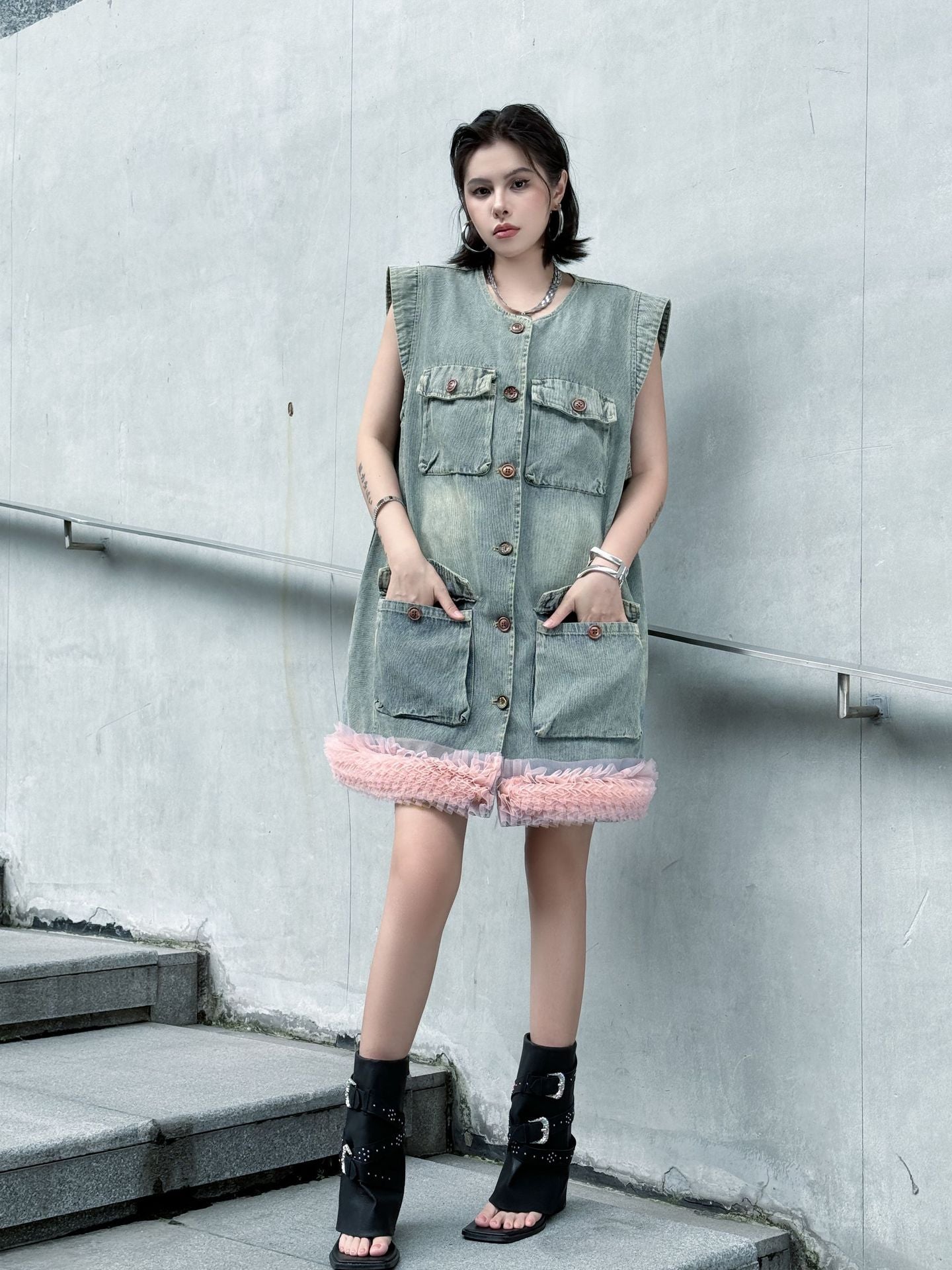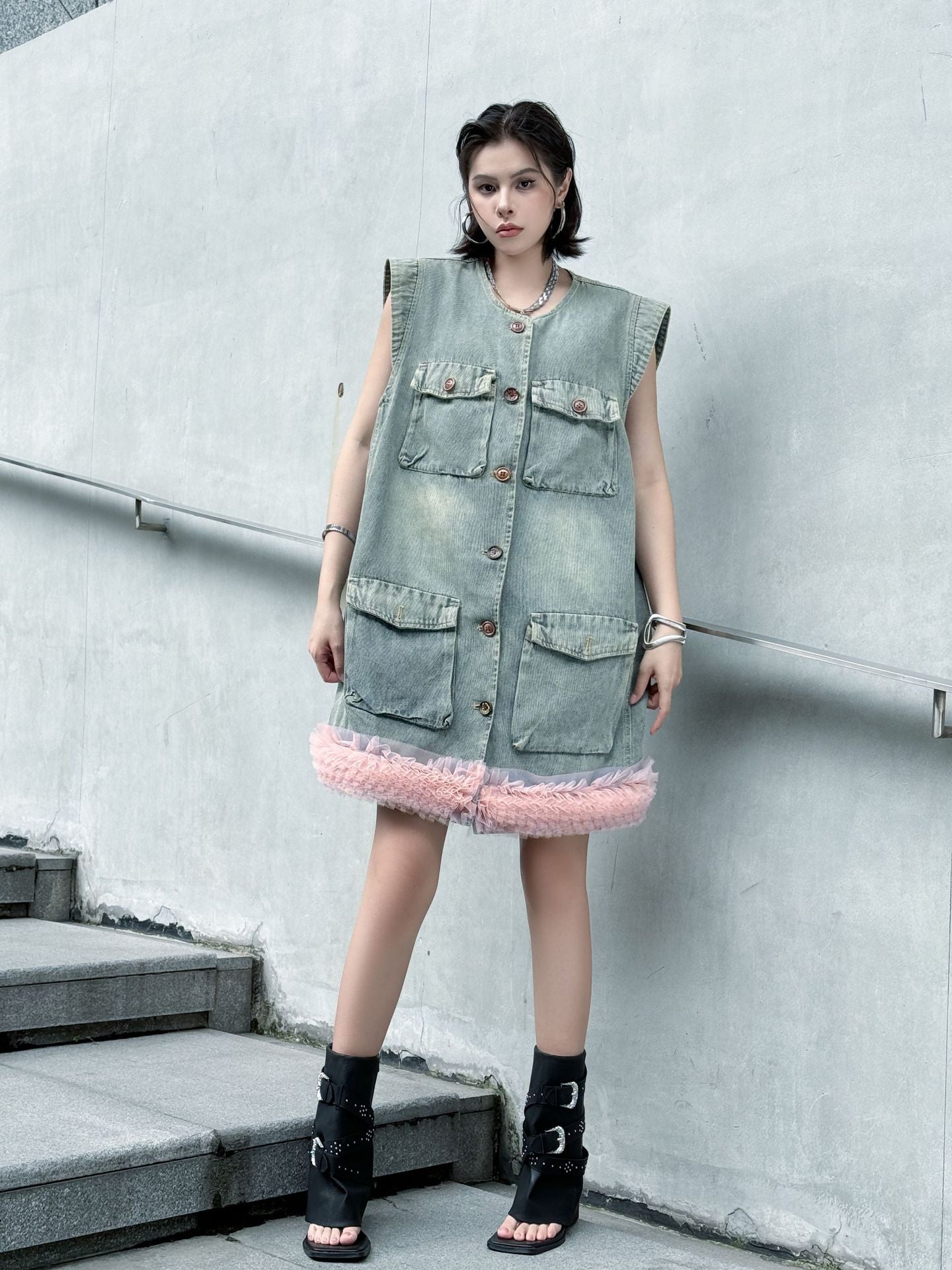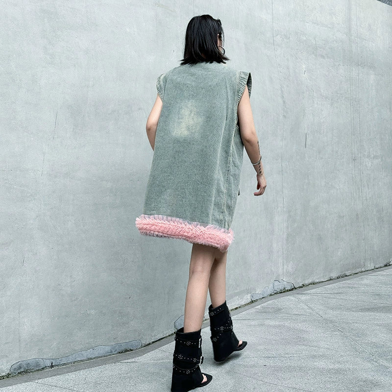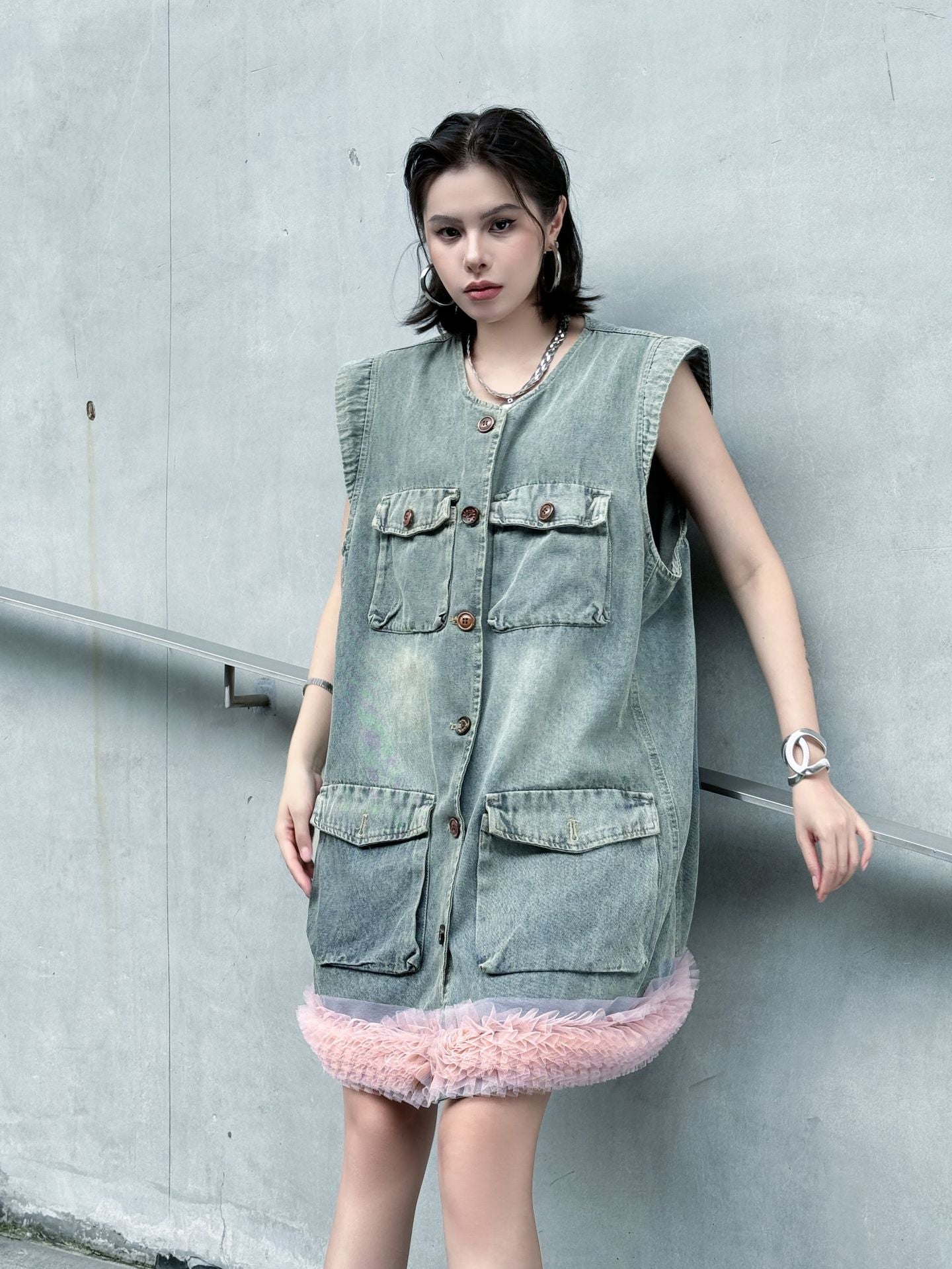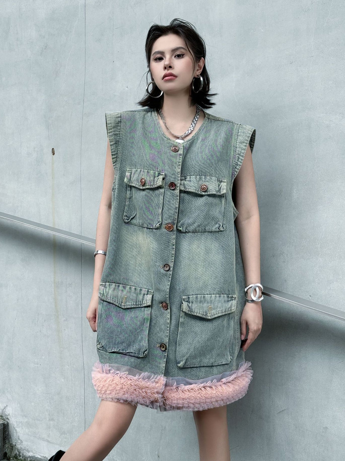 ヴィンテージ感のあるウォッシュドデニムをベースに、裾部分に立体的なチュールフリルを施した異素材ミックスのデザイン。フロントはボタン開閉仕様で、胸元と腰位置に大きめのポケットを配置し実用性も兼備。ノースリーブのゆったりとしたシルエットが、ラフさと女性らしいエッセンスを融合させている。ストリートスタイルからエッジィなモードまで幅広く対応できる一着。