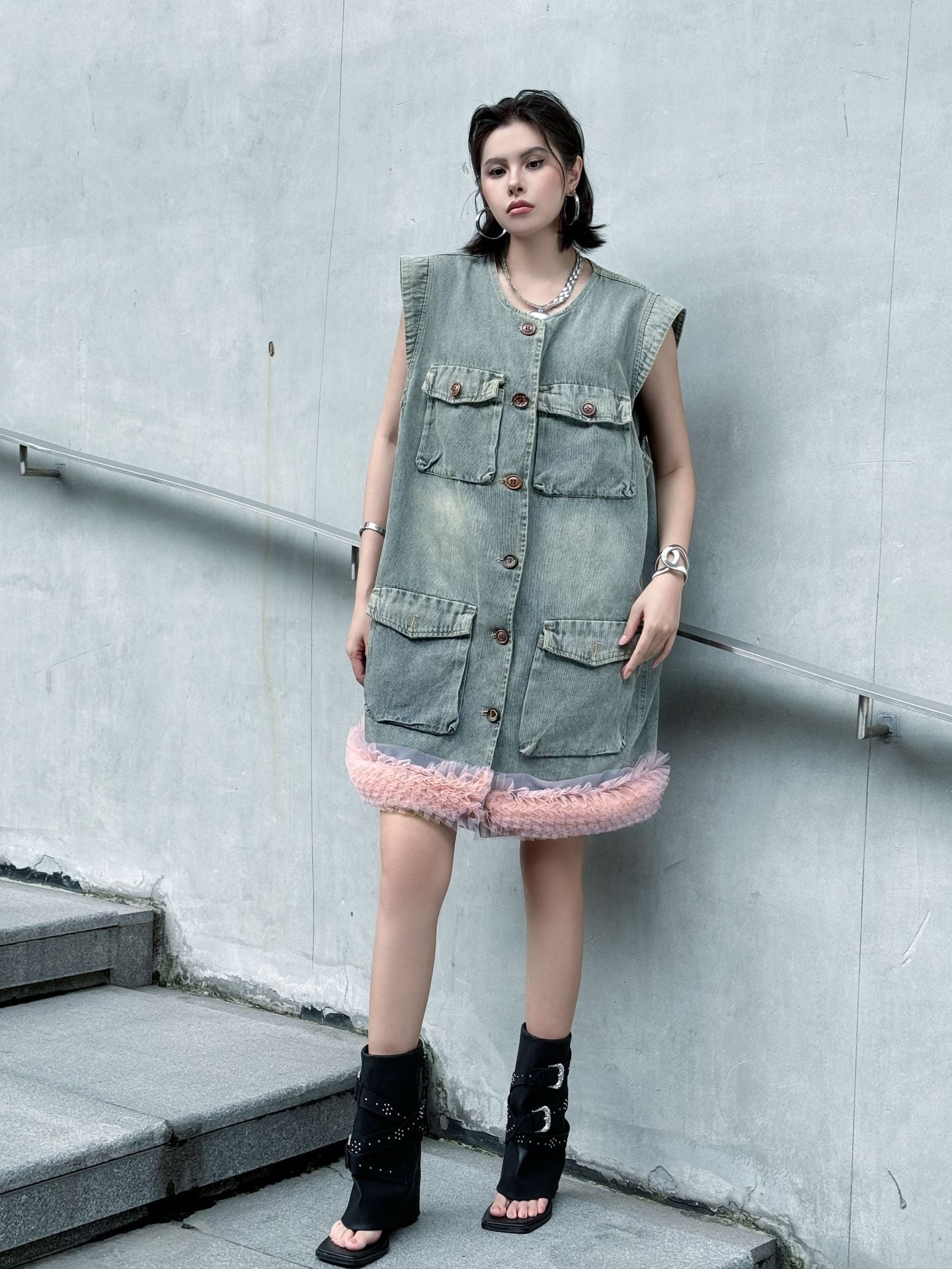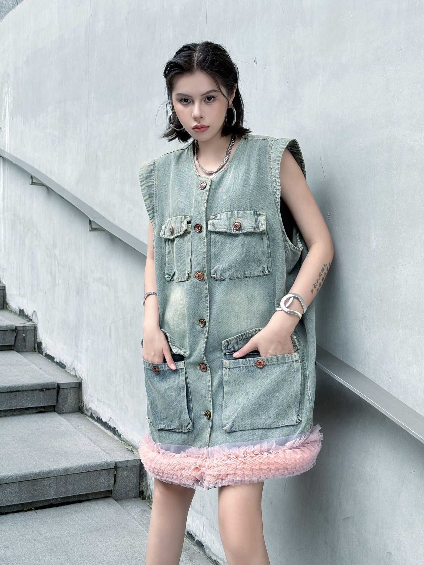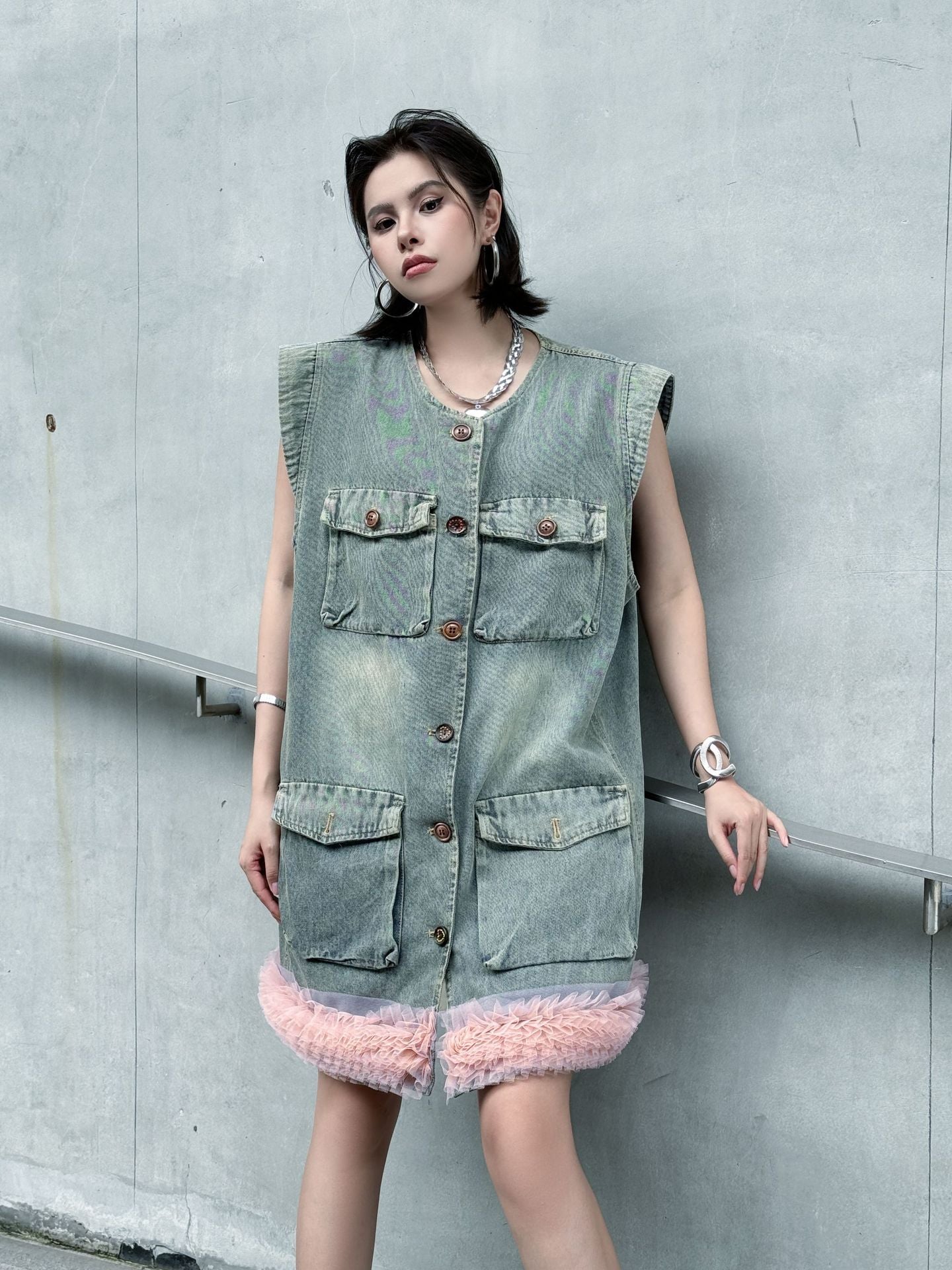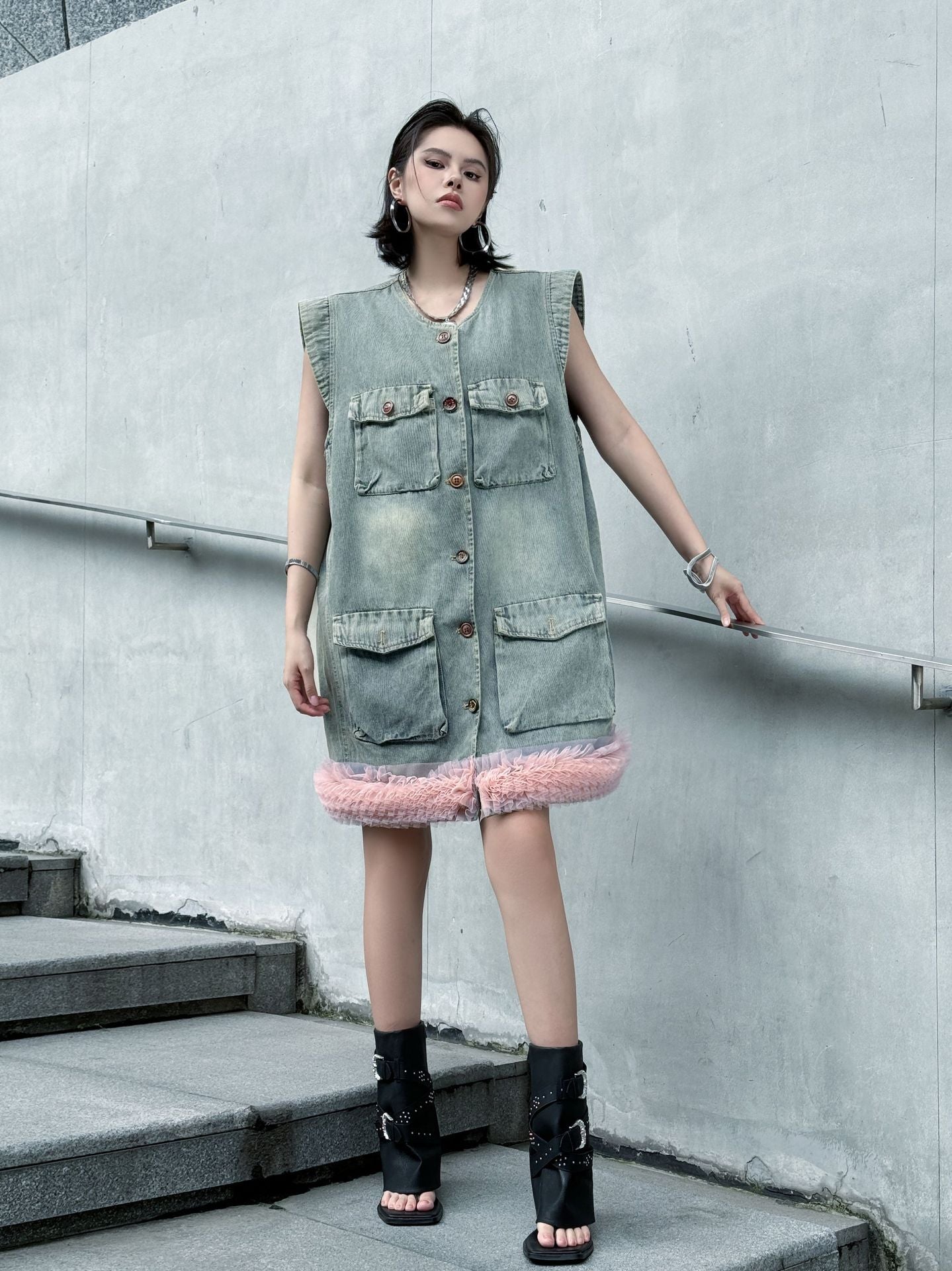 ヴィンテージ感のあるウォッシュドデニムをベースに、裾部分に立体的なチュールフリルを施した異素材ミックスのデザイン。フロントはボタン開閉仕様で、胸元と腰位置に大きめのポケットを配置し実用性も兼備。ノースリーブのゆったりとしたシルエットが、ラフさと女性らしいエッセンスを融合させている。ストリートスタイルからエッジィなモードまで幅広く対応できる一着。