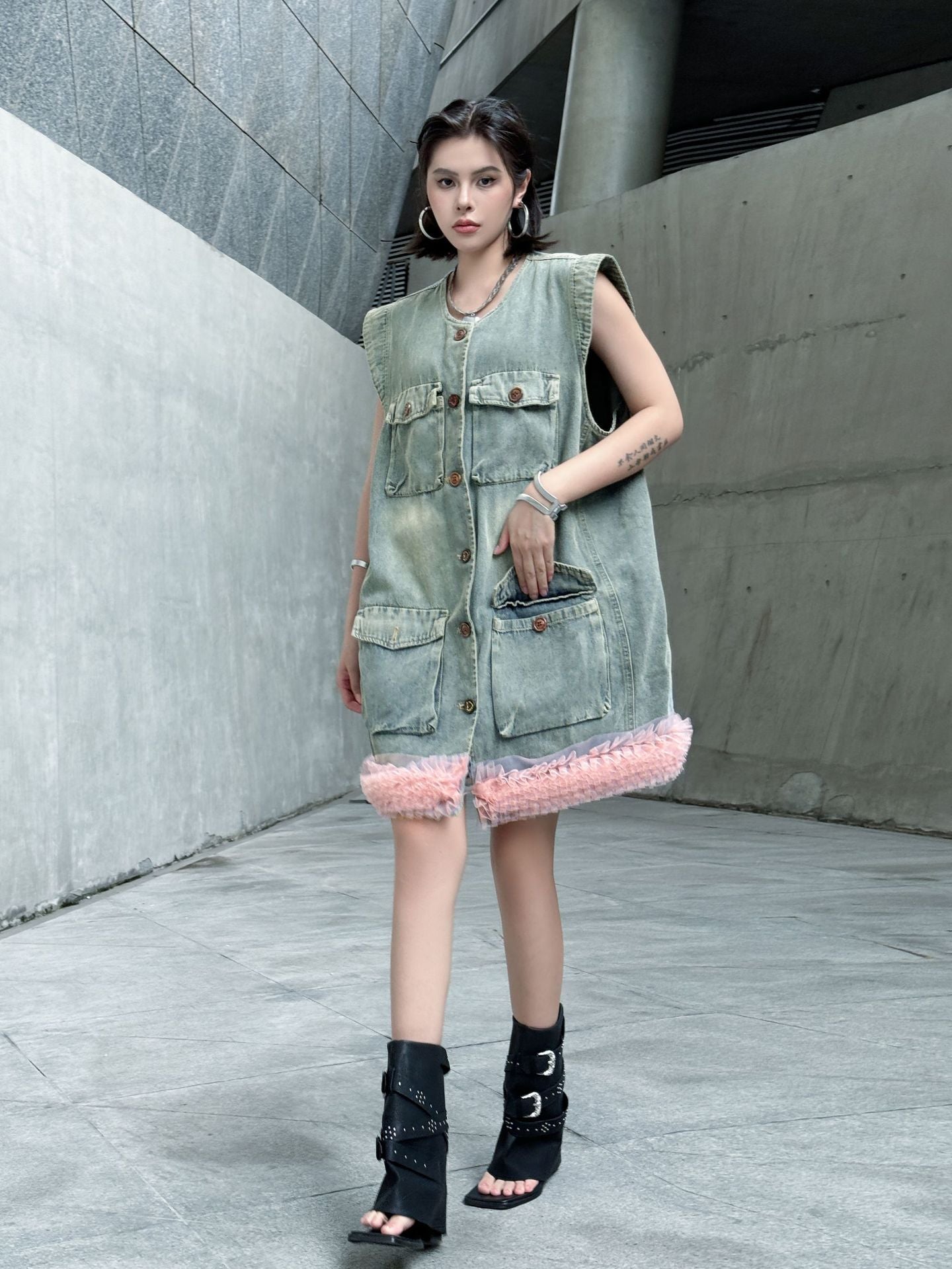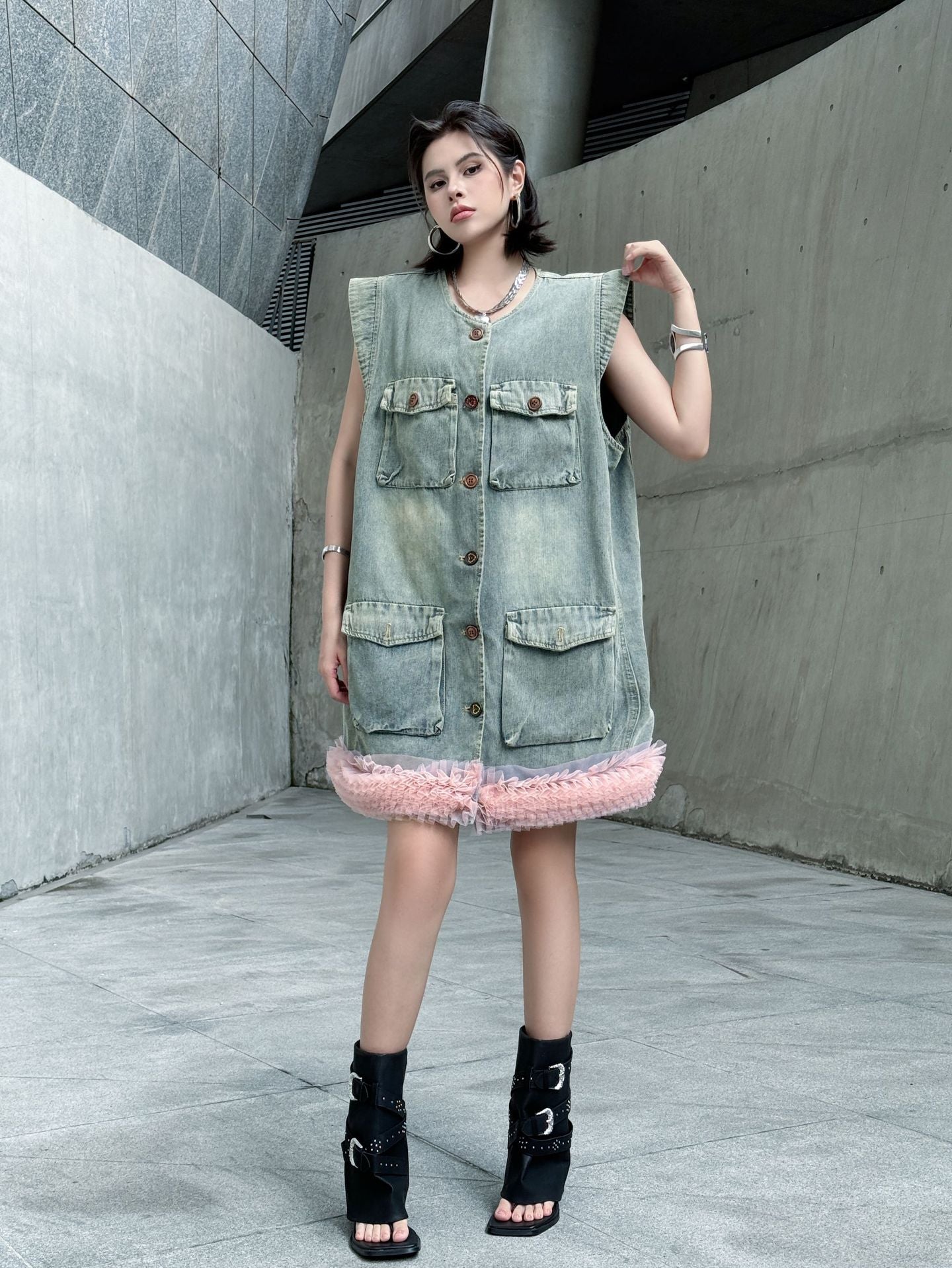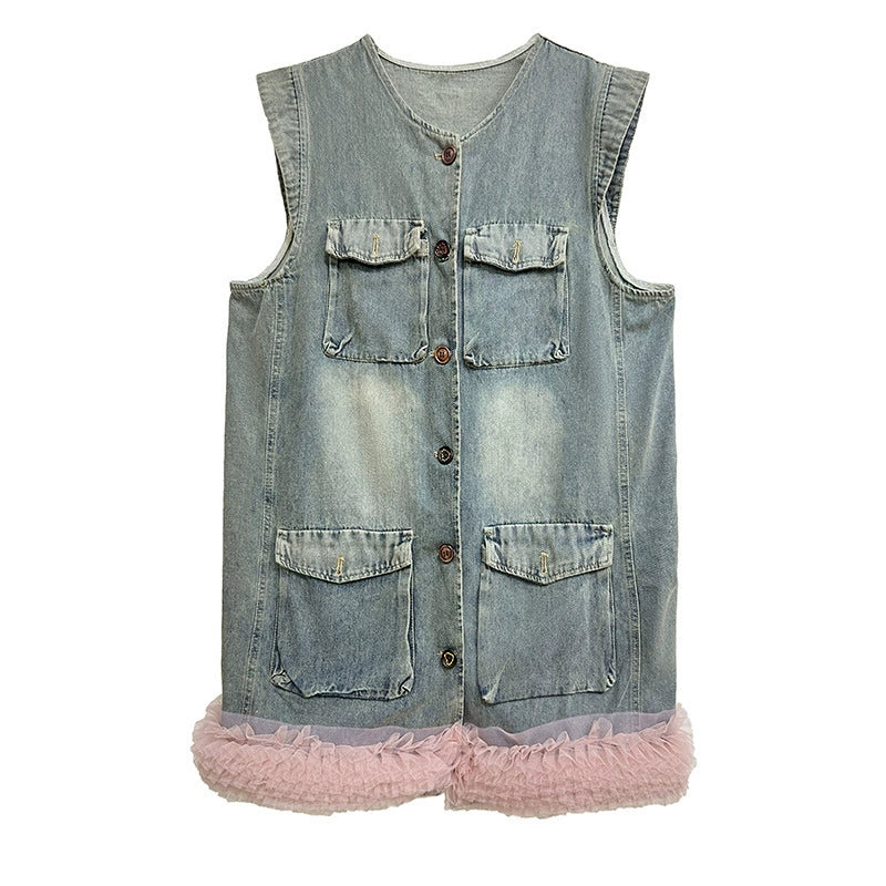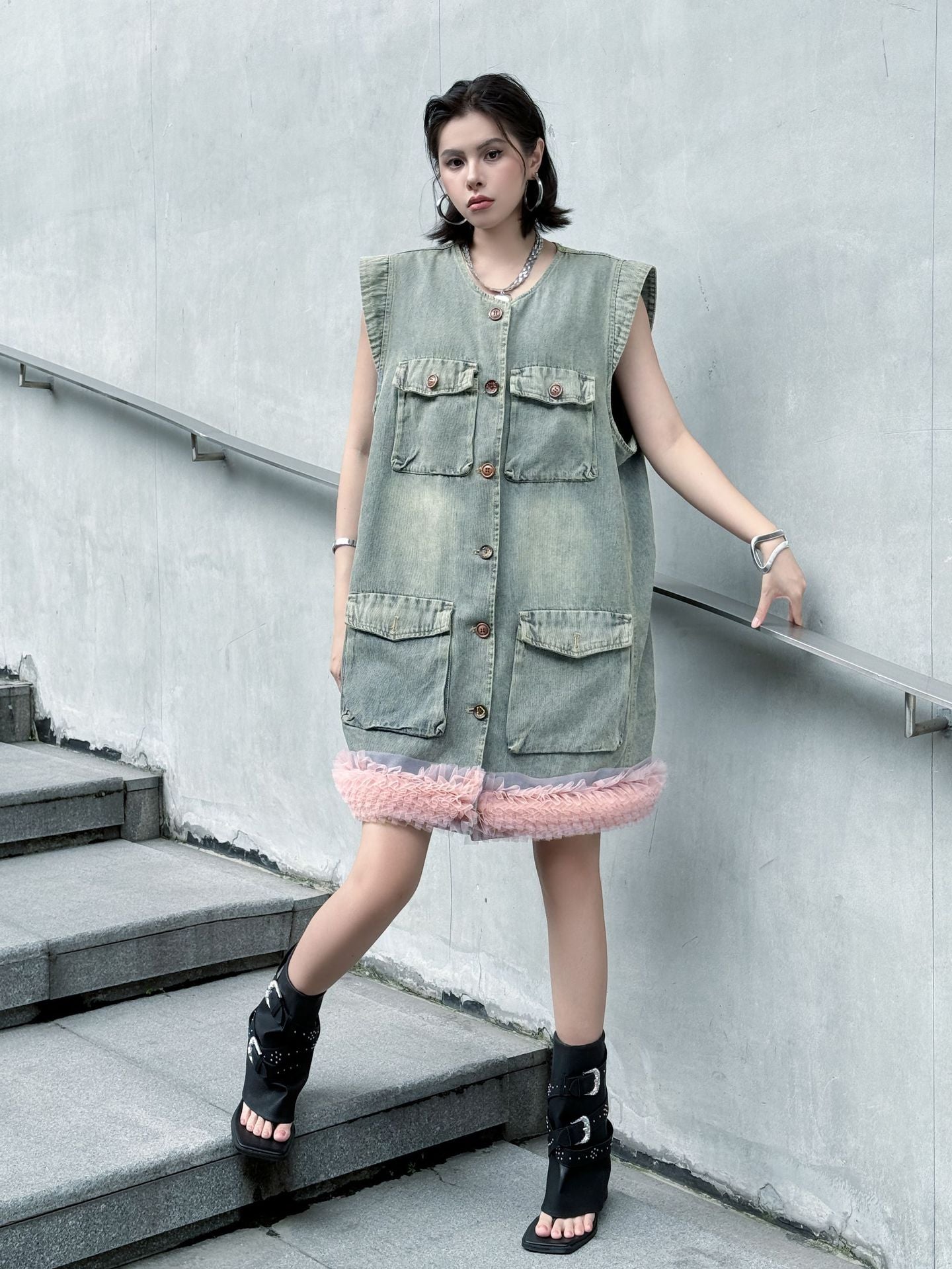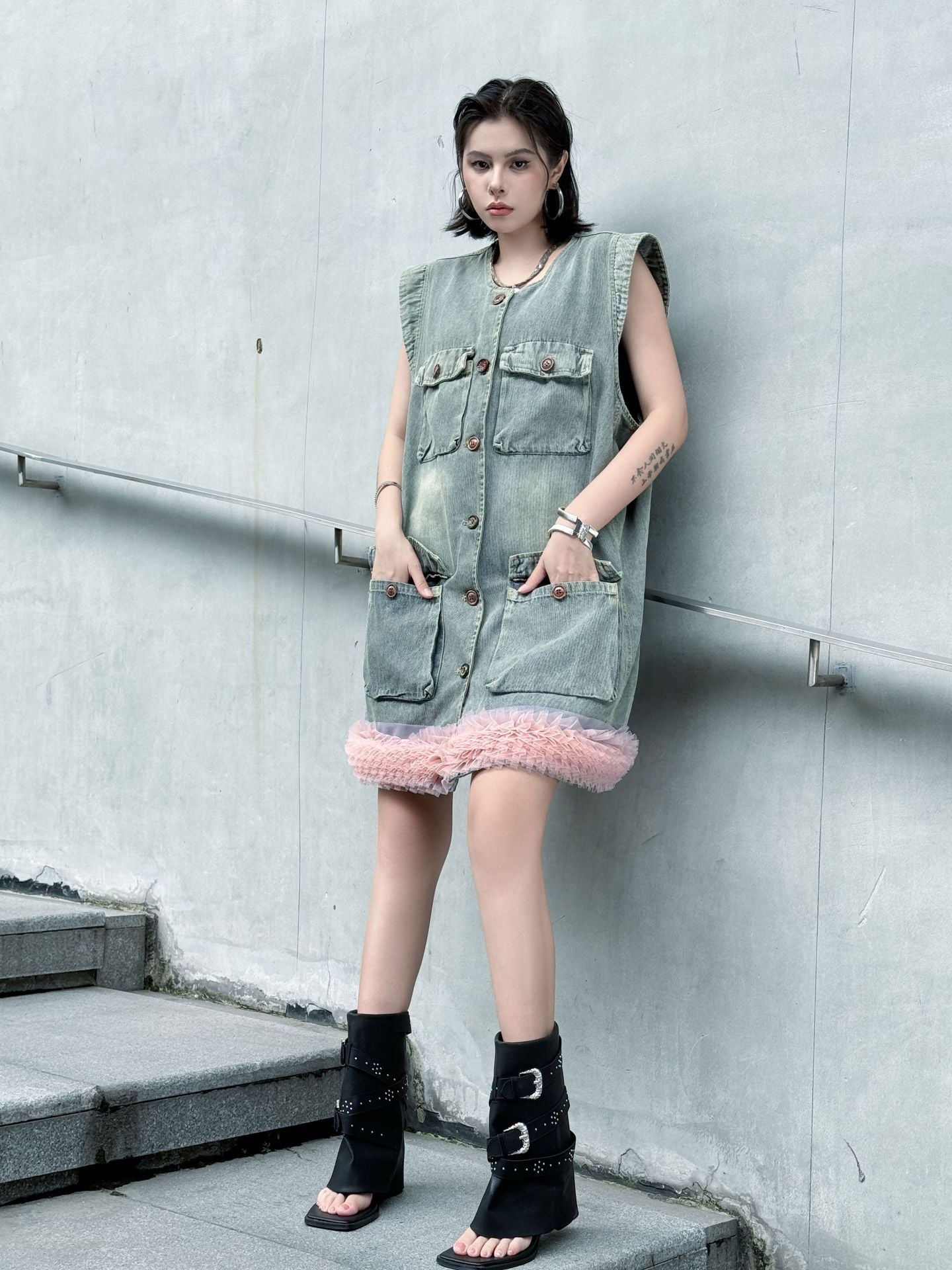 ヴィンテージ感のあるウォッシュドデニムをベースに、裾部分に立体的なチュールフリルを施した異素材ミックスのデザイン。フロントはボタン開閉仕様で、胸元と腰位置に大きめのポケットを配置し実用性も兼備。ノースリーブのゆったりとしたシルエットが、ラフさと女性らしいエッセンスを融合させている。ストリートスタイルからエッジィなモードまで幅広く対応できる一着。