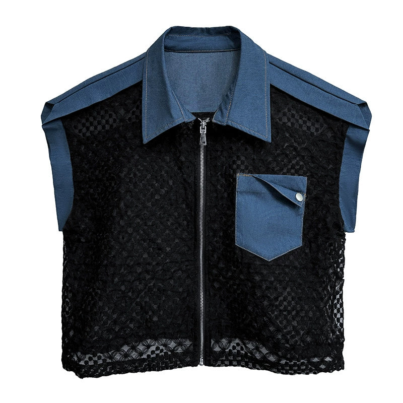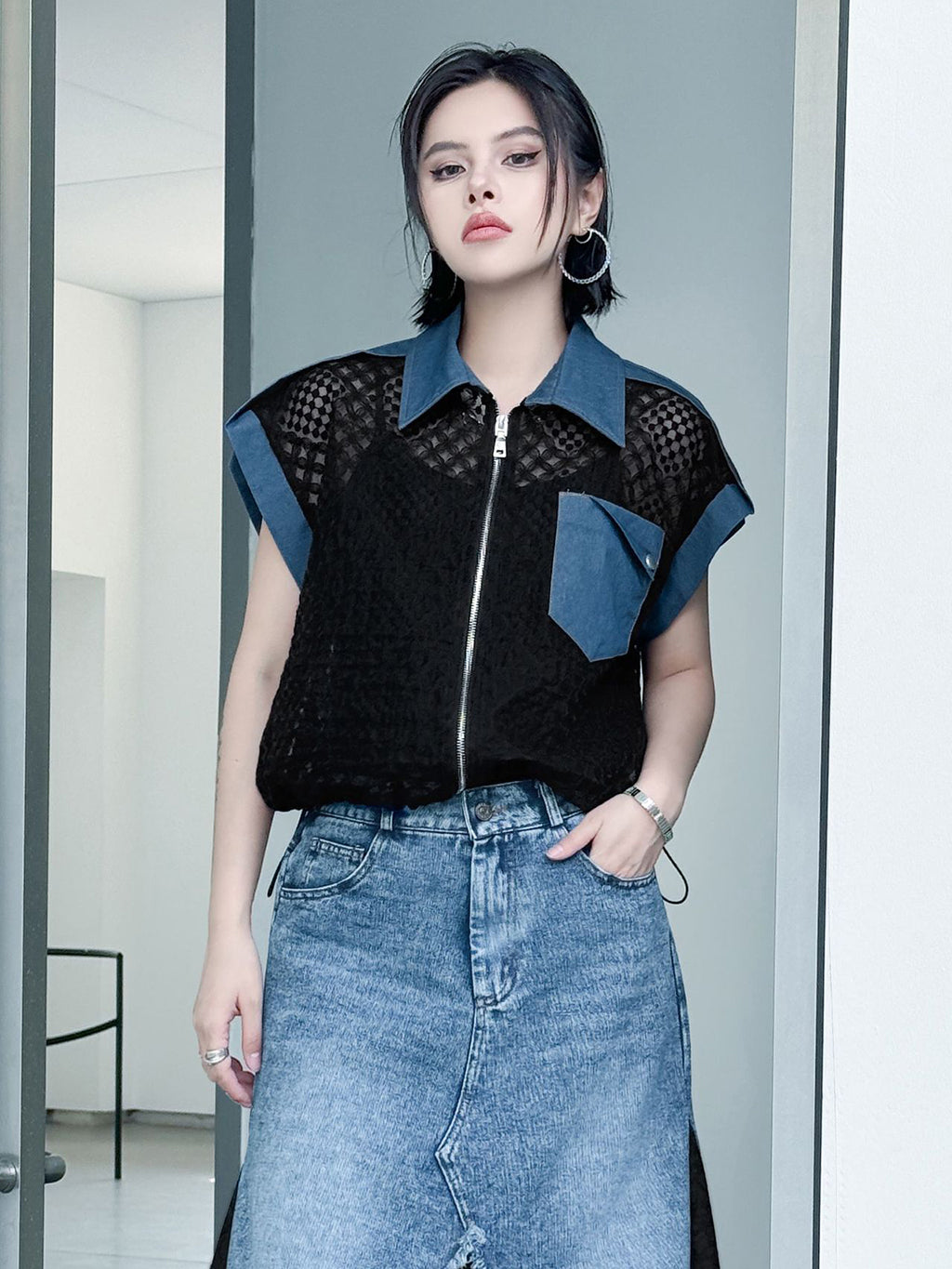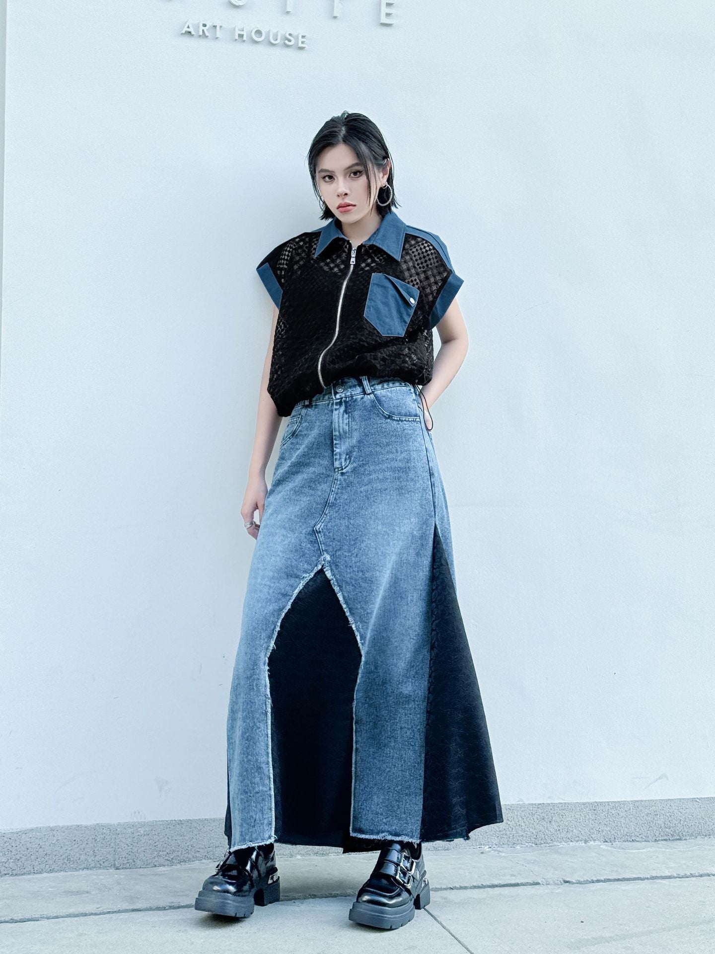 インディゴデニムとメッシュをドッキングしたコンビトップス。フロントにはジップとポケットを配置し、スポーティさとモード感を融合。シアーな質感がレイヤードスタイルを引き立て、背面も透け感があり軽やかな印象を与える。デニム部分が全体を引き締め、シンプルなボトムにも合わせやすいデザイン。