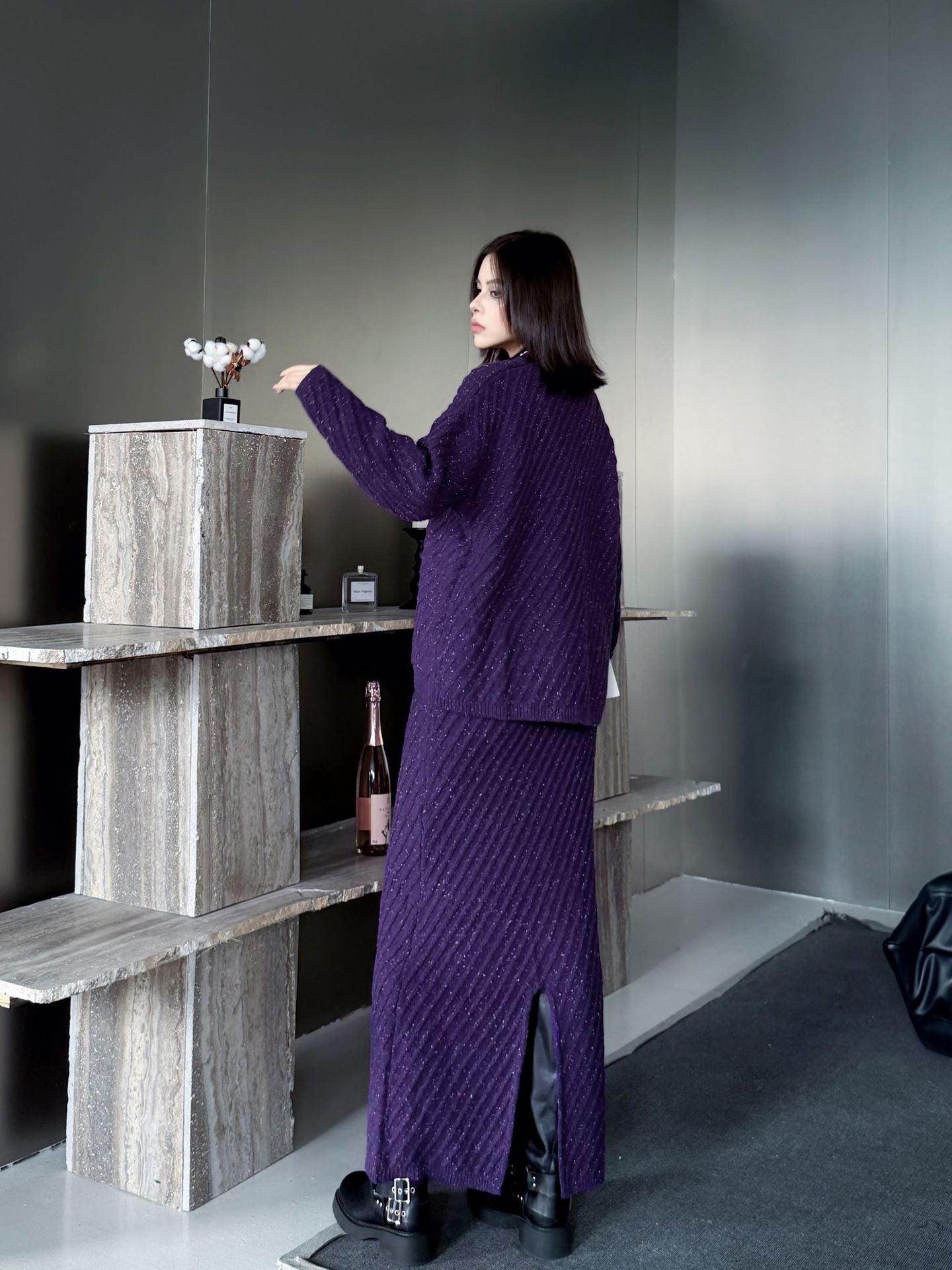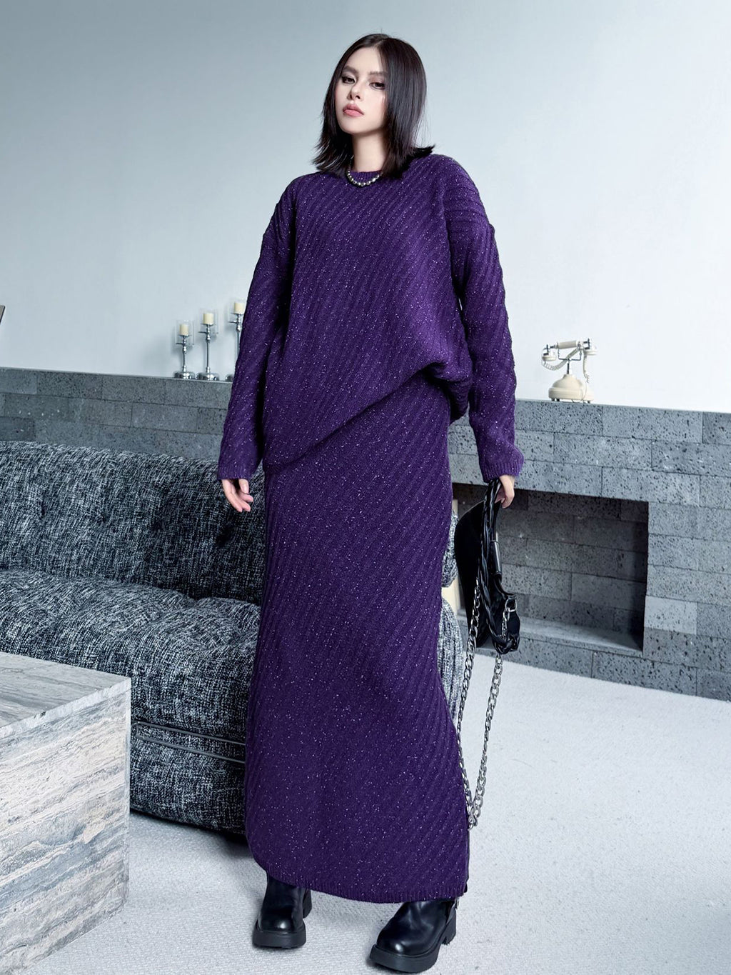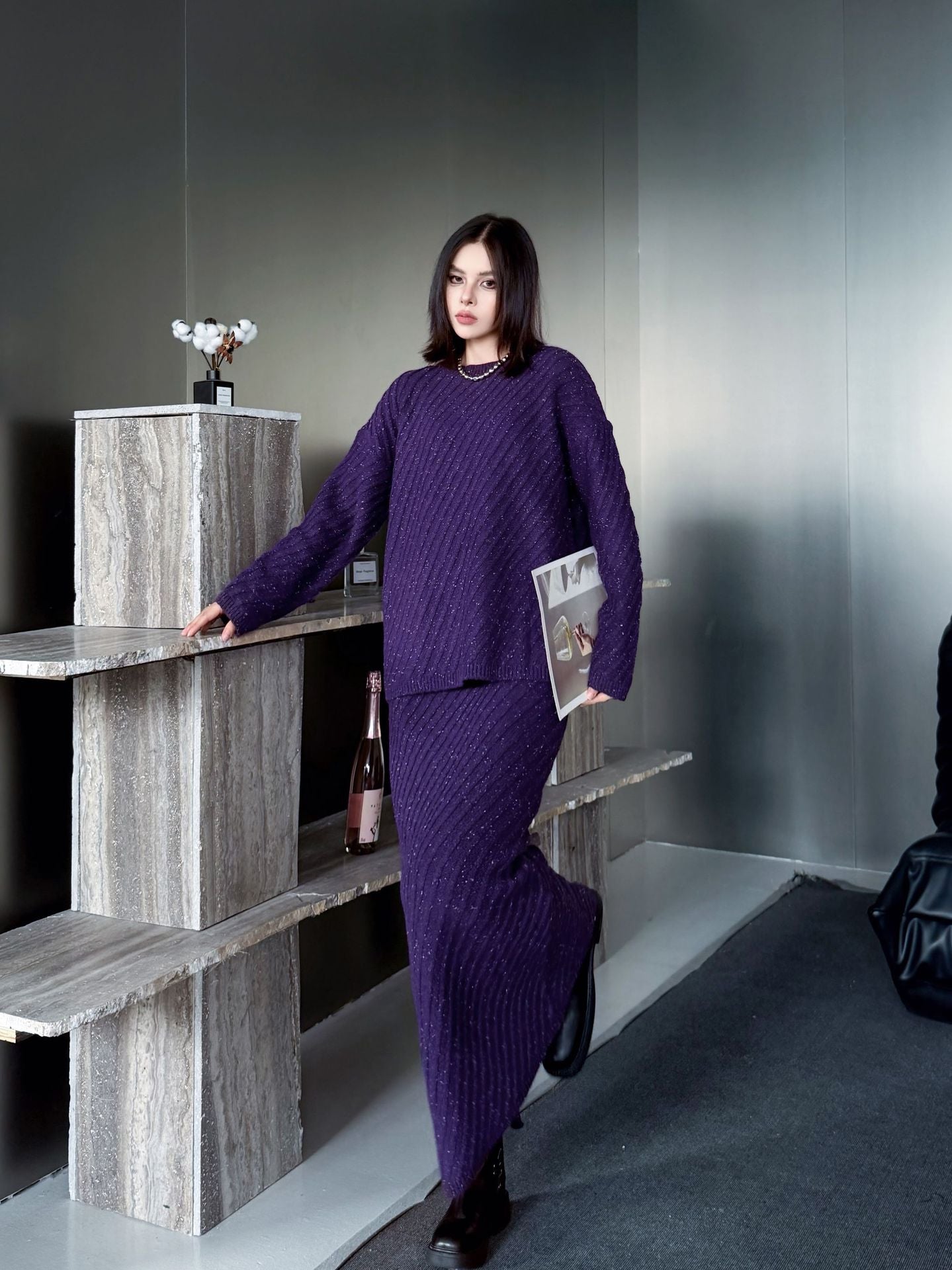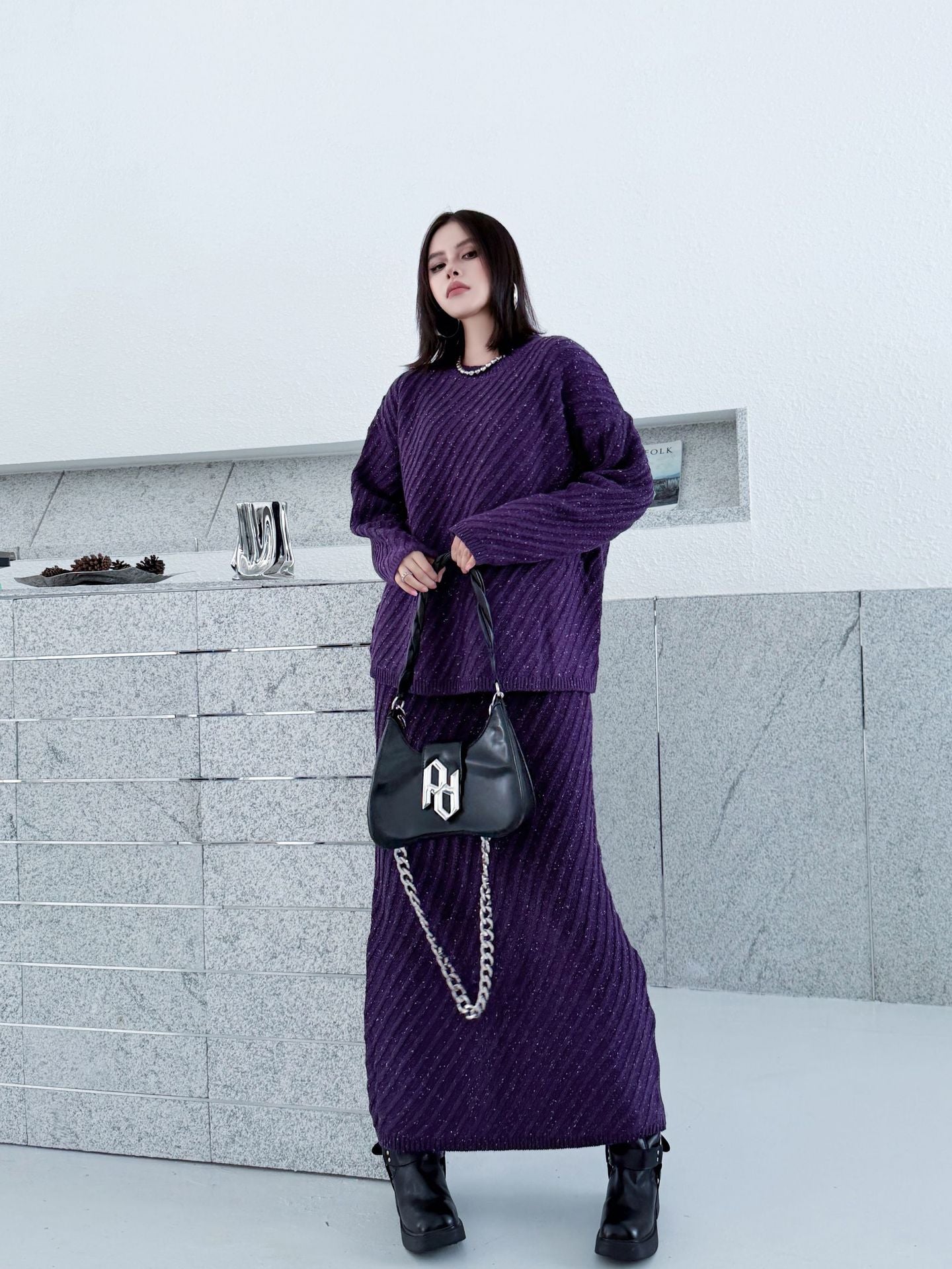 柔らかな糸で編み上げた斜めリブが全体に流れる構築的な表情を生み出すシリーズ。トップスは肩を落としたゆるやかなラインで、自然な抜け感とモードな印象を演出。スカートはウエストから裾にかけて緩やかに広がるストレートシルエットで、動きに合わせてリブの陰影が変化する。編み地の質感が豊かで、単品でもセットでも成立する完成度の高い構成。ミニマルな空間に映える存在感を持ち、洗練された季節感を纏うシリーズ。