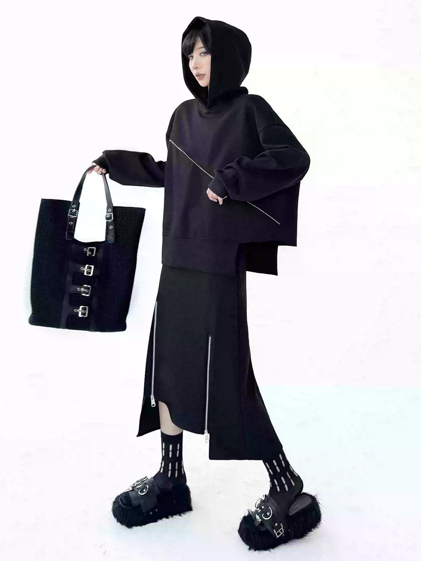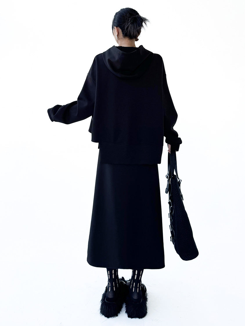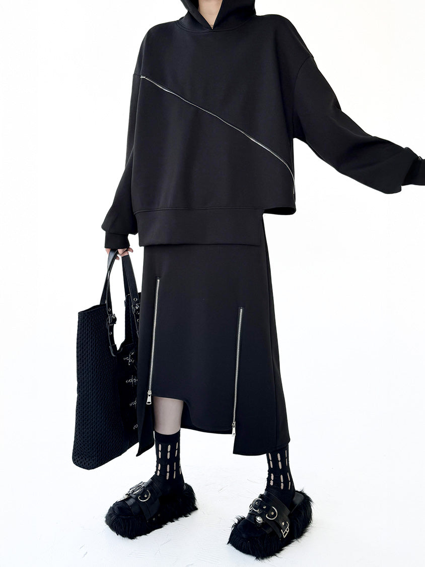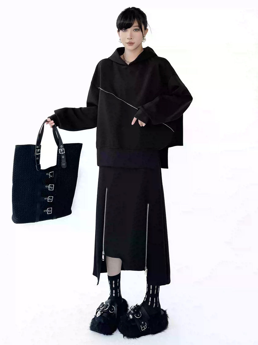 フーディーはフロントを横切る斜めジップが視線を流し、ドロップショルダーとゆとりある身幅で立体的なボリュームを形成。後ろ丈を長めに取ったバランスでレイヤードも組みやすい。スカートはフロントに配した縦ジップがアクセントとなり、開閉でスリット感と揺れ方を調整可能。ミニマルな面構成にディテールを効かせ、モードな統一感を作るシリーズ。