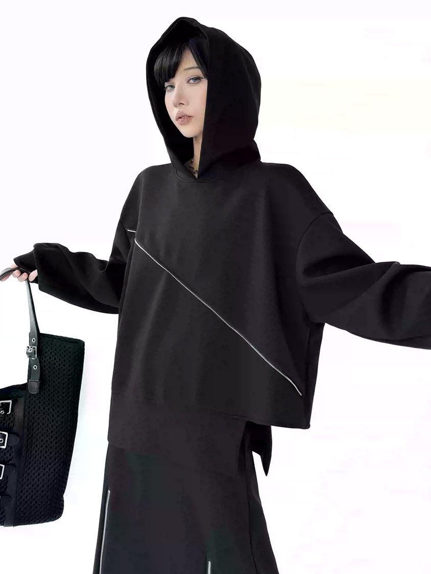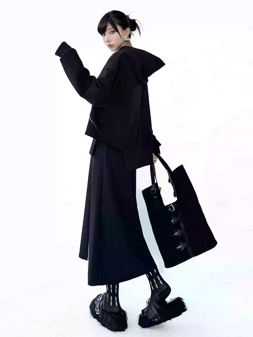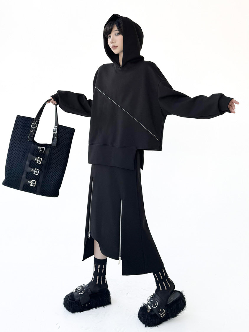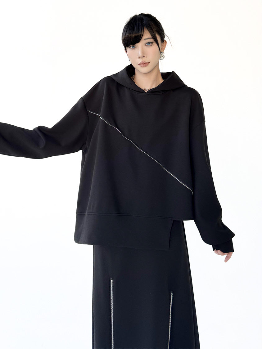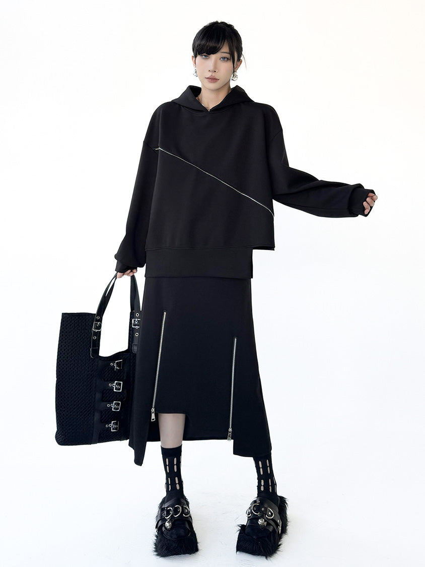 フーディーはフロントを横切る斜めジップが視線を流し、ドロップショルダーとゆとりある身幅で立体的なボリュームを形成。後ろ丈を長めに取ったバランスでレイヤードも組みやすい。スカートはフロントに配した縦ジップがアクセントとなり、開閉でスリット感と揺れ方を調整可能。ミニマルな面構成にディテールを効かせ、モードな統一感を作るシリーズ。