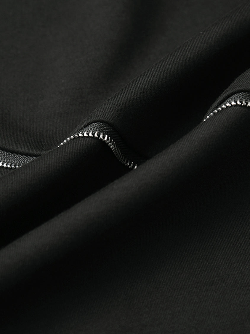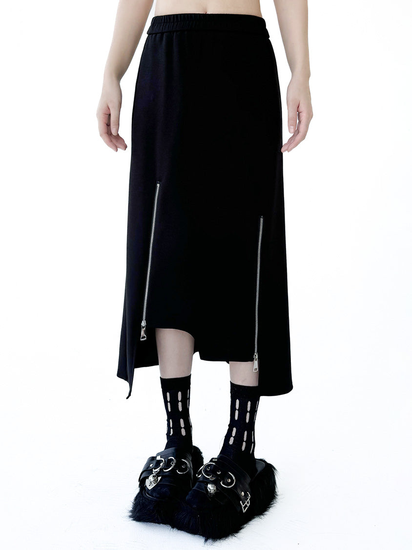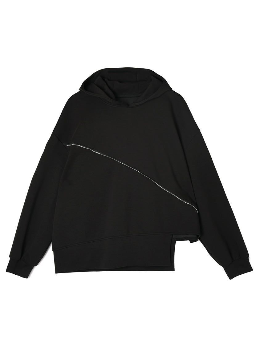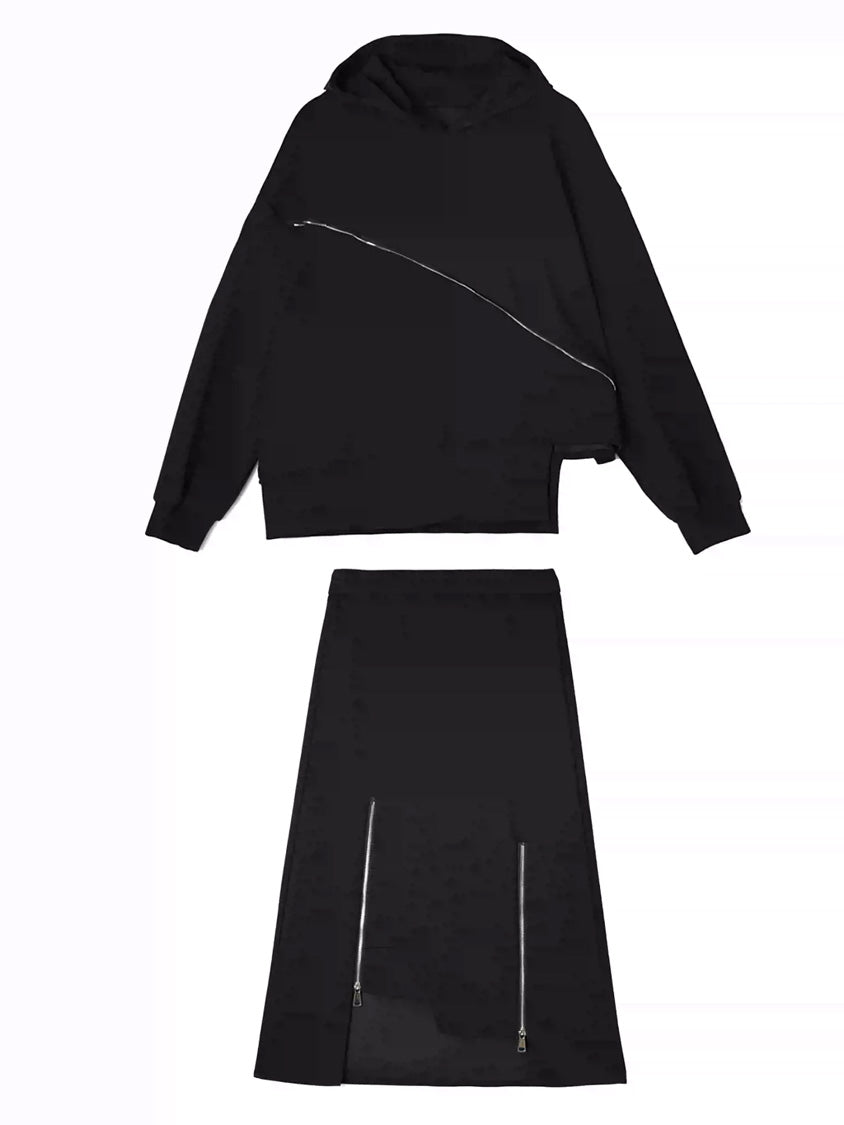 フーディーはフロントを横切る斜めジップが視線を流し、ドロップショルダーとゆとりある身幅で立体的なボリュームを形成。後ろ丈を長めに取ったバランスでレイヤードも組みやすい。スカートはフロントに配した縦ジップがアクセントとなり、開閉でスリット感と揺れ方を調整可能。ミニマルな面構成にディテールを効かせ、モードな統一感を作るシリーズ。