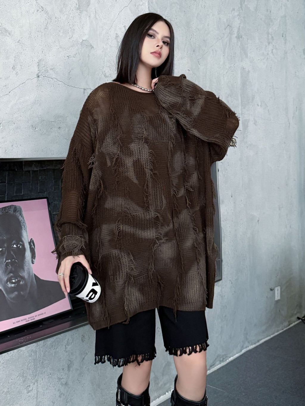 全体にほどこされたディストレスト加工が印象的なオーバーサイズニット。ざっくりとした編み組織と凹凸のある表情が特徴で、自然な陰影がスタイルに奥行きを与える。ゆるやかなドロップショルダーとワイドスリーブが体を包み込み、ラフなフォルムながらも洗練されたムードを保つ。軽量なコットンニット素材で構成され、シーズンレスに活躍する一枚。