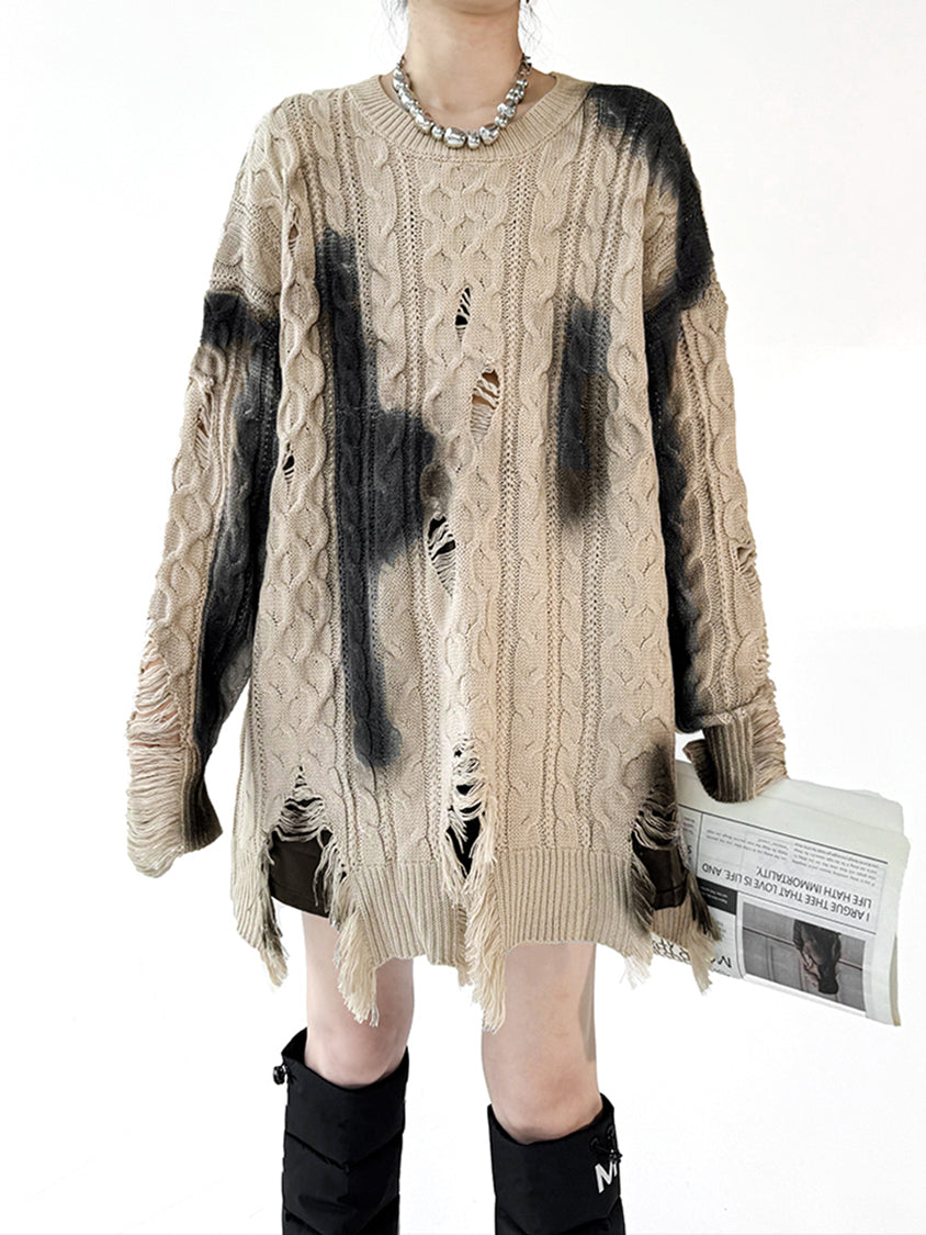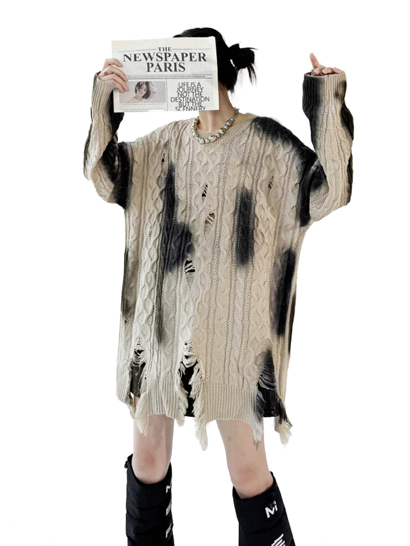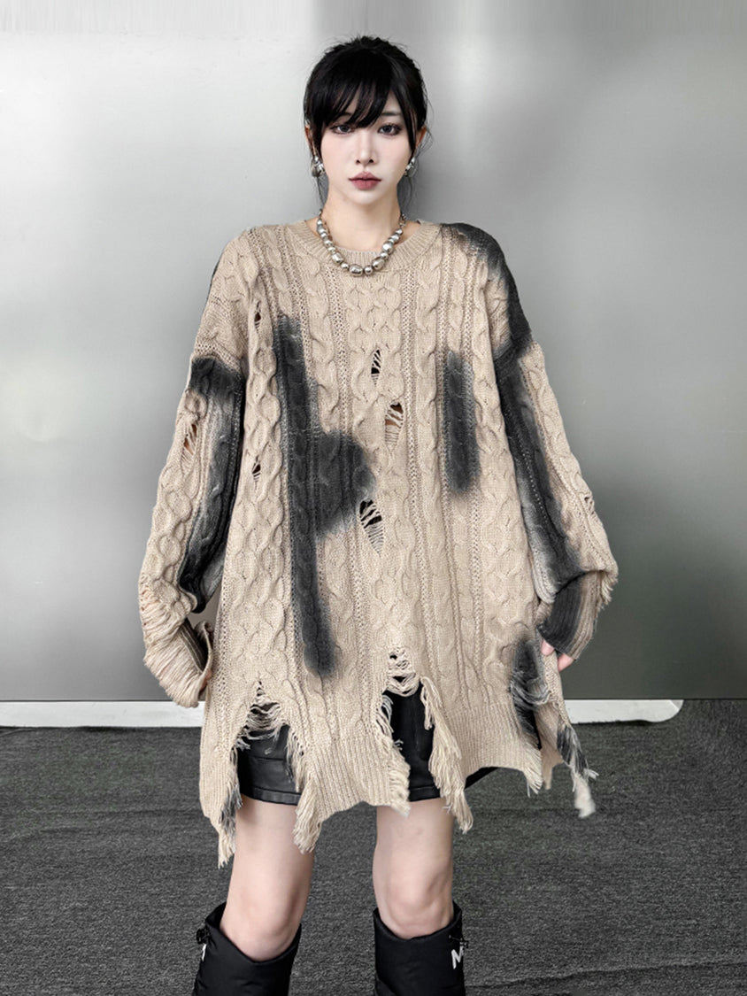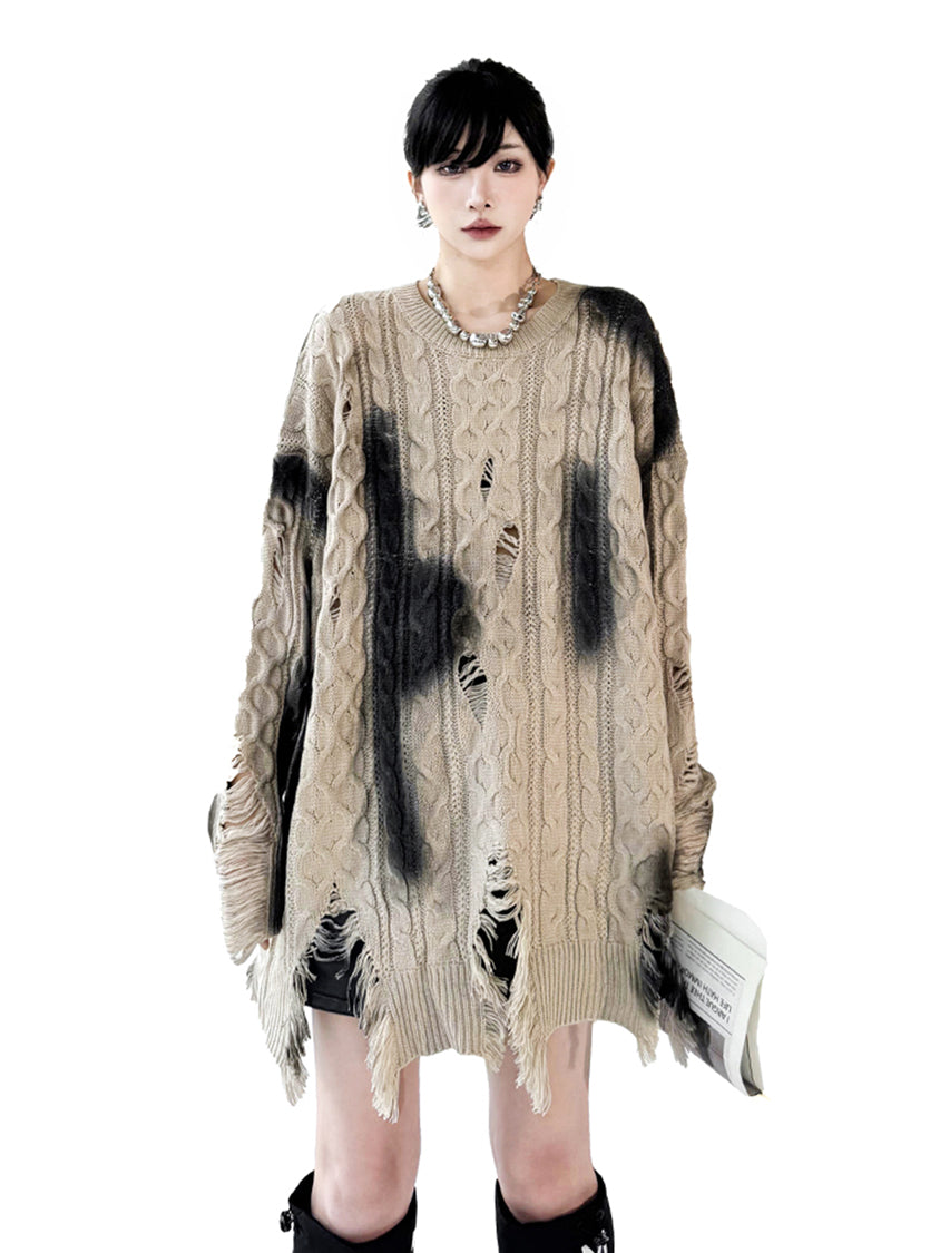 ケーブル編みに濃淡を重ねたグラデーション加工が立体的な陰影を生み、全体に施されたダメージが自然な崩れを描くセーター。ゆるやかな肩の落ちと長めの袖がリラックスした空気を保ちつつ、編地そのものの厚みが輪郭をゆるやかに包む。裾や袖口に走る裂けの表情が動きに合わせて揺れ、単体で存在感を引き立てる構成。ニット特有の柔らかさと空気を含む軽さが内側に余白を作り、スタイリングに余裕をもたらす。