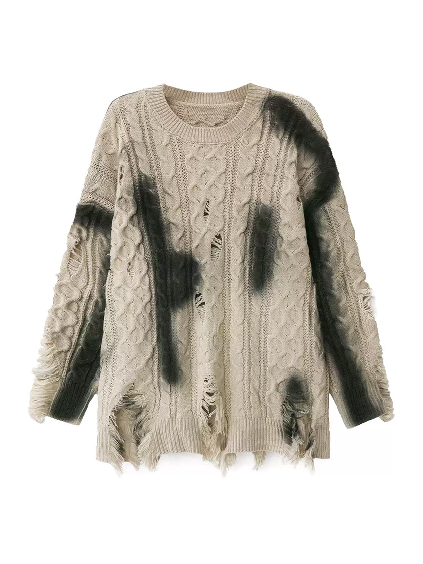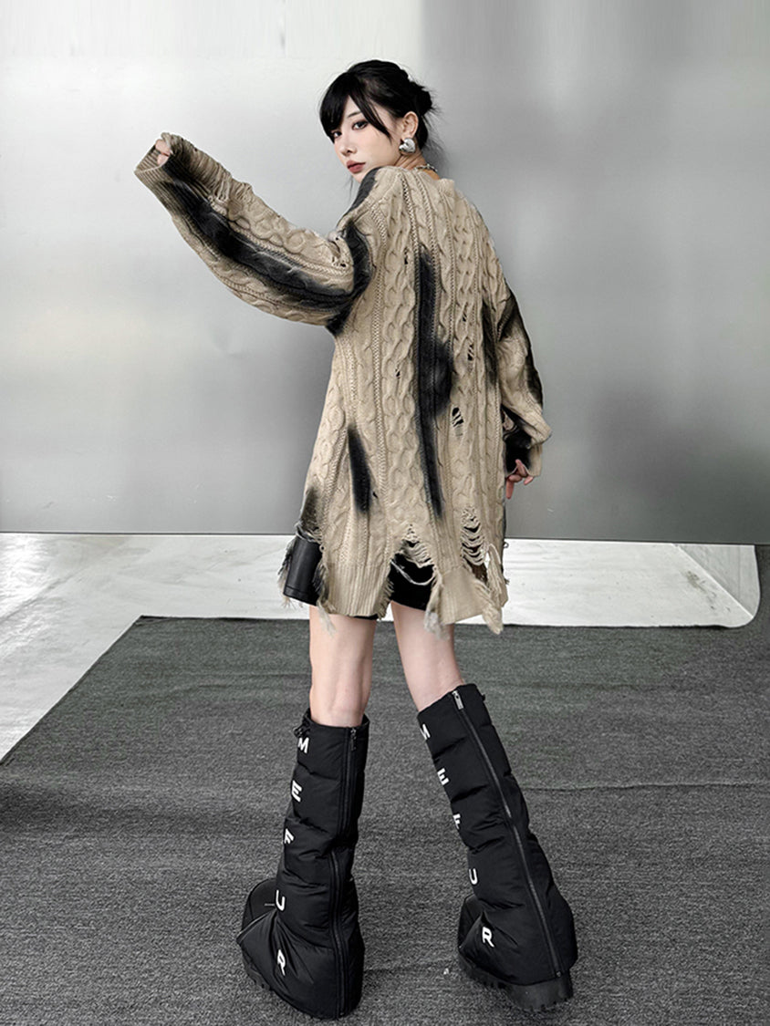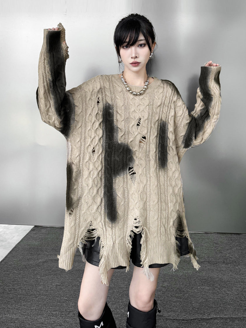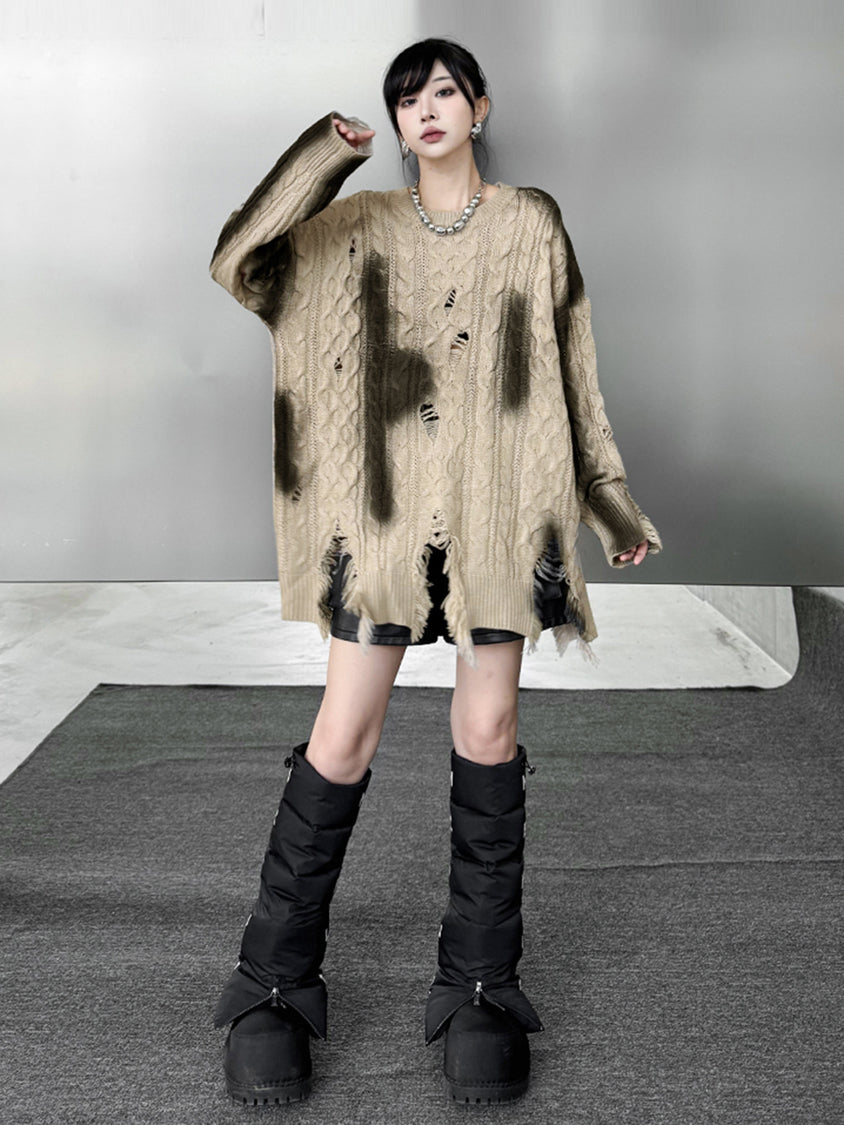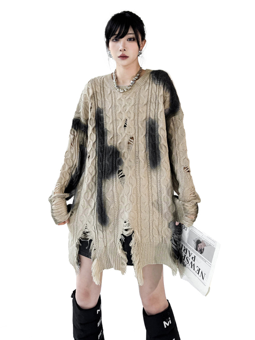 ケーブル編みに濃淡を重ねたグラデーション加工が立体的な陰影を生み、全体に施されたダメージが自然な崩れを描くセーター。ゆるやかな肩の落ちと長めの袖がリラックスした空気を保ちつつ、編地そのものの厚みが輪郭をゆるやかに包む。裾や袖口に走る裂けの表情が動きに合わせて揺れ、単体で存在感を引き立てる構成。ニット特有の柔らかさと空気を含む軽さが内側に余白を作り、スタイリングに余裕をもたらす。