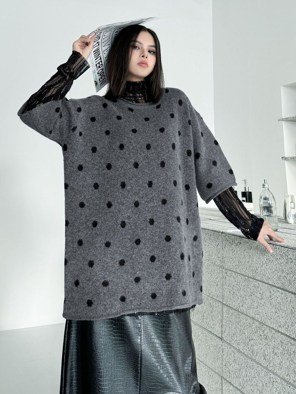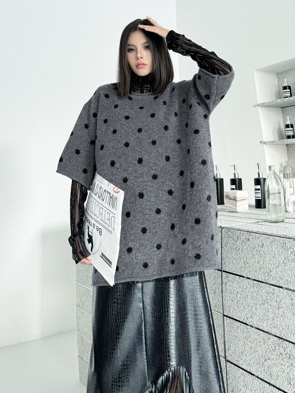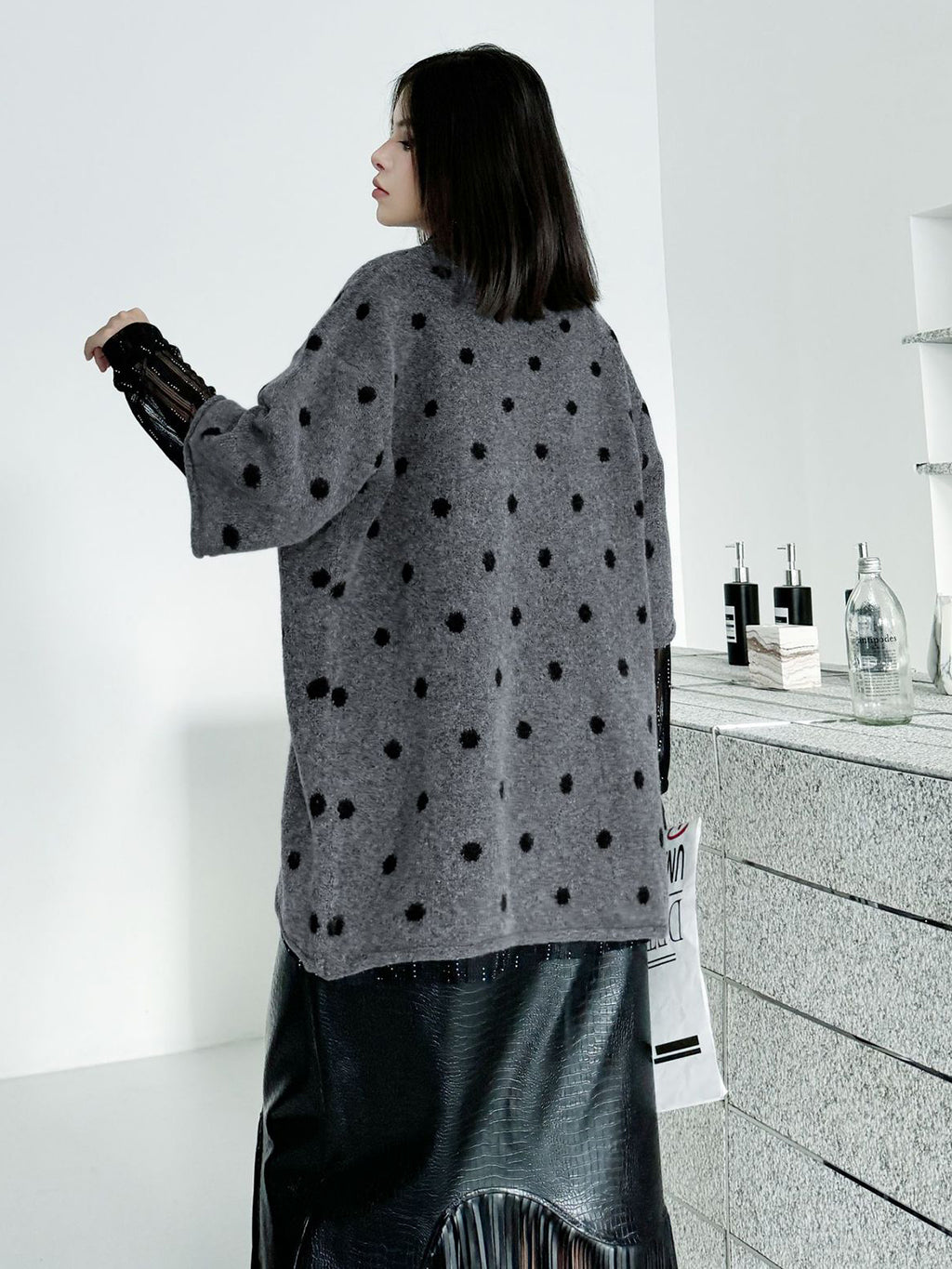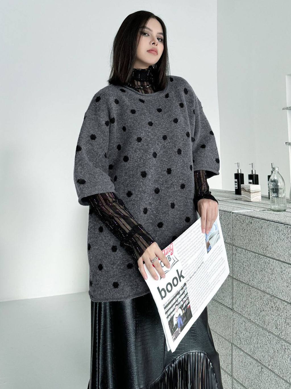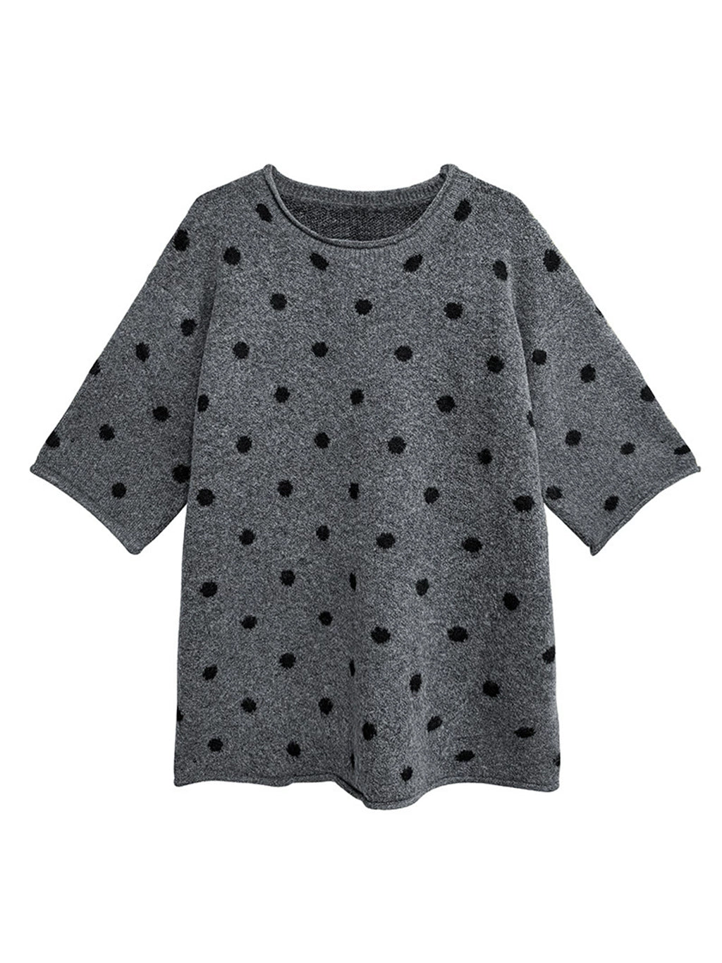 表面にフロッキープロセスでドットを散りばめた立体ニットトップ。短めの袖とゆとりのあるワイドシルエットが絶妙なバランスを生み、インナーとのレイヤードにも適した構成。ベースは軽やかなコットンウールで仕立てられ、暖かさと通気性を両立。滑らかな編み地に浮かぶドットの凹凸が光を受けて表情を変え、ミニマルなフォルムに遊びを添える。