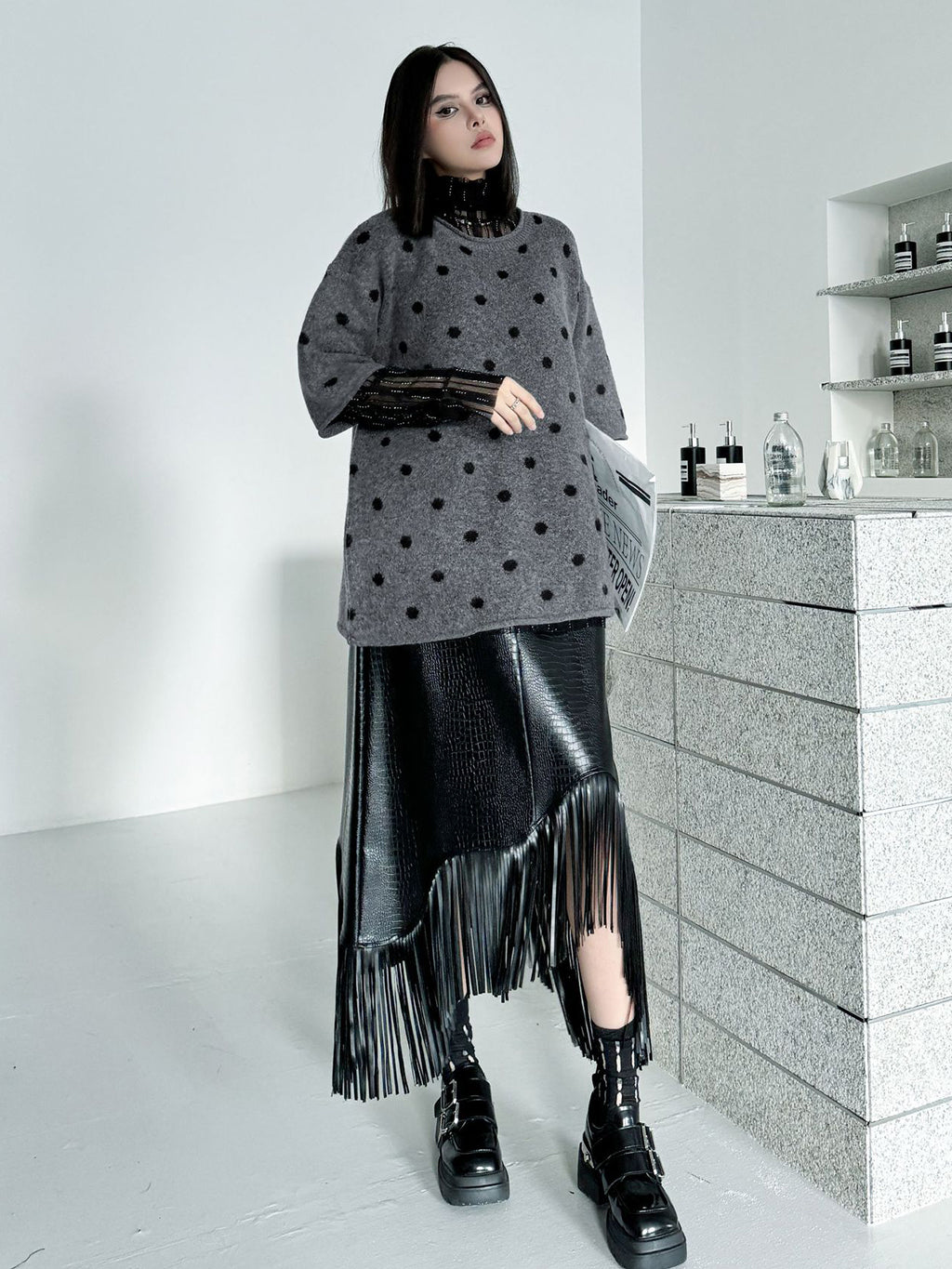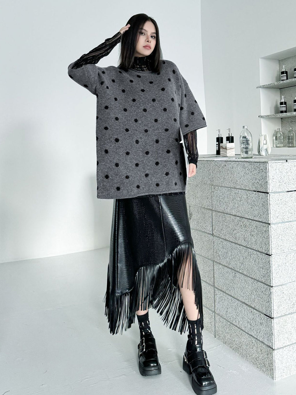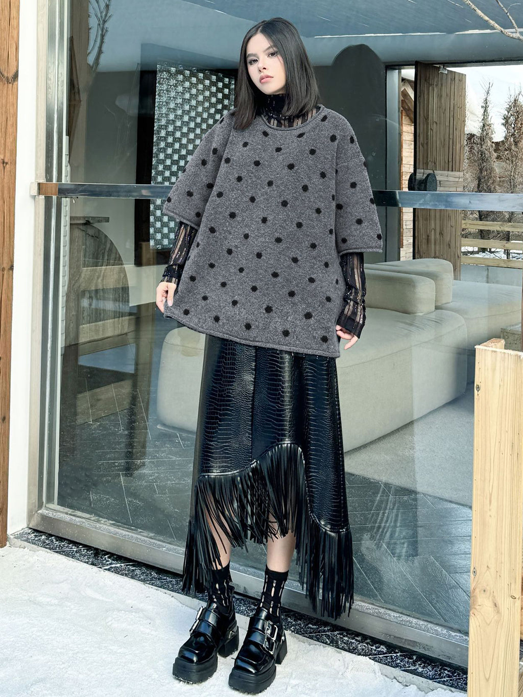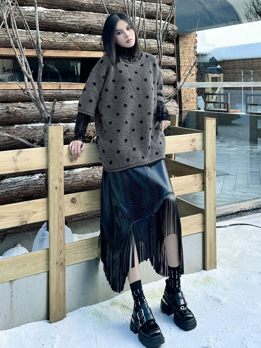 表面にフロッキープロセスでドットを散りばめた立体ニットトップ。短めの袖とゆとりのあるワイドシルエットが絶妙なバランスを生み、インナーとのレイヤードにも適した構成。ベースは軽やかなコットンウールで仕立てられ、暖かさと通気性を両立。滑らかな編み地に浮かぶドットの凹凸が光を受けて表情を変え、ミニマルなフォルムに遊びを添える。