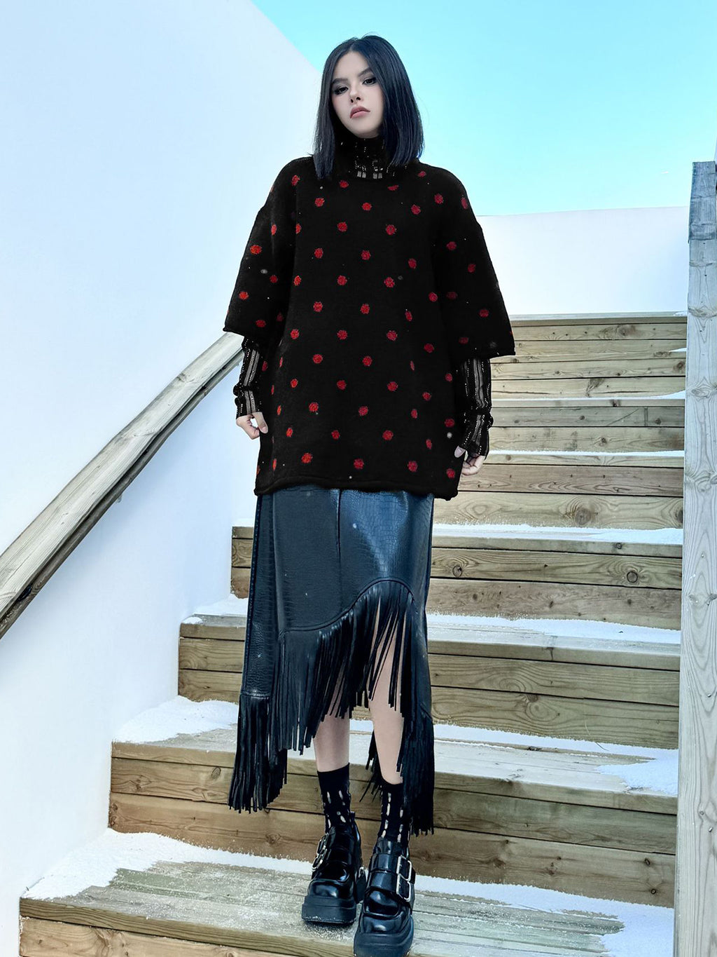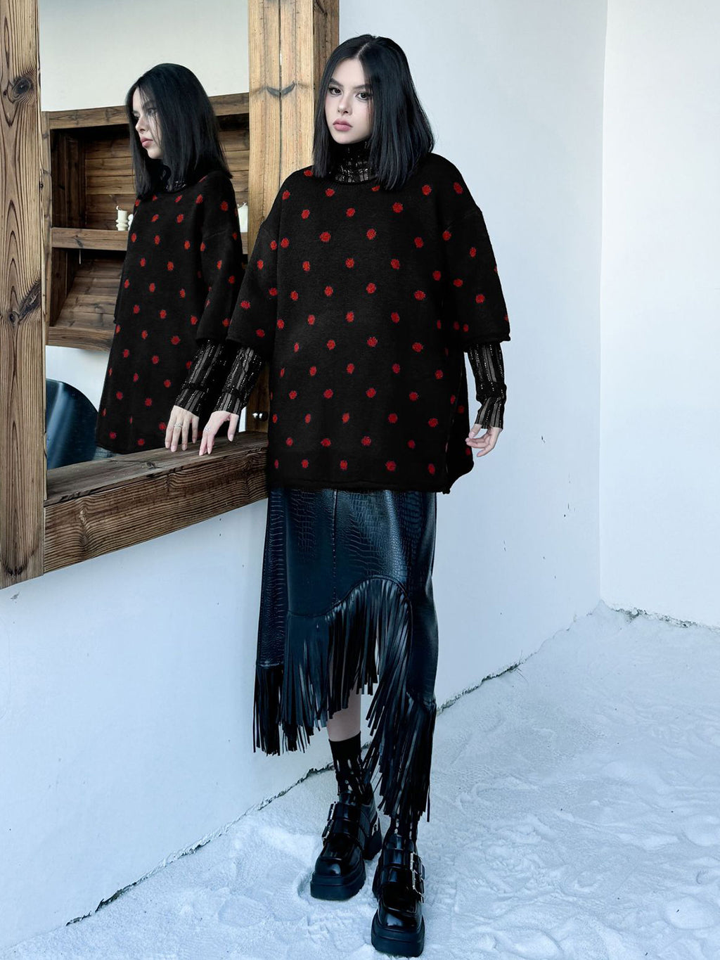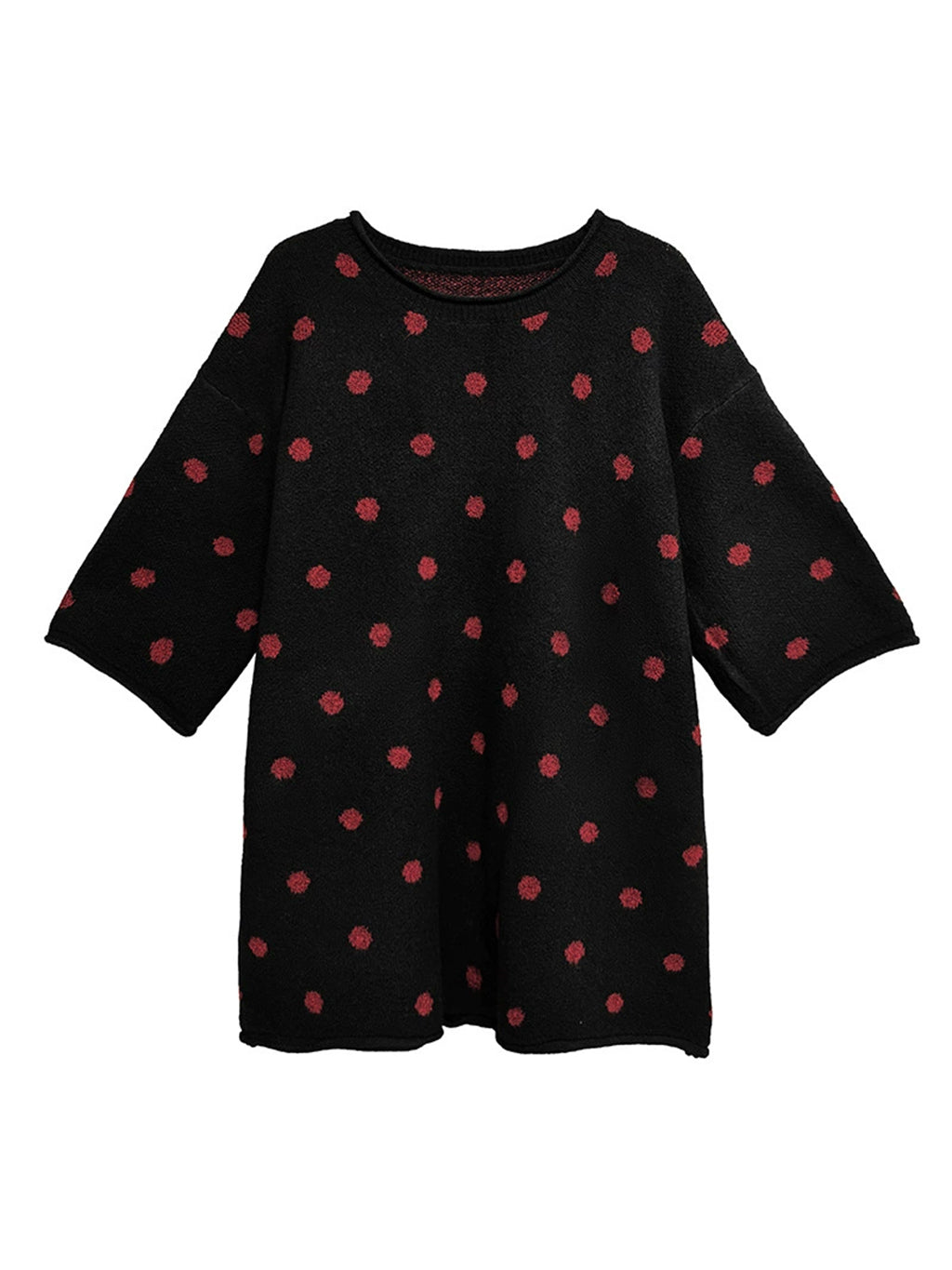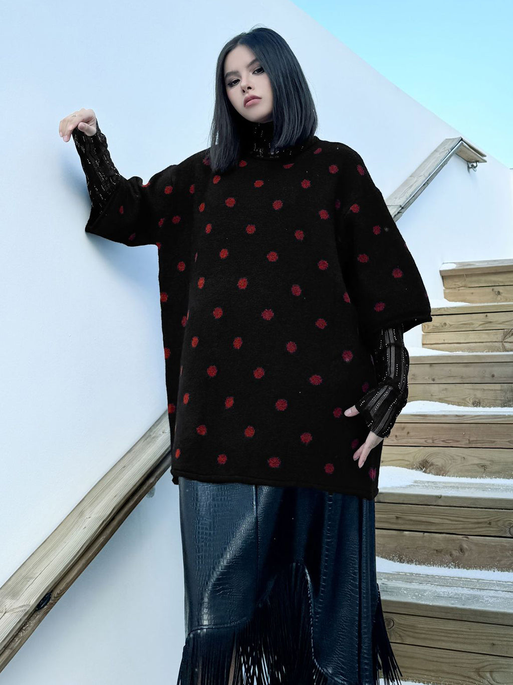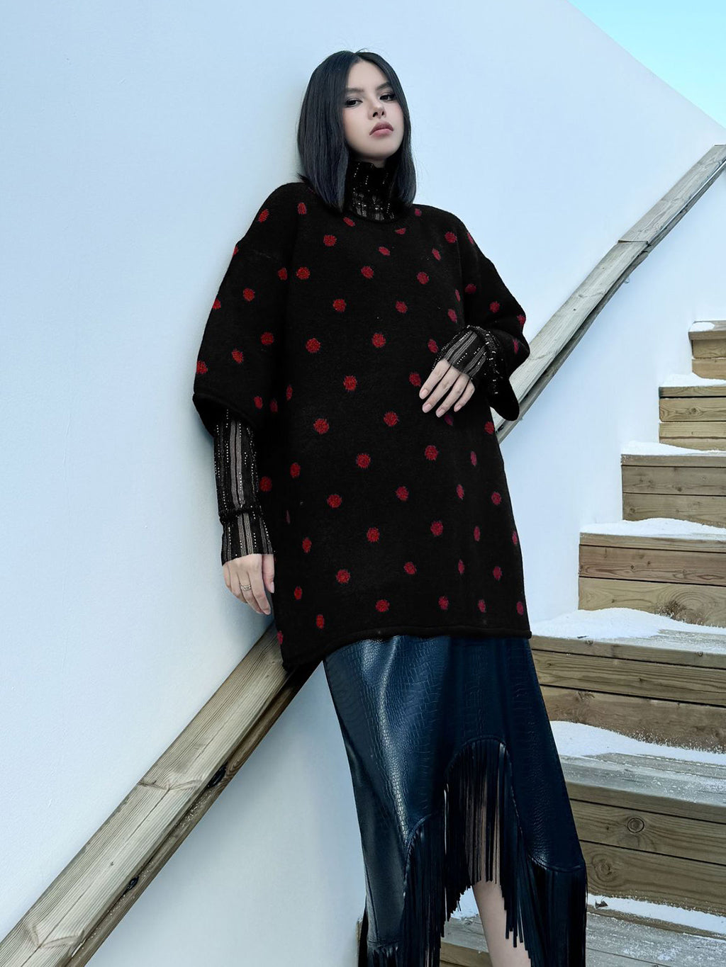 表面にフロッキープロセスでドットを散りばめた立体ニットトップ。短めの袖とゆとりのあるワイドシルエットが絶妙なバランスを生み、インナーとのレイヤードにも適した構成。ベースは軽やかなコットンウールで仕立てられ、暖かさと通気性を両立。滑らかな編み地に浮かぶドットの凹凸が光を受けて表情を変え、ミニマルなフォルムに遊びを添える。
