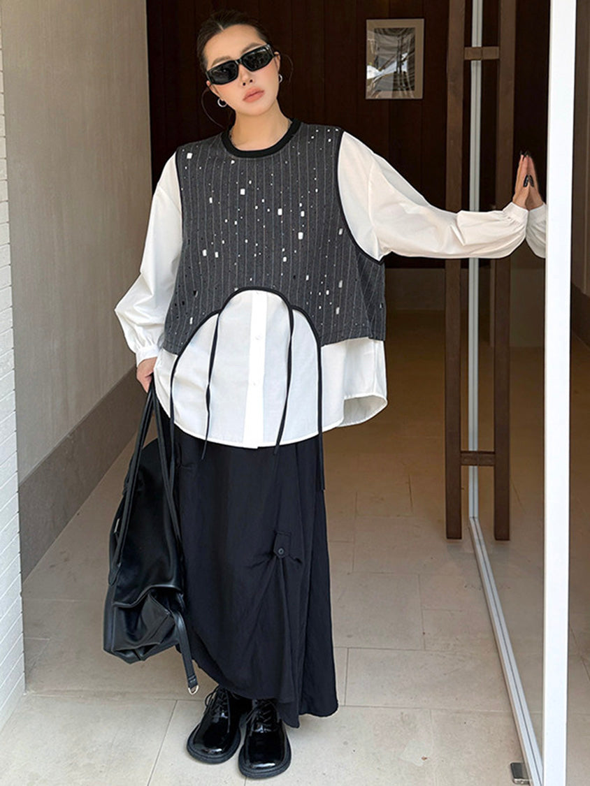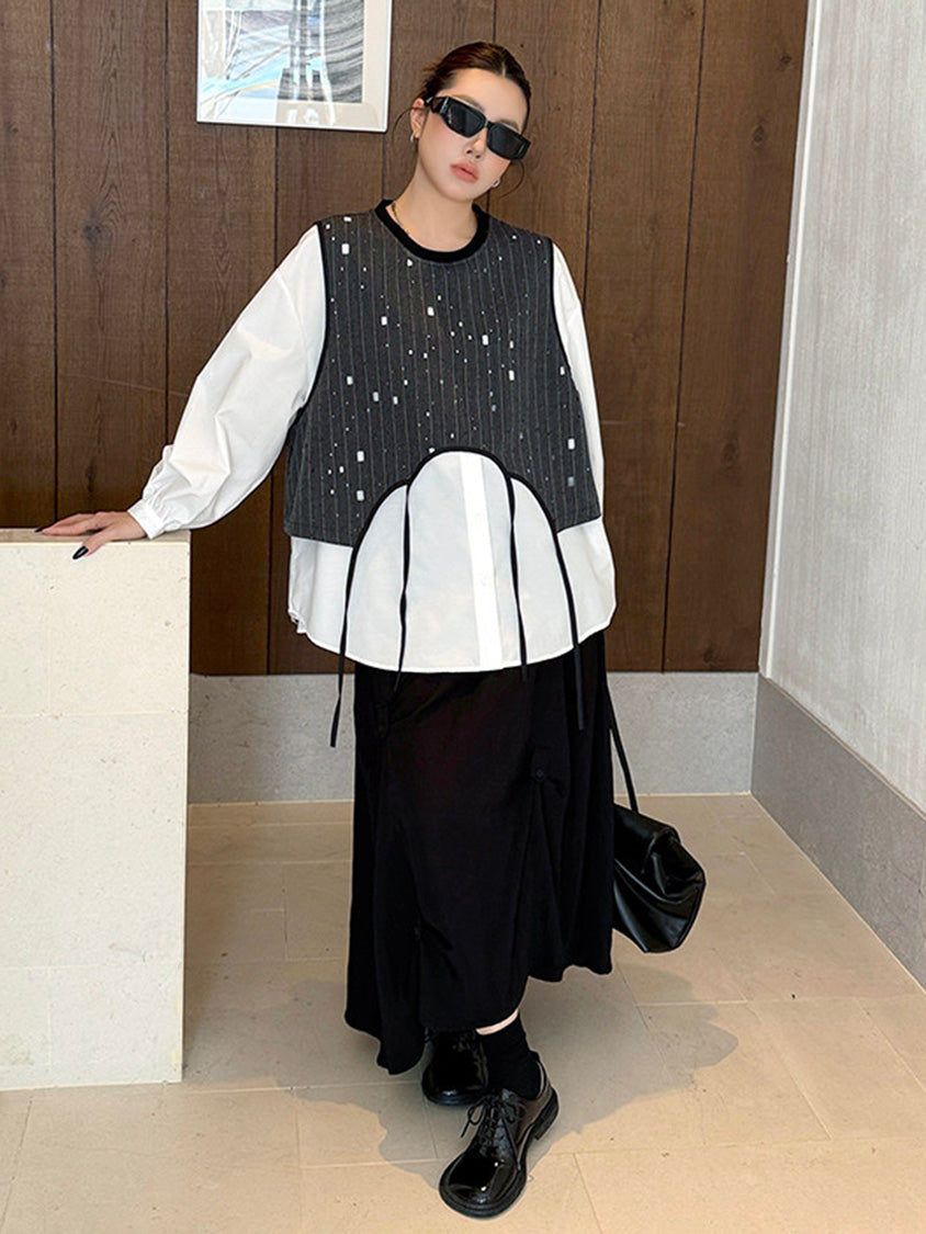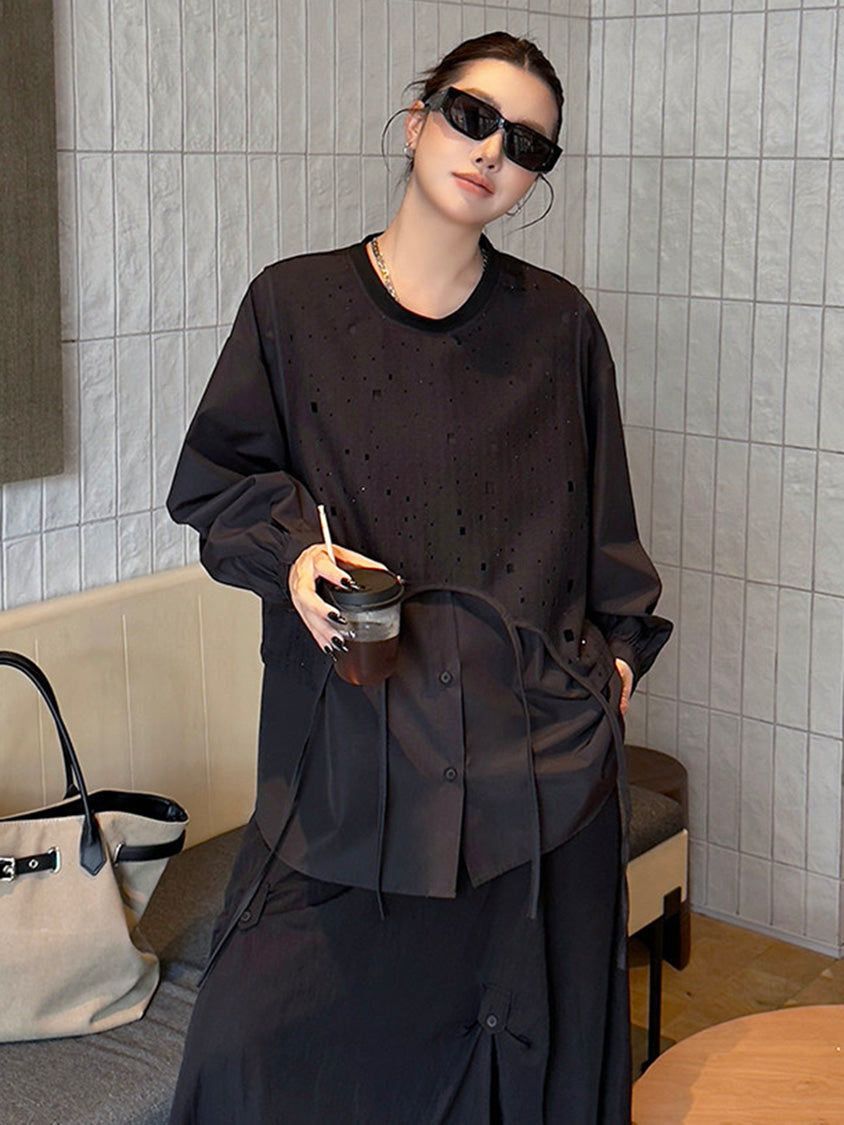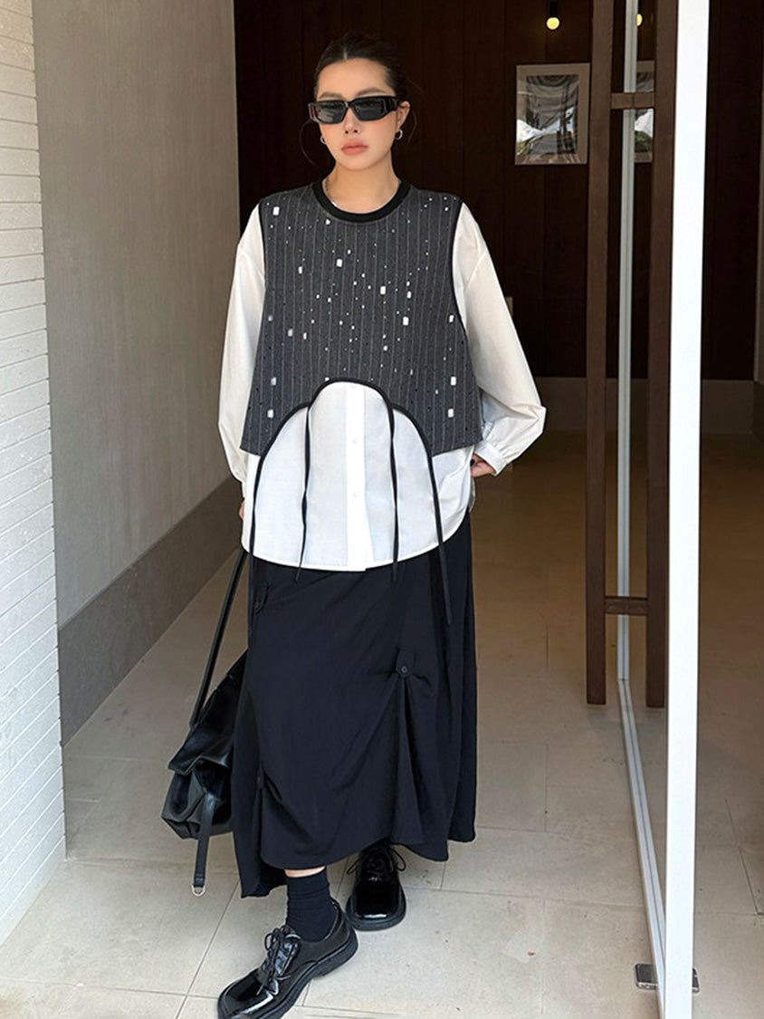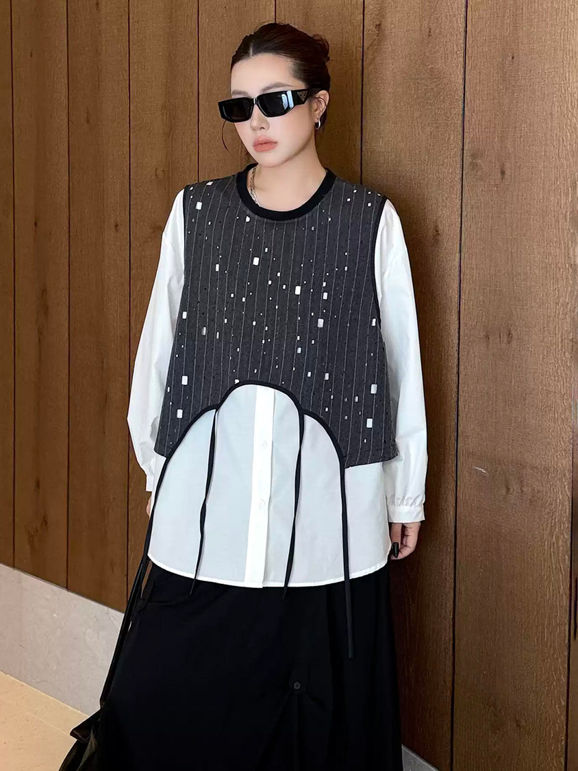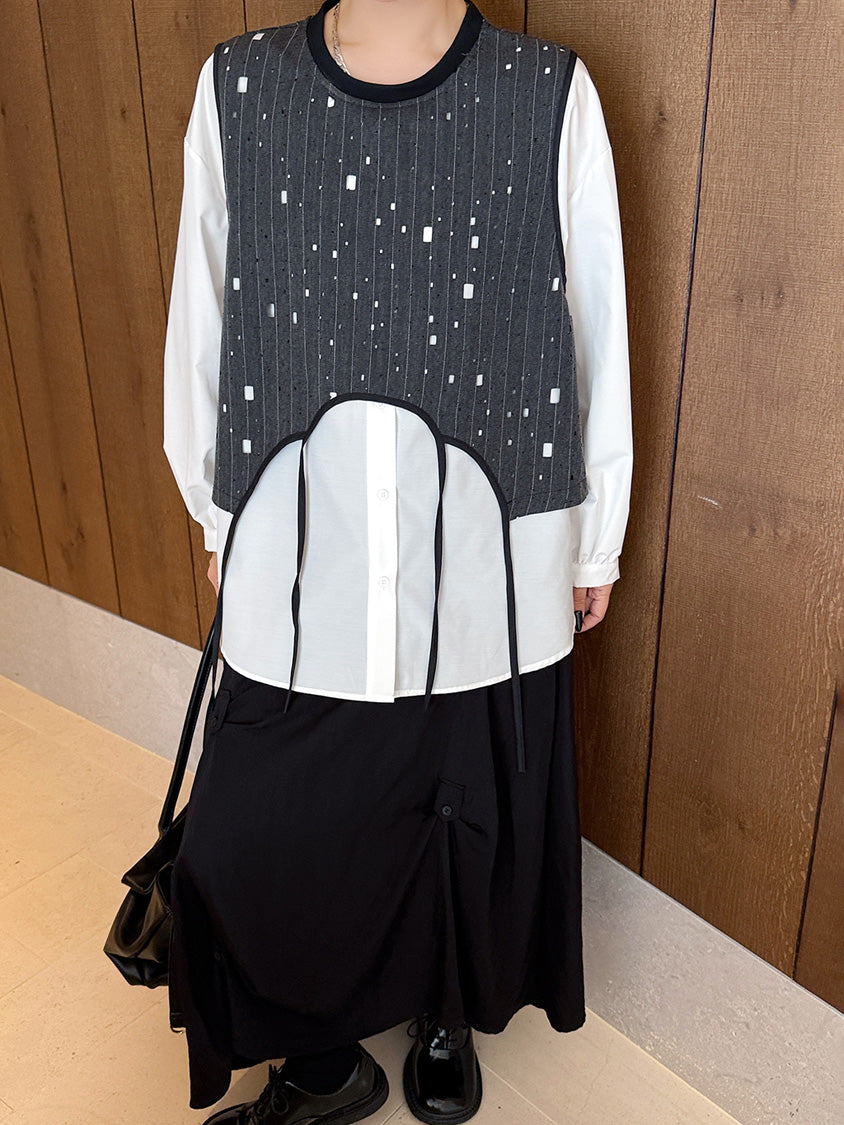 縦のストライプを基調に、リズムあるスクエア調の配置が奥行きを描くトップラインと、シャツ構造を重ねたような切り替え構成が視線を引き寄せる造形。胸元から裾へ流れる立体的なライン取りにより、動作に合わせて陰影が生まれる。フロントの切り替えカーブとドローコード調のディテールがレイヤード感を強調し、都会的でシャープなムードを形成。