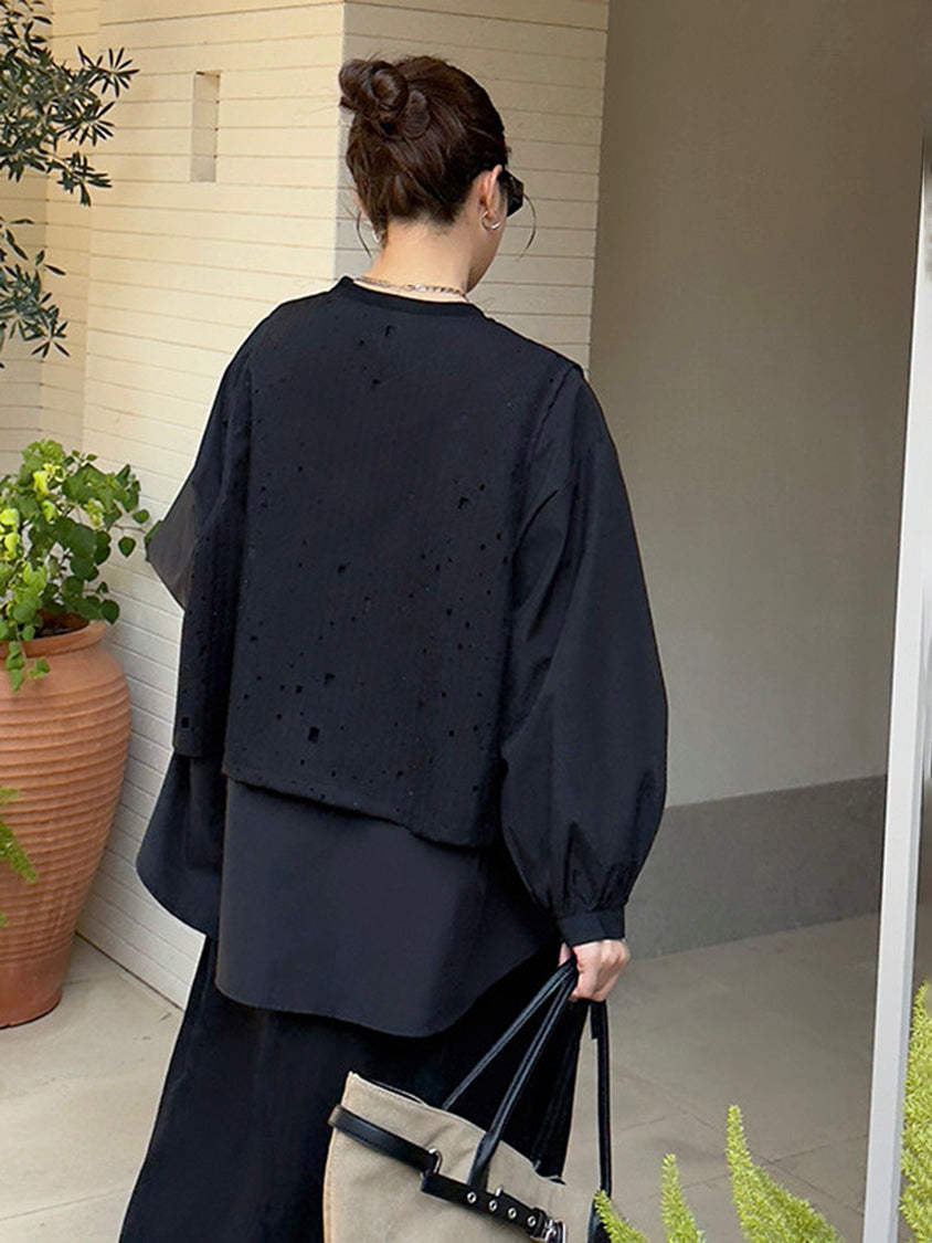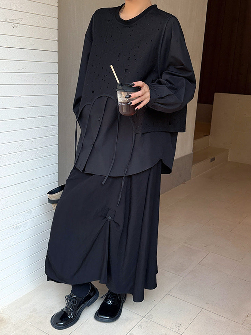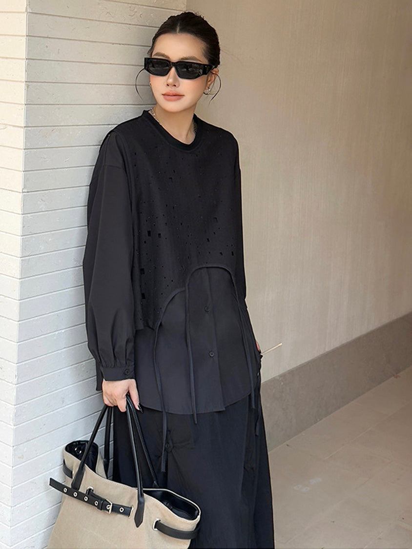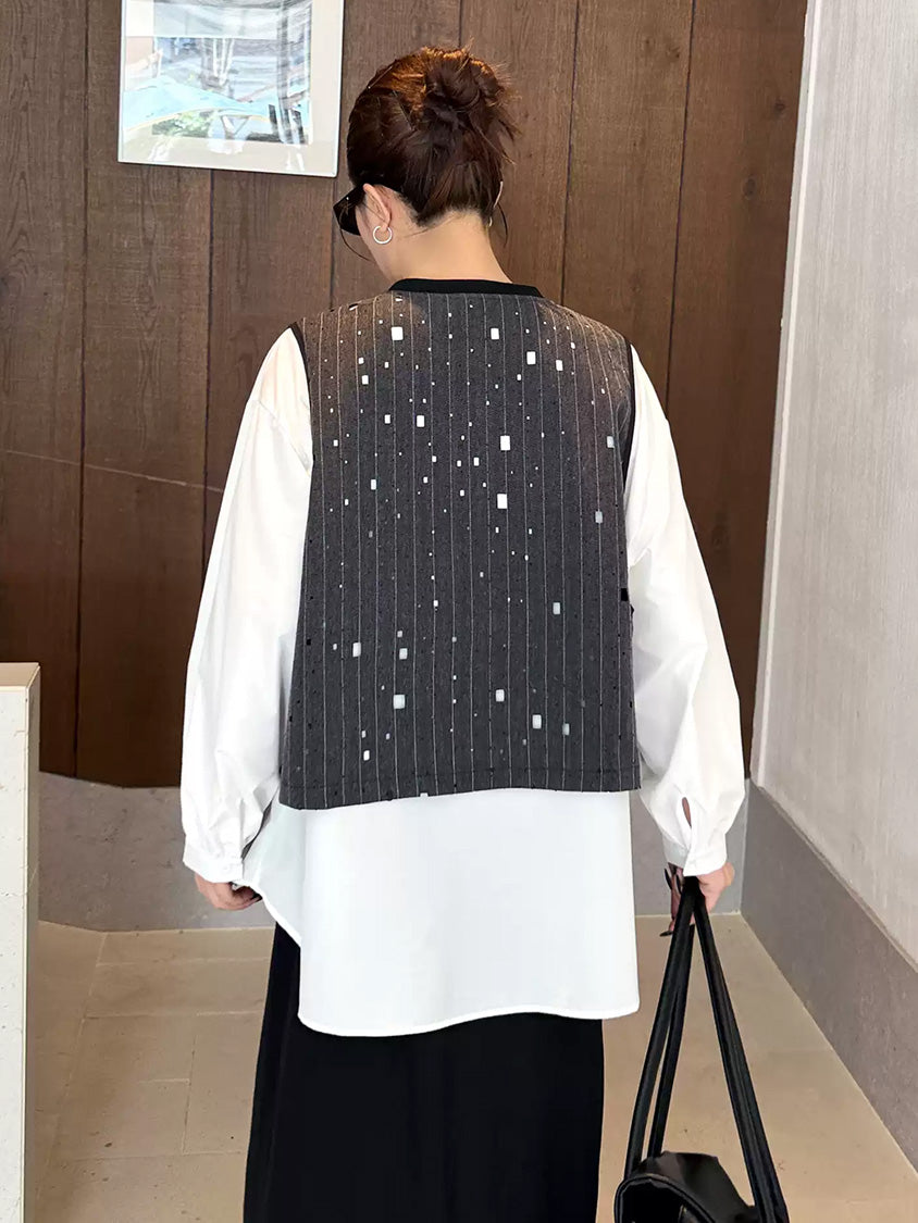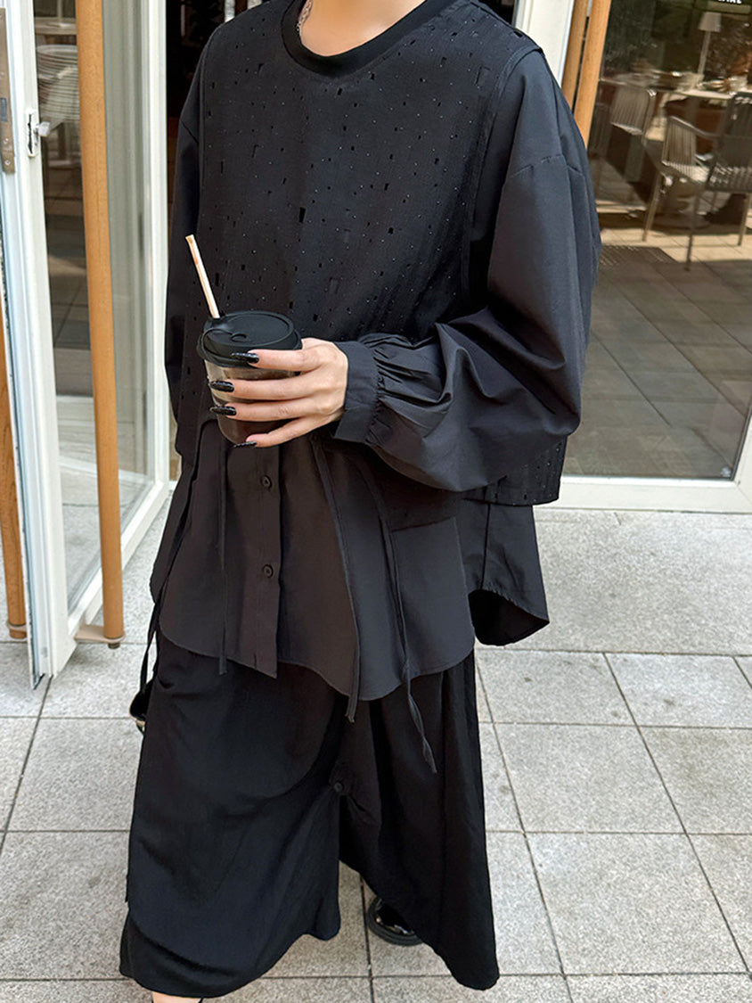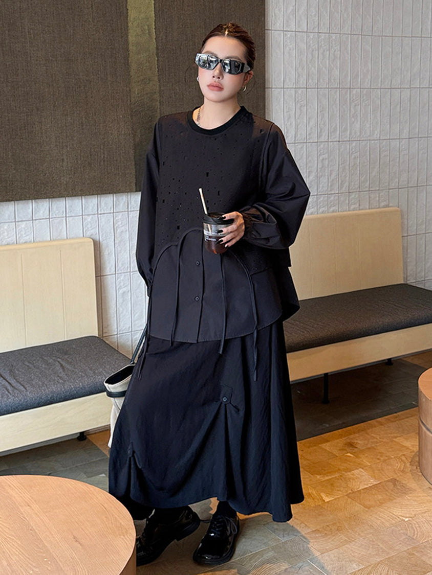 縦のストライプを基調に、リズムあるスクエア調の配置が奥行きを描くトップラインと、シャツ構造を重ねたような切り替え構成が視線を引き寄せる造形。胸元から裾へ流れる立体的なライン取りにより、動作に合わせて陰影が生まれる。フロントの切り替えカーブとドローコード調のディテールがレイヤード感を強調し、都会的でシャープなムードを形成。