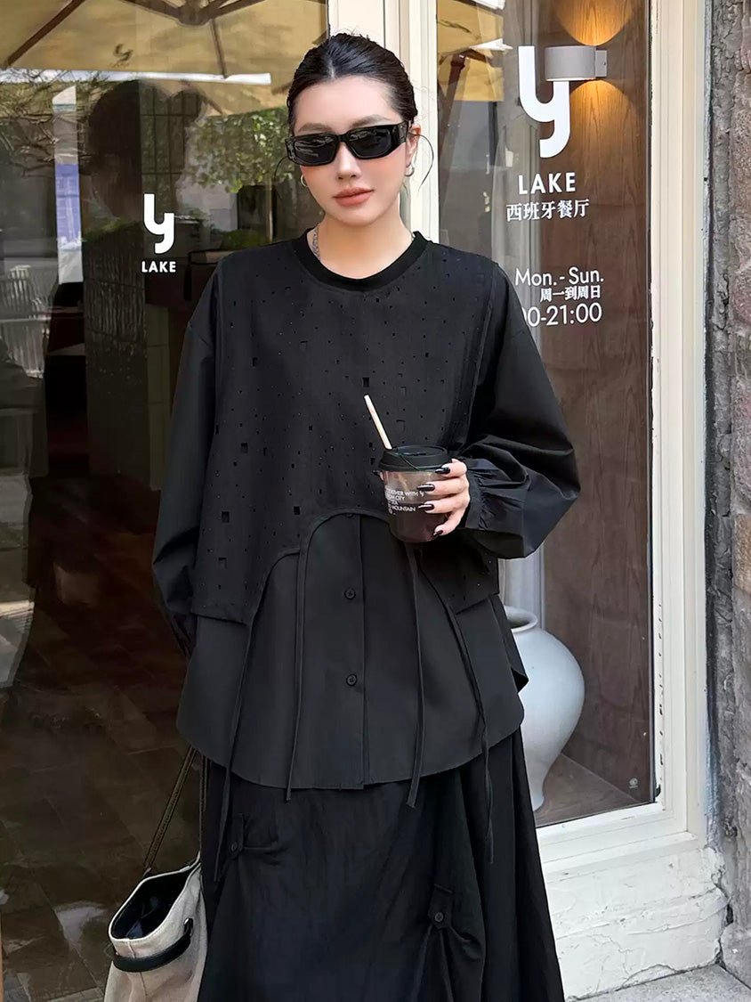 縦のストライプを基調に、リズムあるスクエア調の配置が奥行きを描くトップラインと、シャツ構造を重ねたような切り替え構成が視線を引き寄せる造形。胸元から裾へ流れる立体的なライン取りにより、動作に合わせて陰影が生まれる。フロントの切り替えカーブとドローコード調のディテールがレイヤード感を強調し、都会的でシャープなムードを形成。