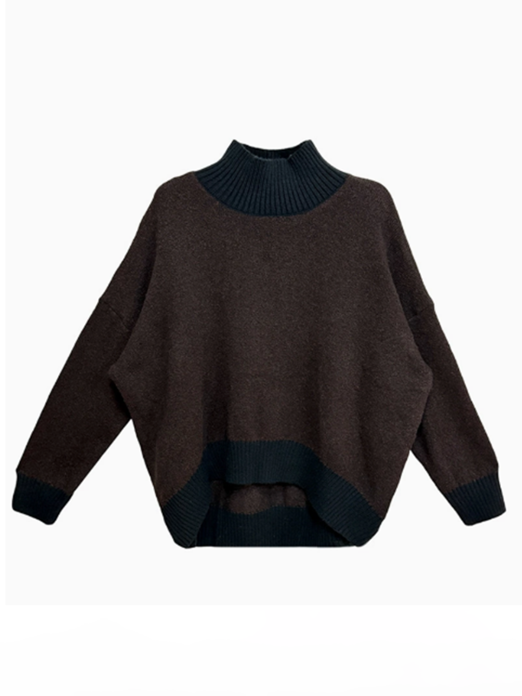 ゆるやかなシルエットにリブ切り替えを効かせた構成で、首元にはレイヤード見えするネックデザインを組み合わせた構築。肩線を落とした形状が全体に余白を生み、裾のカーブラインが動きに合わせて柔らかい表情をつくる。落ち着いた質感のニットでまとめ、幅のある袖口リブがバランスを整える仕上がり。
