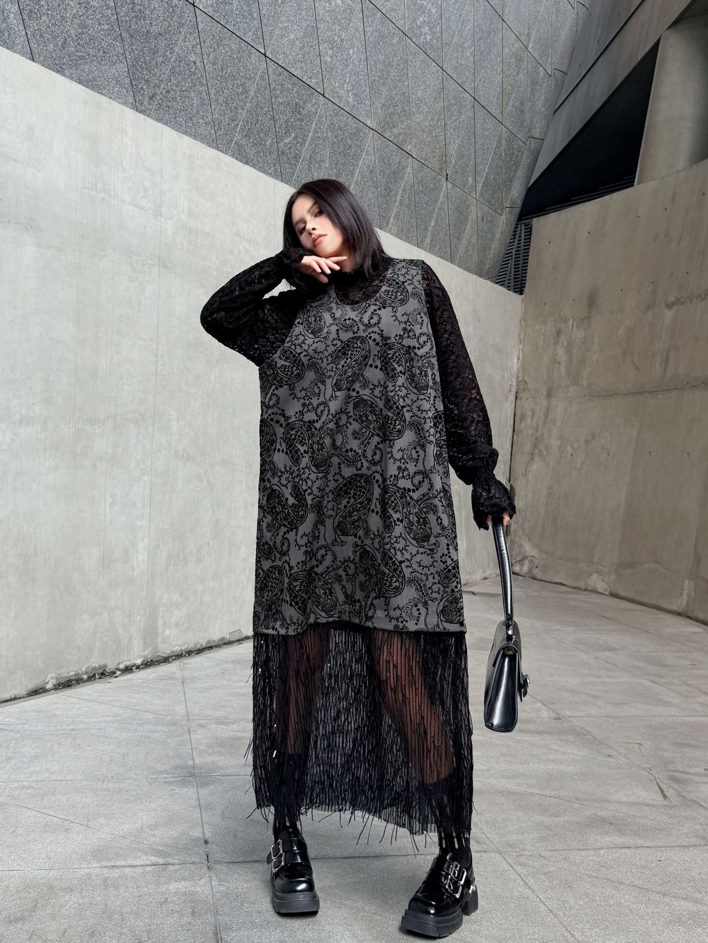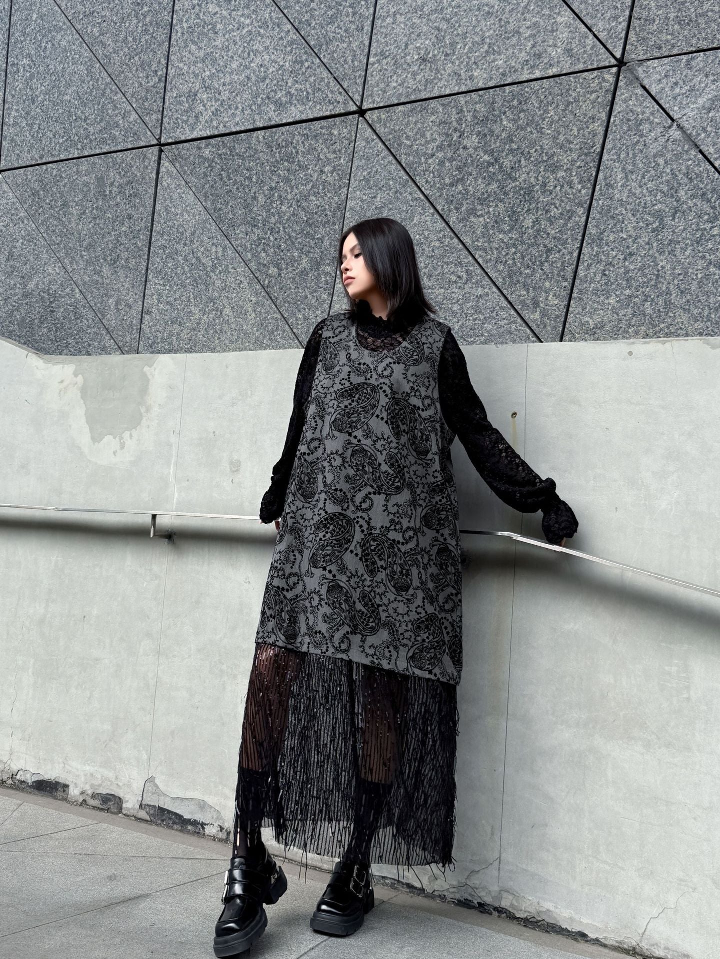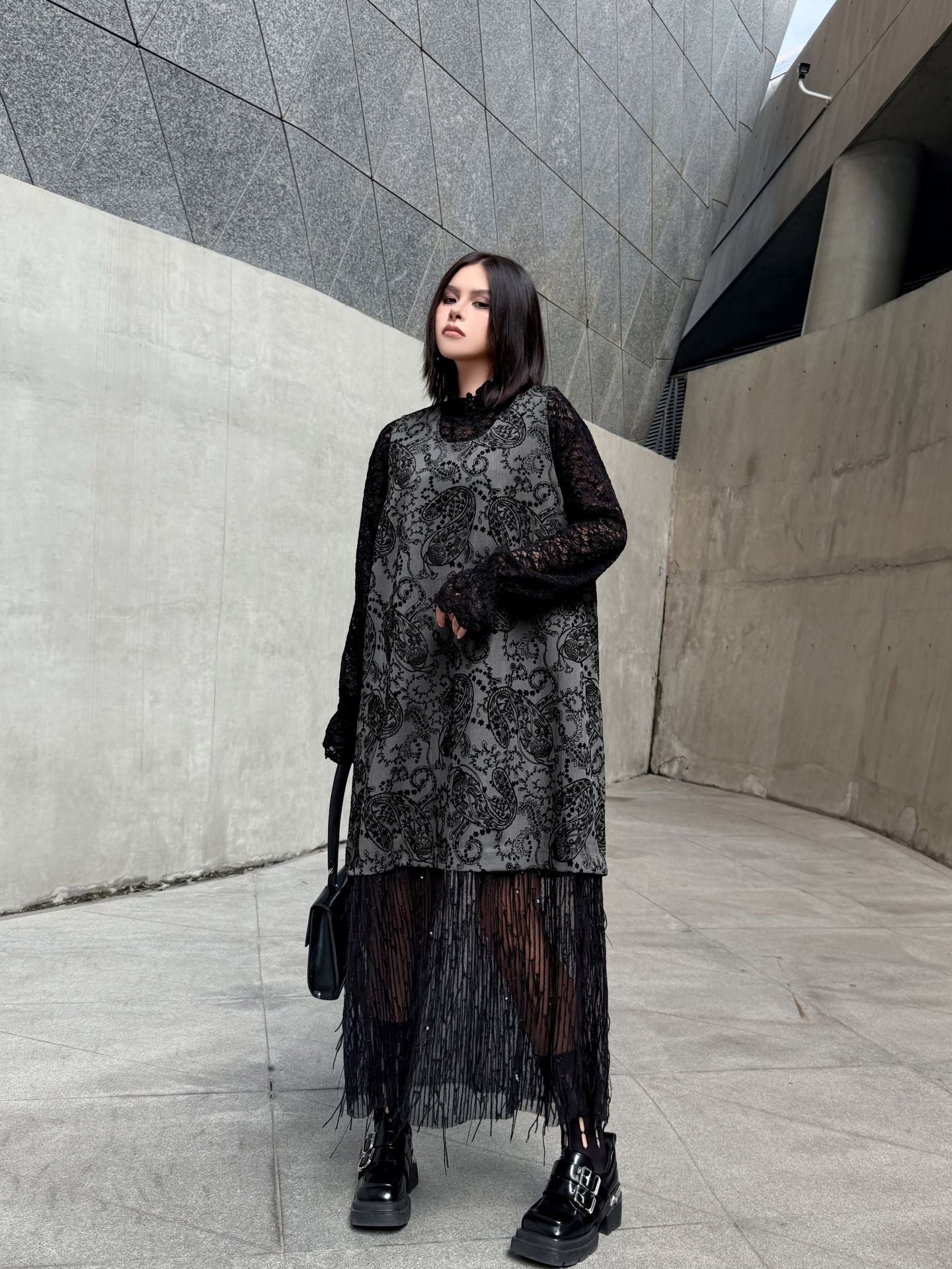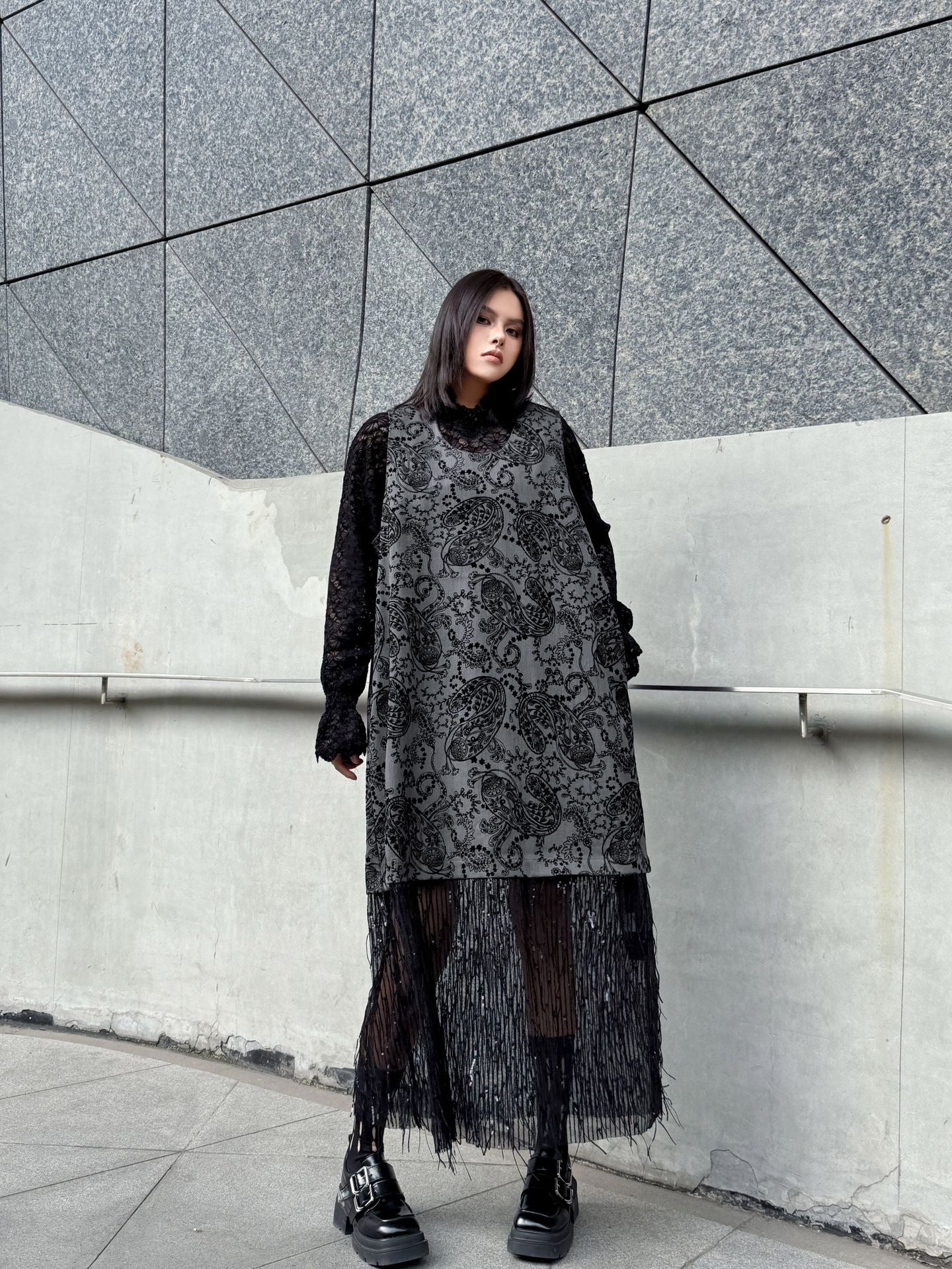 立体的な刺繍模様を施したドレスと、繊細なレーストップスを組み合わせたシリーズ。ノースリーブのドレスは下部にフリンジをあしらい、歩くたびに揺れるラインがモードな印象を生む。軽やかな透け感のトップスはフリルネックとスリーブのスカラップが特徴で、単体でも存在感を放つ構築的デザイン。異素材の重なりが奥行きを作り、陰影と質感で魅せる独自のコントラストを表現。