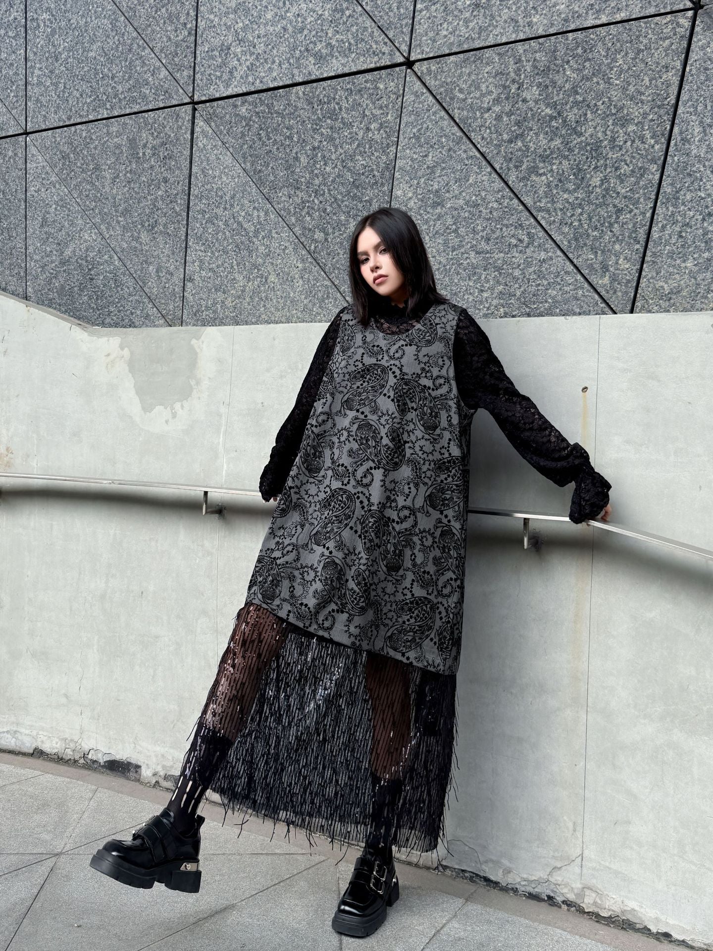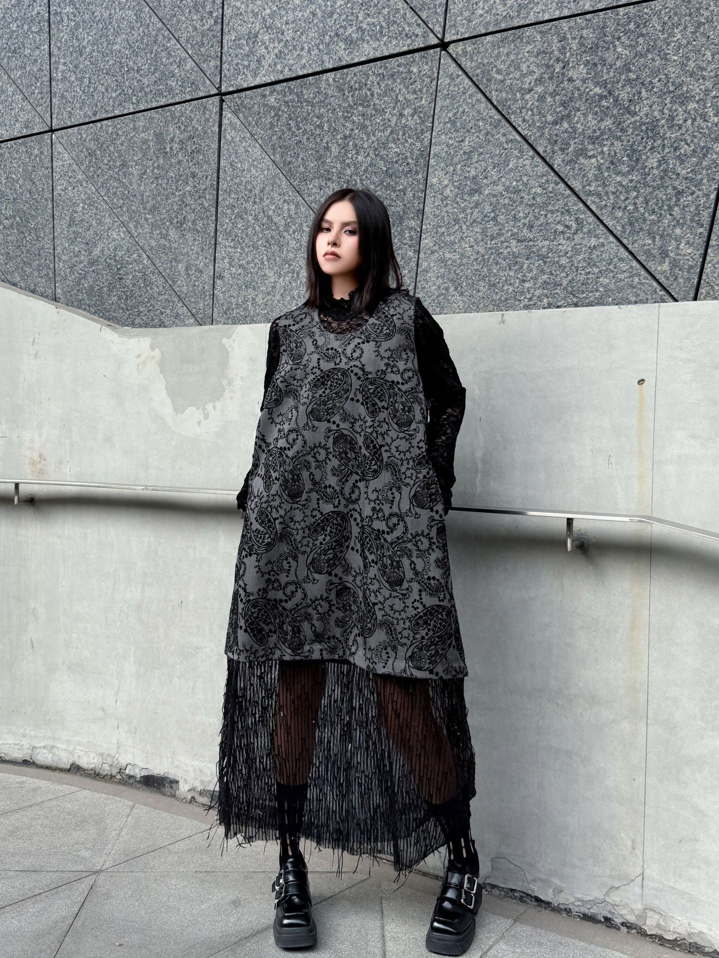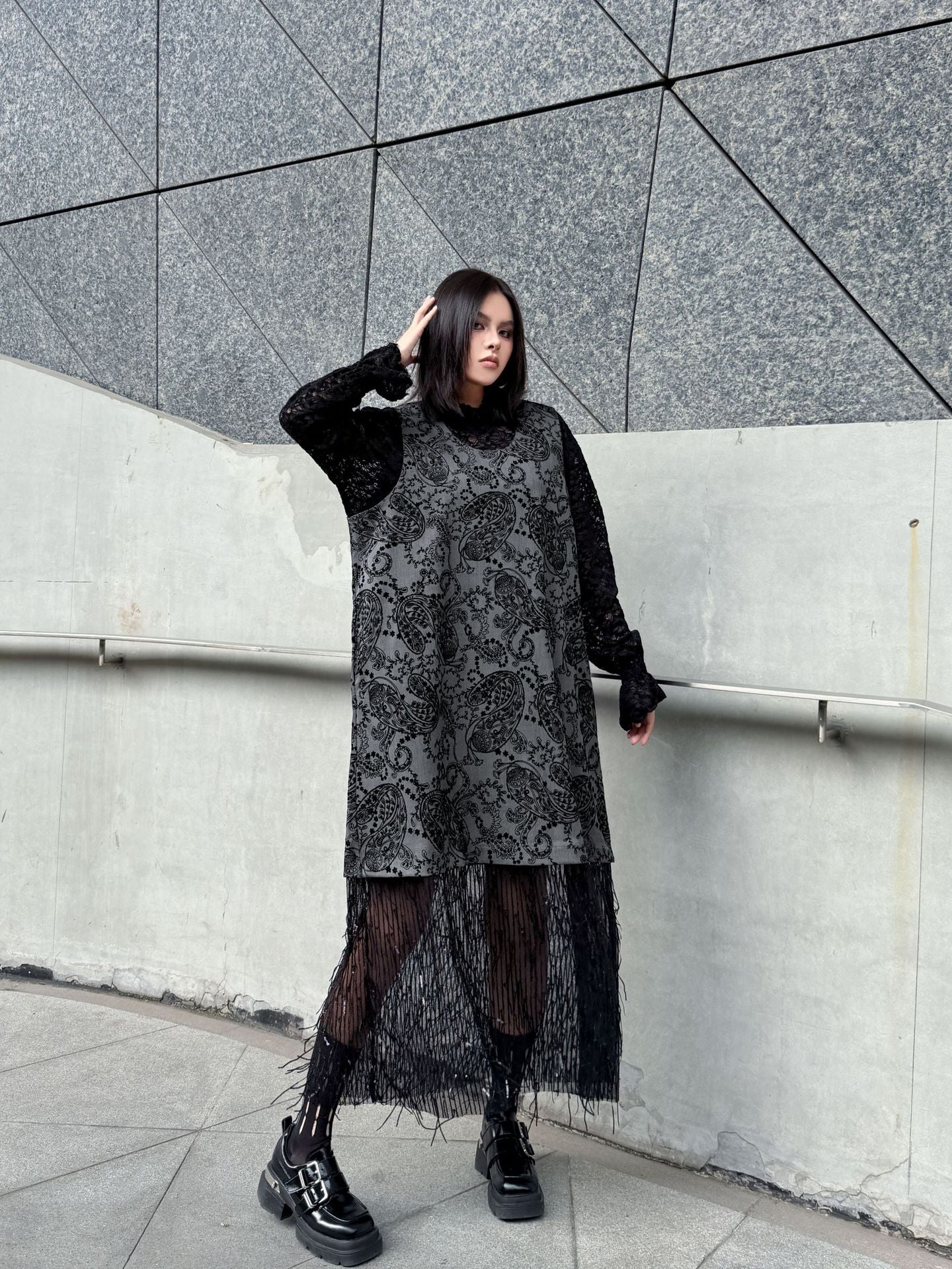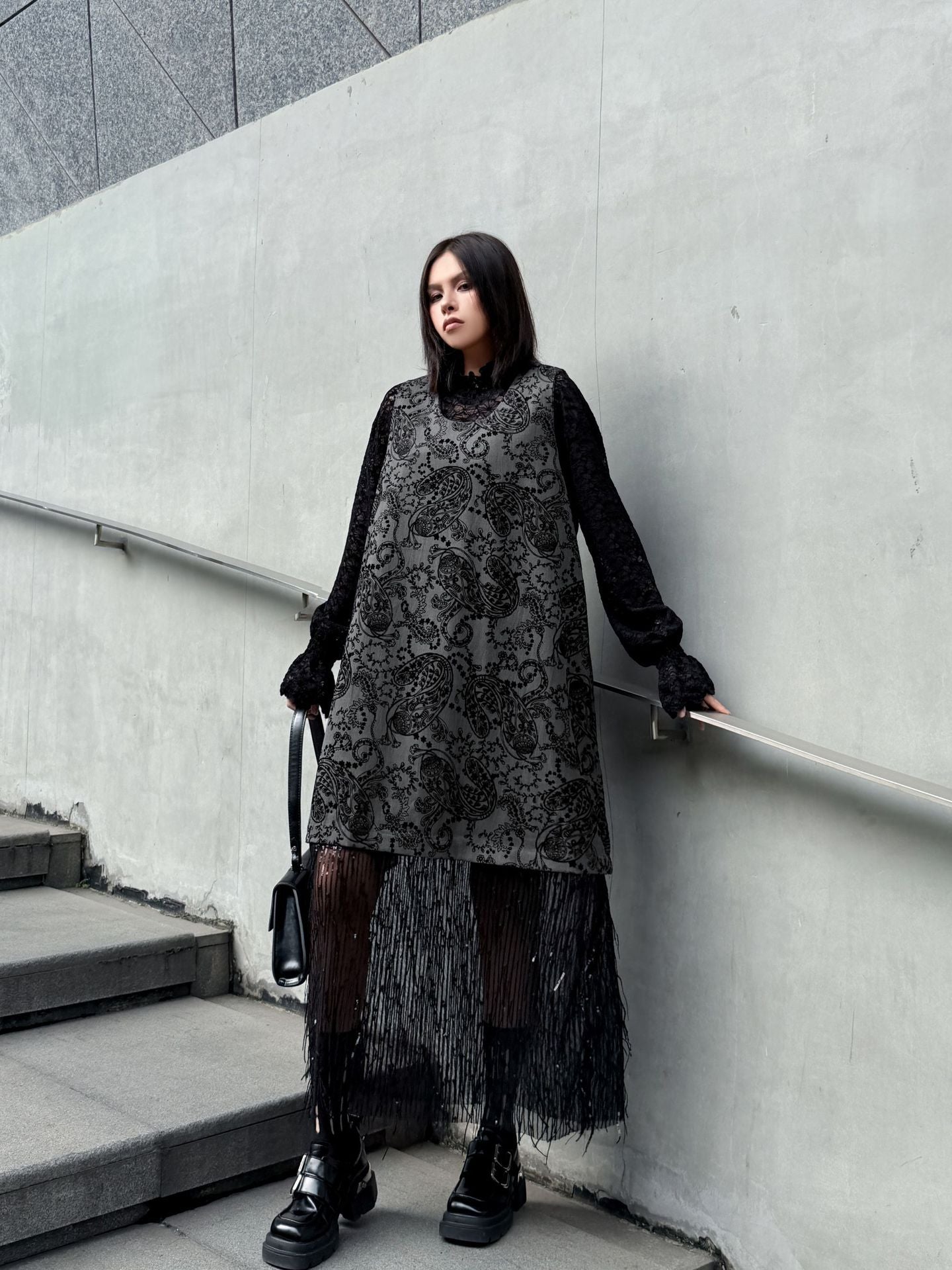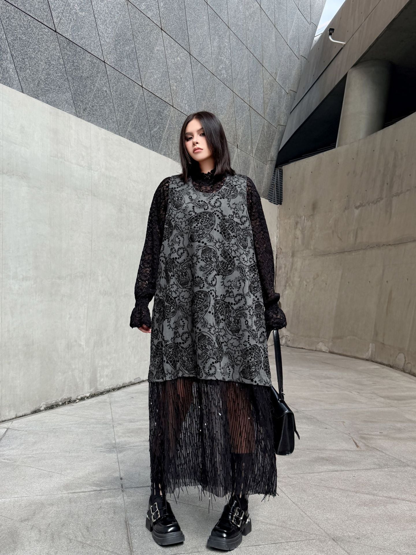 立体的な刺繍模様を施したドレスと、繊細なレーストップスを組み合わせたシリーズ。ノースリーブのドレスは下部にフリンジをあしらい、歩くたびに揺れるラインがモードな印象を生む。軽やかな透け感のトップスはフリルネックとスリーブのスカラップが特徴で、単体でも存在感を放つ構築的デザイン。異素材の重なりが奥行きを作り、陰影と質感で魅せる独自のコントラストを表現。