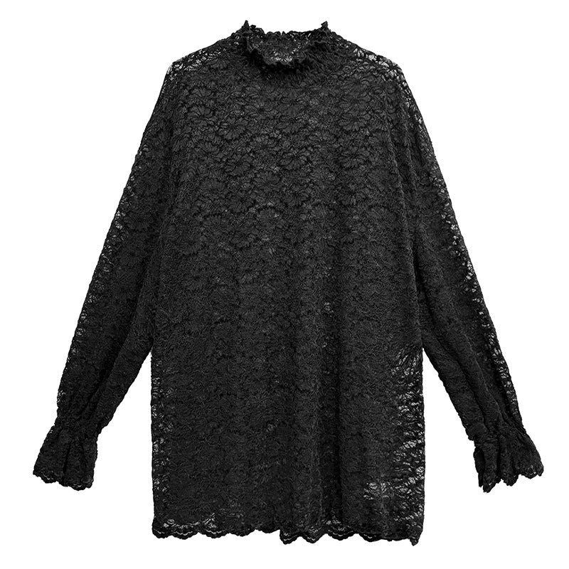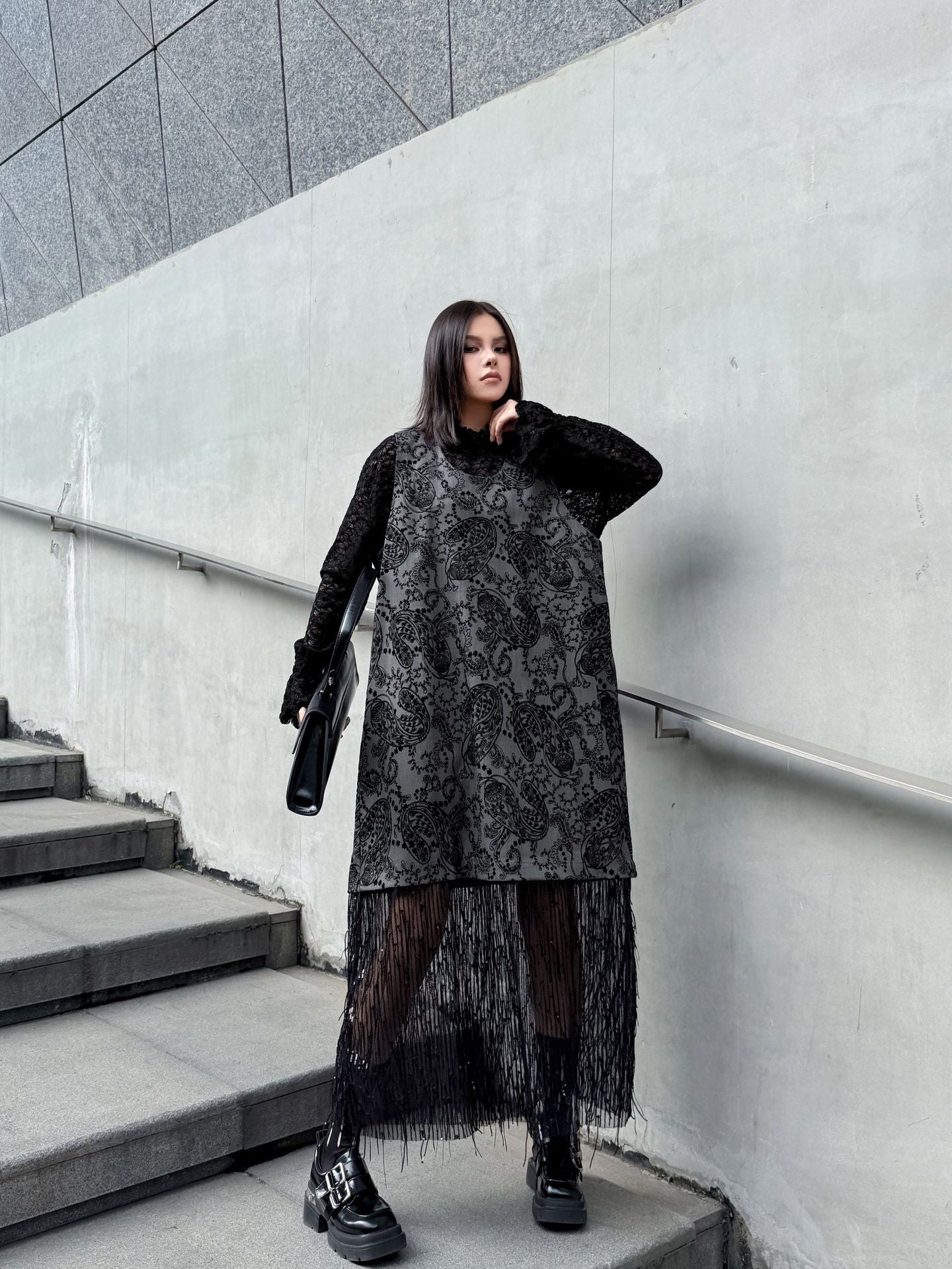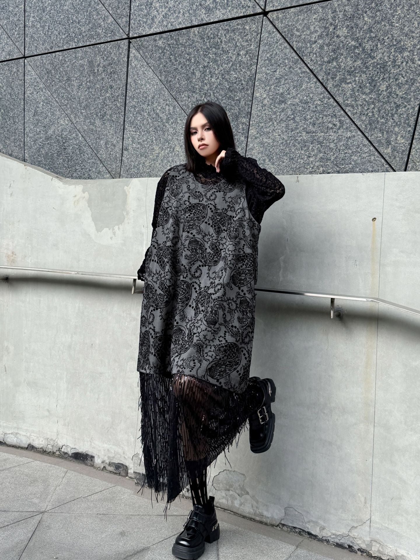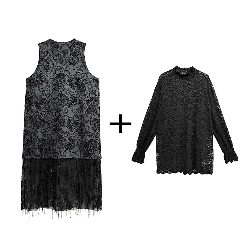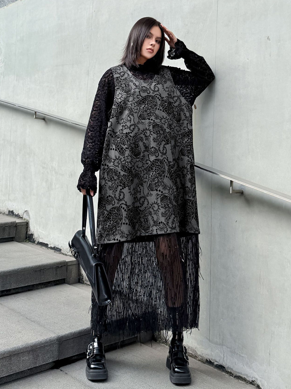 立体的な刺繍模様を施したドレスと、繊細なレーストップスを組み合わせたシリーズ。ノースリーブのドレスは下部にフリンジをあしらい、歩くたびに揺れるラインがモードな印象を生む。軽やかな透け感のトップスはフリルネックとスリーブのスカラップが特徴で、単体でも存在感を放つ構築的デザイン。異素材の重なりが奥行きを作り、陰影と質感で魅せる独自のコントラストを表現。