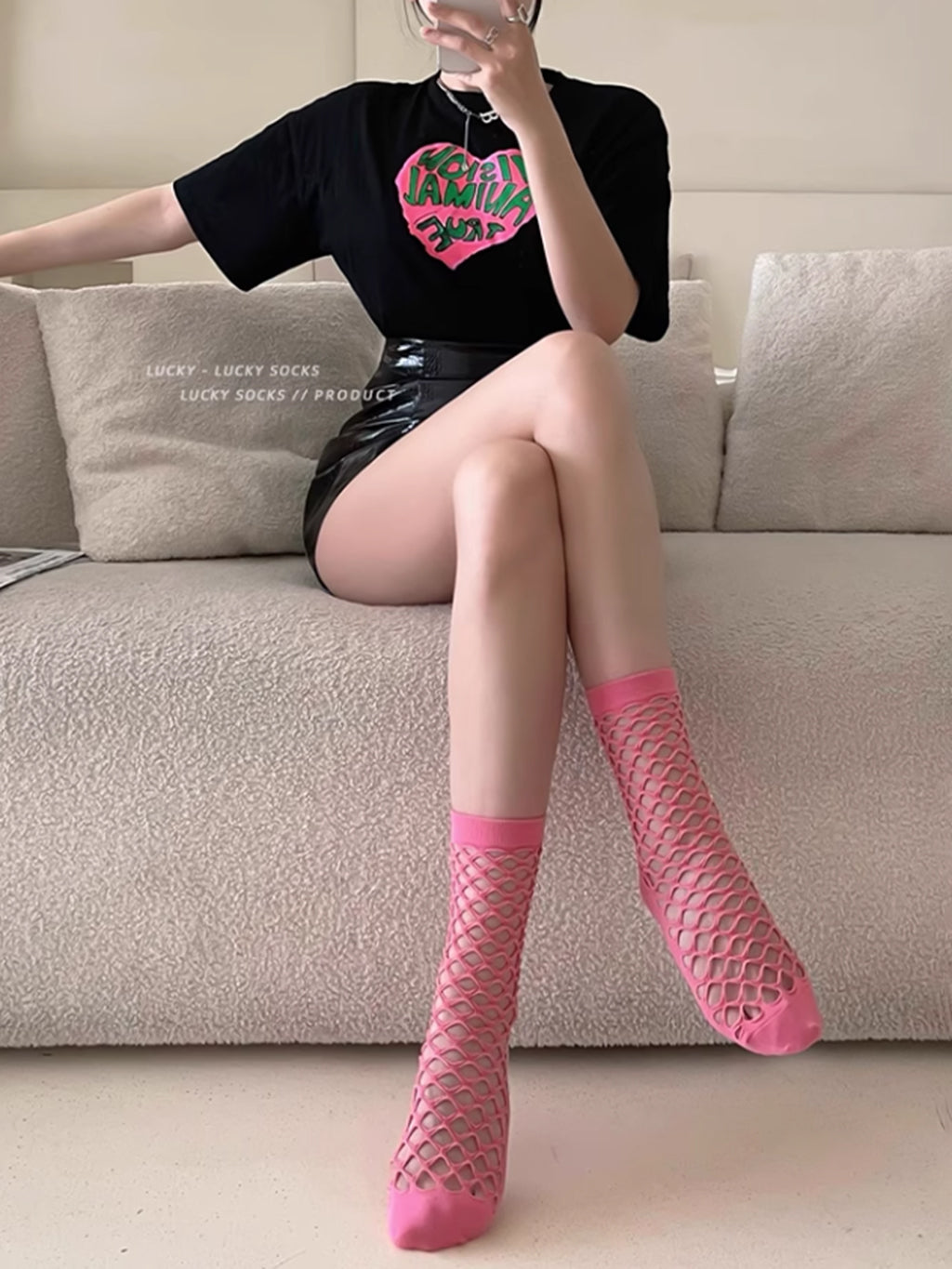 大胆な透け感が足元に個性を加えるフィッシュネットソックス。伸縮性に優れたソフトな素材で快適な履き心地を実現。トウ・かかと部分には切り替えが入り、デザイン性と耐久性を両立。ブラック、ホワイト、グリーン、ローズピンクの4色展開で、シンプルコーデのアクセントにもぴったり。スニーカーからサンダルまで幅広く合わせやすく、春夏のスタイルに抜け感をプラス。