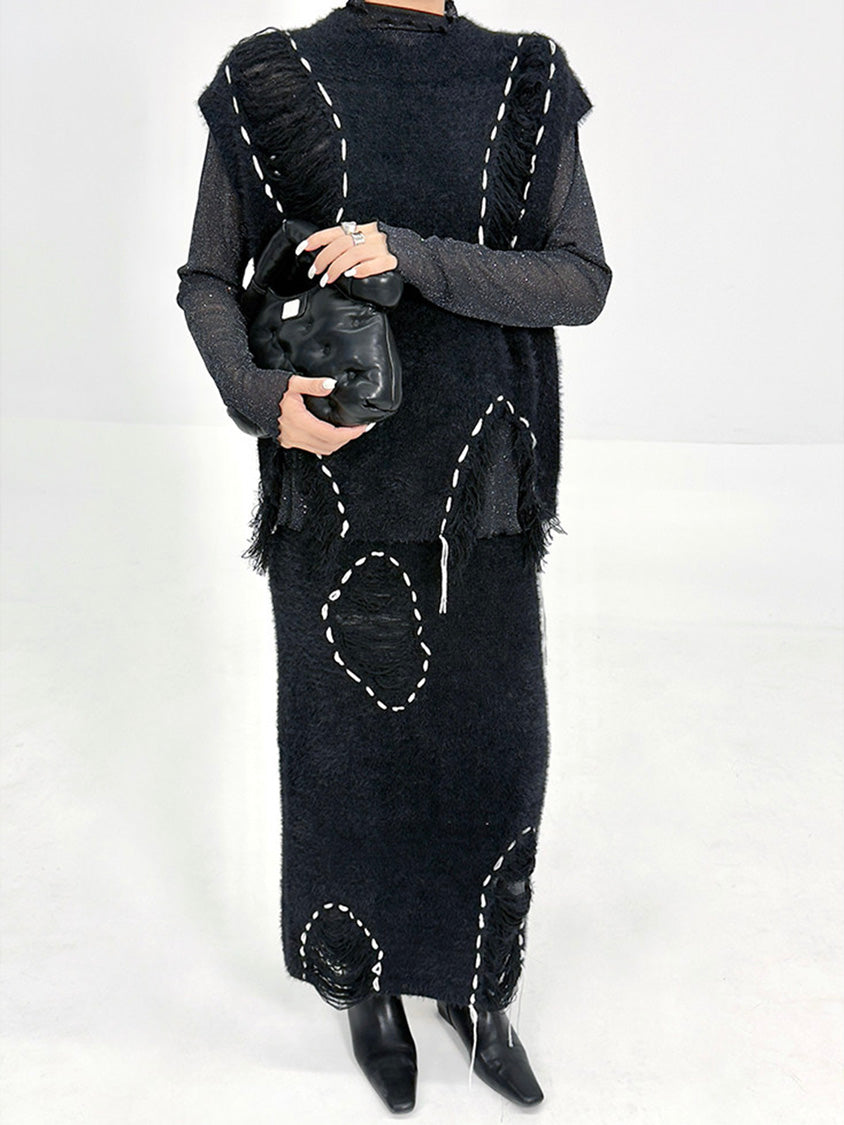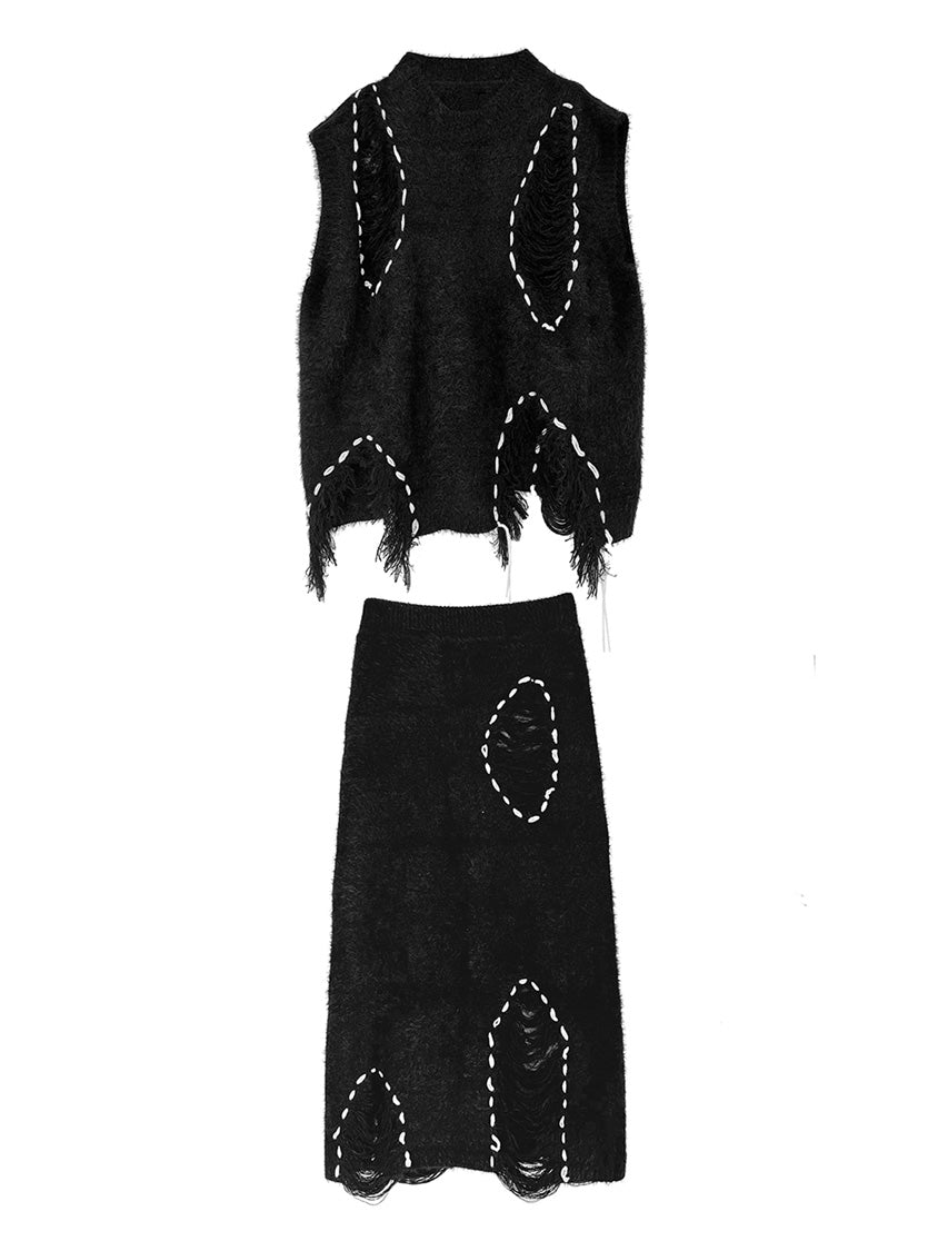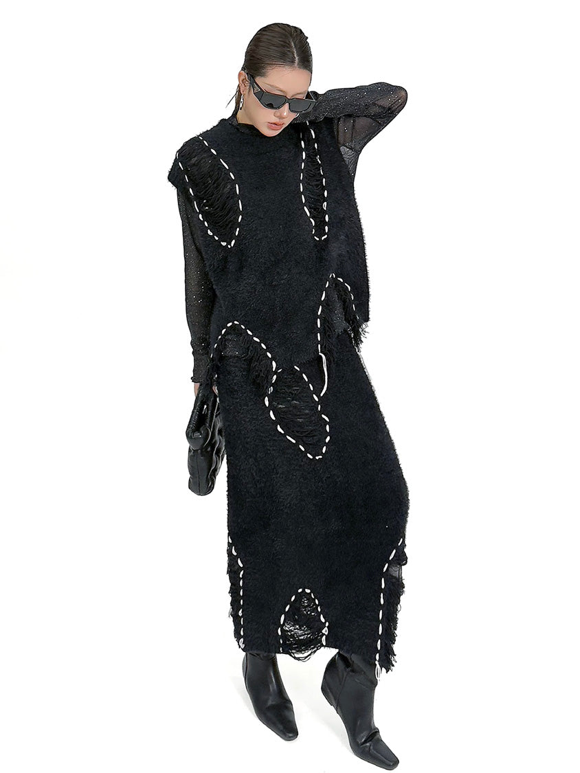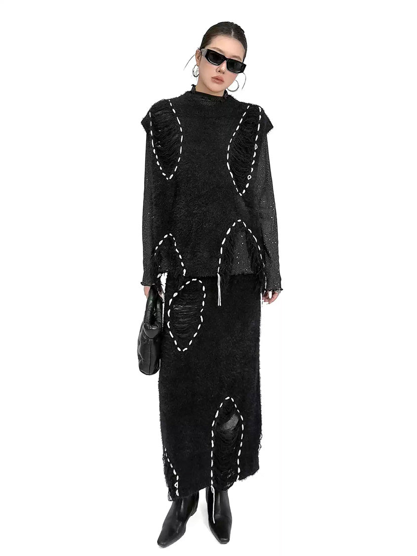 トップは起毛感のある表情を基調に、白糸によるステッチ風ディテールを点在させた構成。肩まわりから身頃にかけて自然な厚みを持たせ、立体的な輪郭を描く。スカートは同素材で統一し、縦方向に配置されたステッチモチーフが動きに合わせて陰影を生む設計。上下を通して質感とリズムを揃え、落ち着いたムードの中に奥行きを与える構成