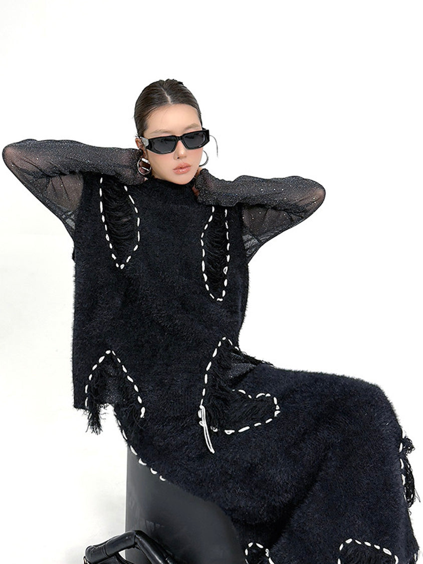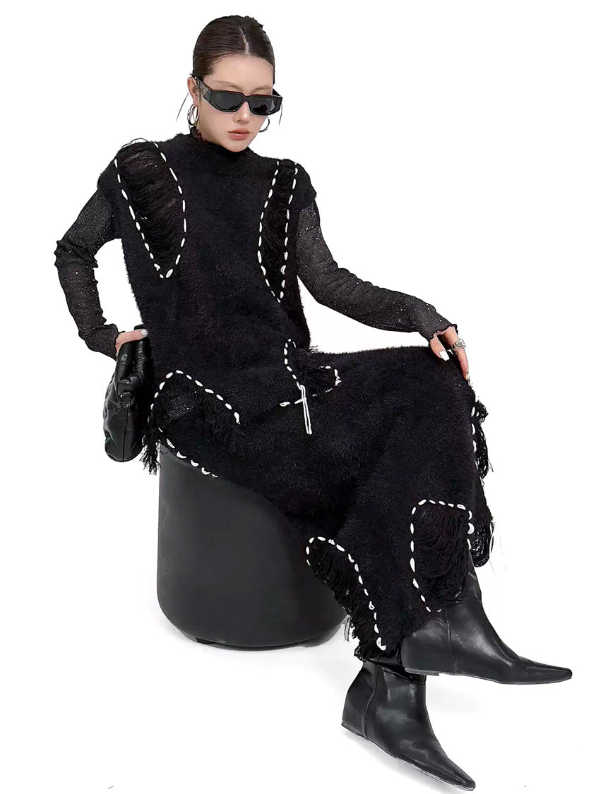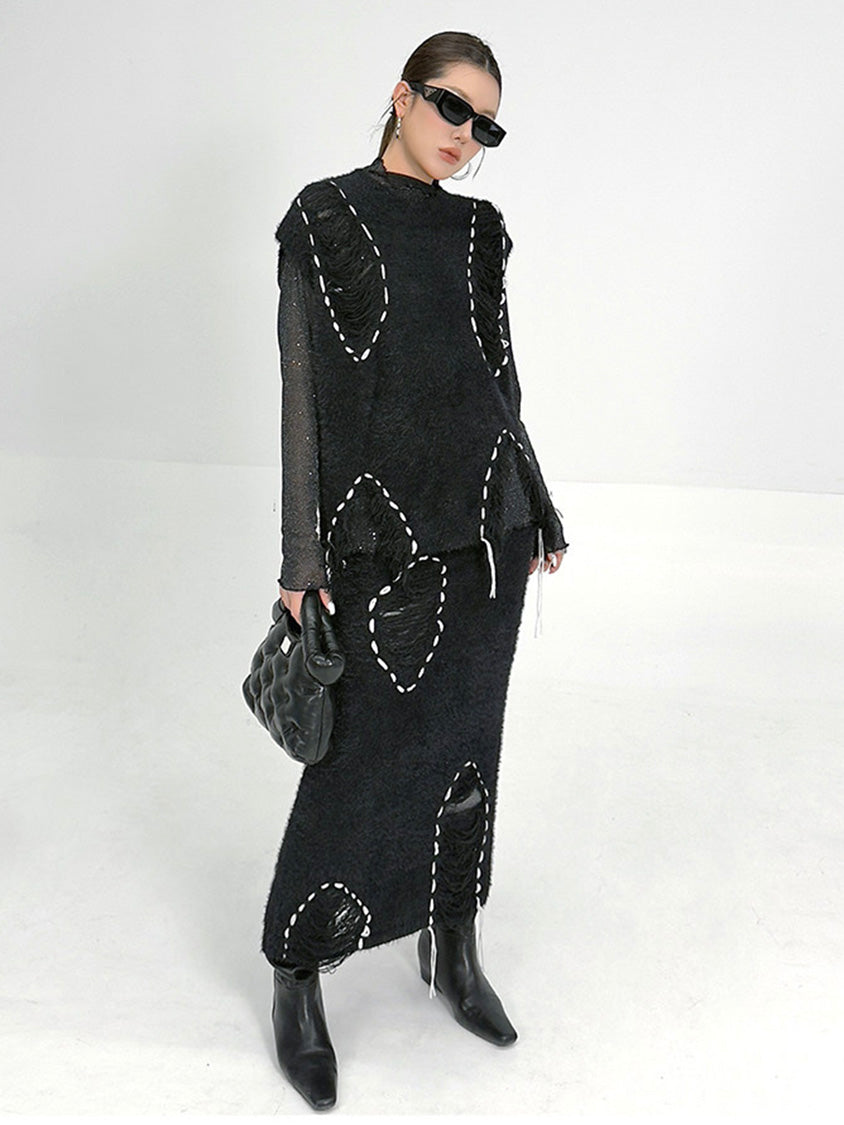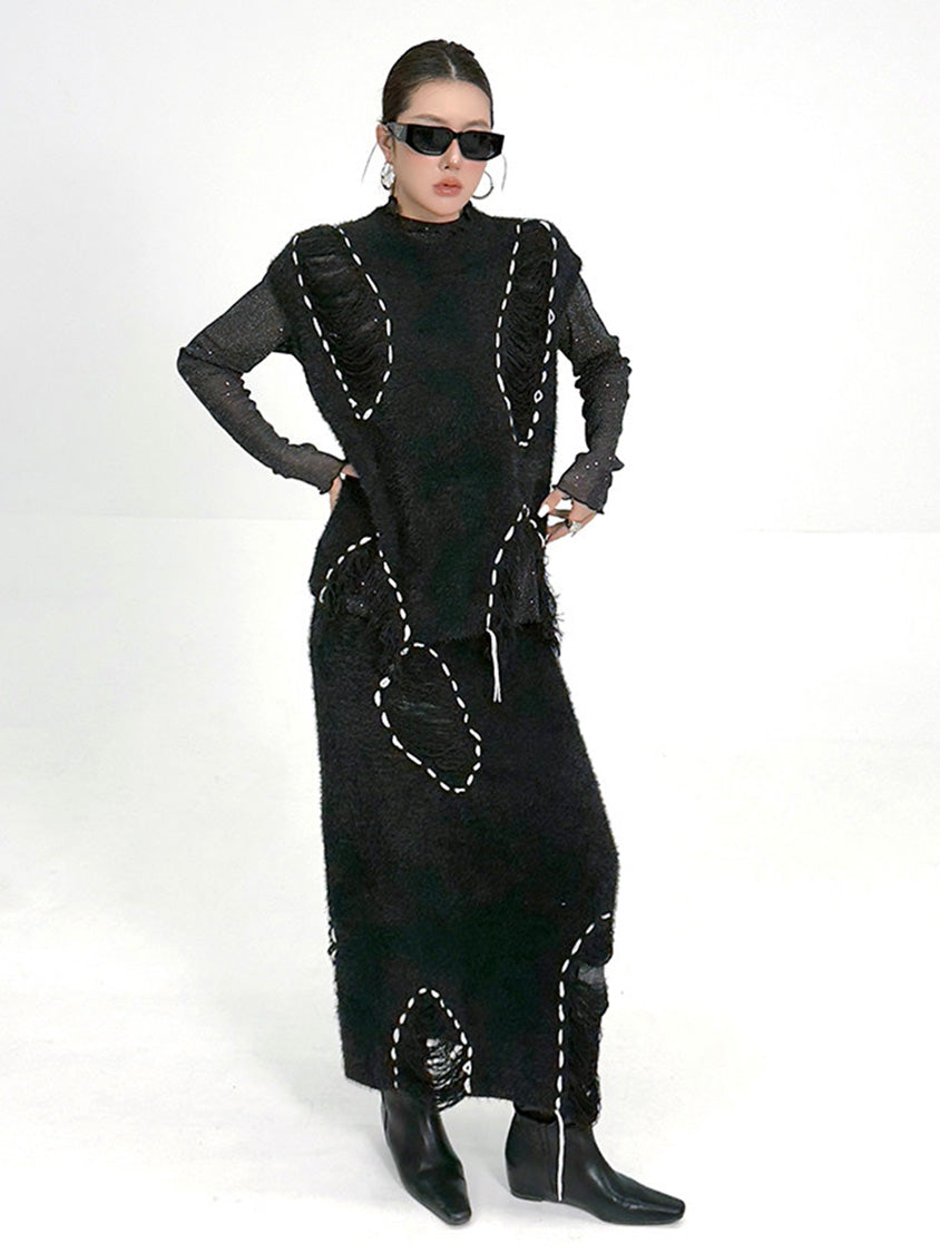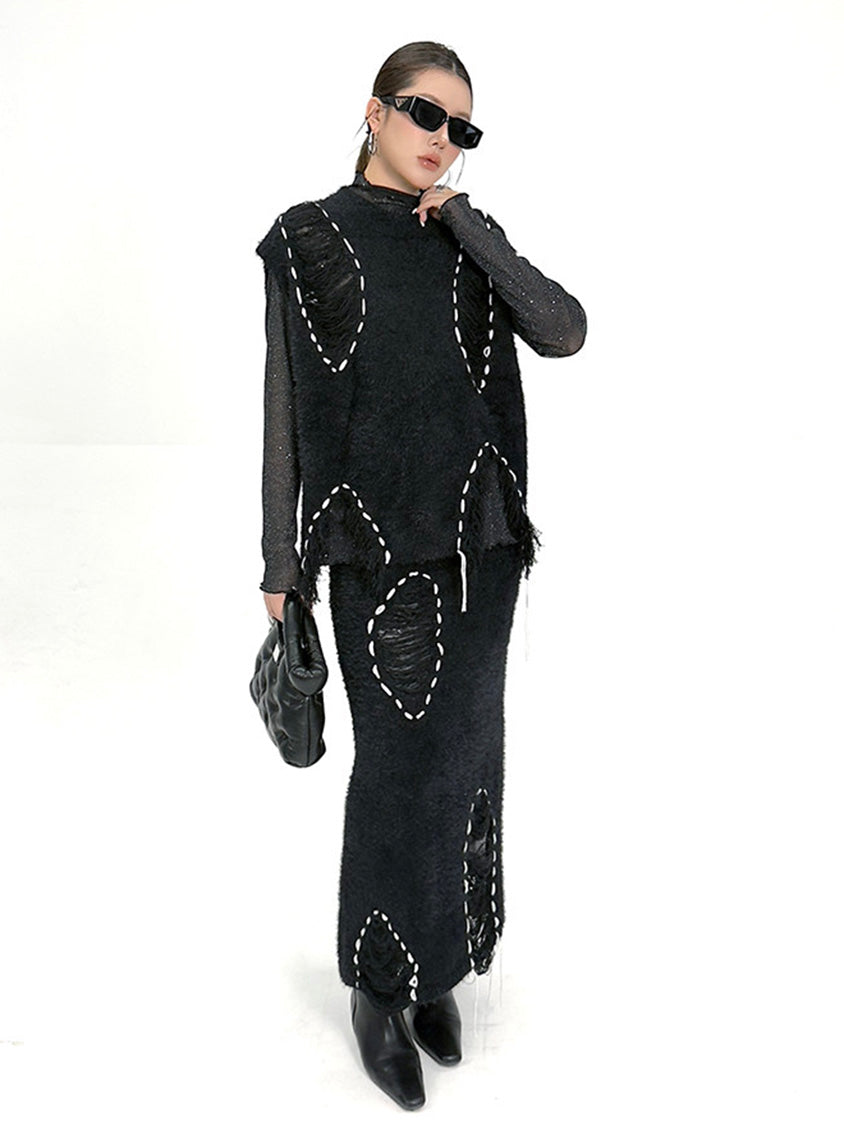 トップは起毛感のある表情を基調に、白糸によるステッチ風ディテールを点在させた構成。肩まわりから身頃にかけて自然な厚みを持たせ、立体的な輪郭を描く。スカートは同素材で統一し、縦方向に配置されたステッチモチーフが動きに合わせて陰影を生む設計。上下を通して質感とリズムを揃え、落ち着いたムードの中に奥行きを与える構成