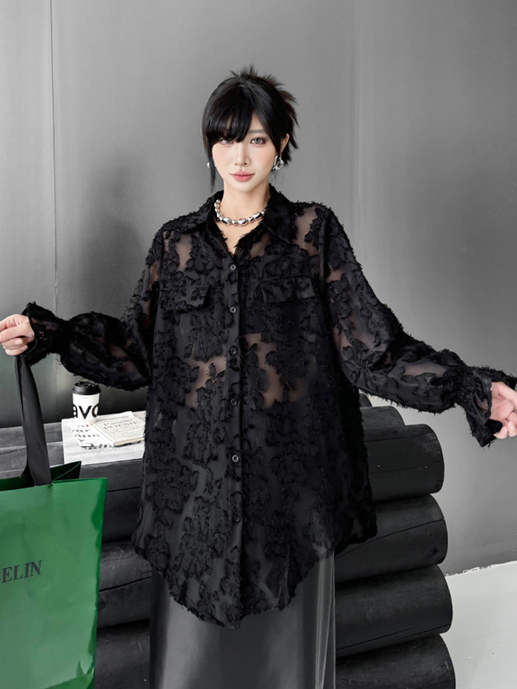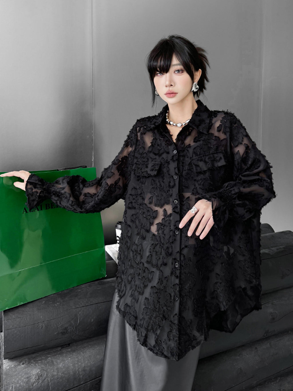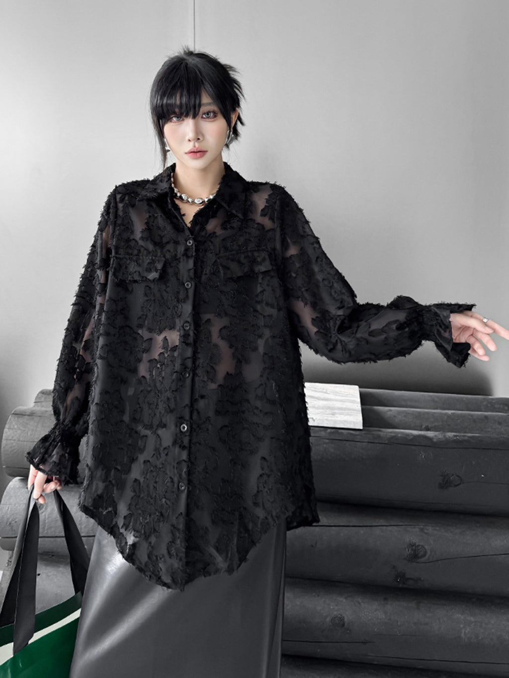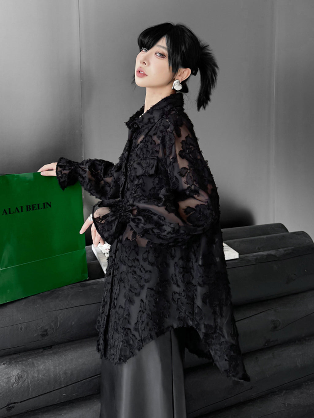 透け感のあるシフォン素材に、花柄のフロッキー加工を全面に施したブラウス。ドロップショルダーのシルエットとゆったりした袖に加え、カフ部分にはシャーリング風のギャザーを入れ、柔らかな表情をプラス。前開きの比翼仕立てに加え、胸元にはフラップポケットを配置。後ろ下がりのアシンメトリーなヘムラインが動きと奥行きを与える。シンプルなボトムスと合わせるだけで存在感が際立つ1枚。