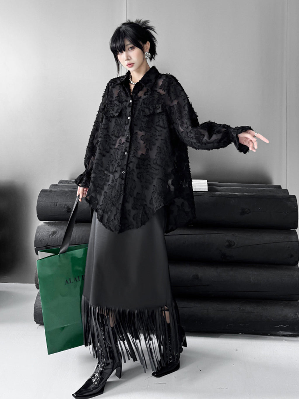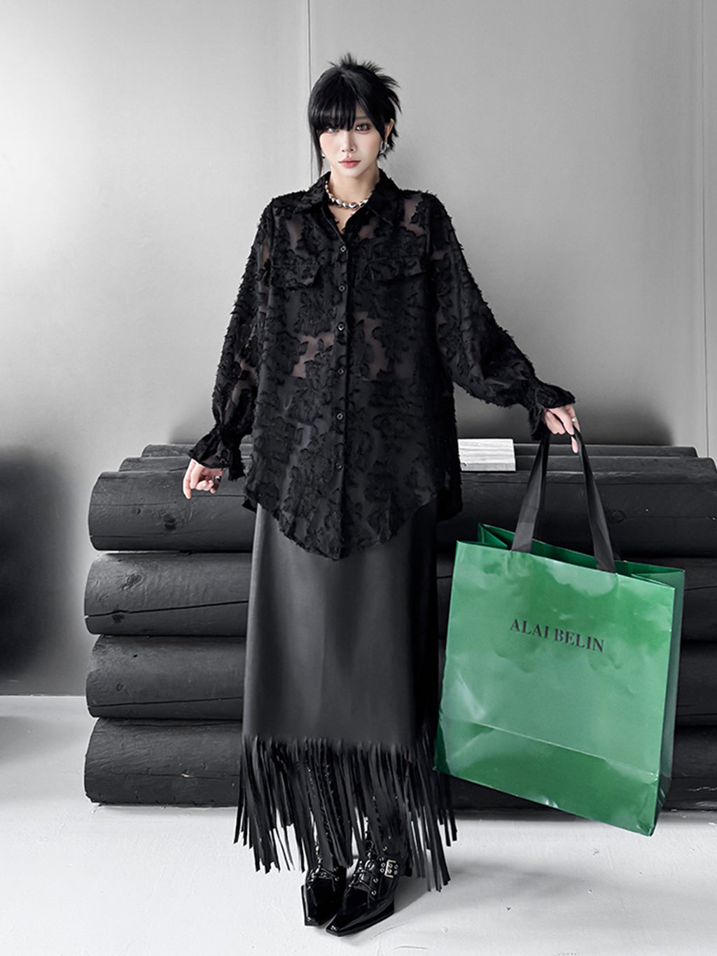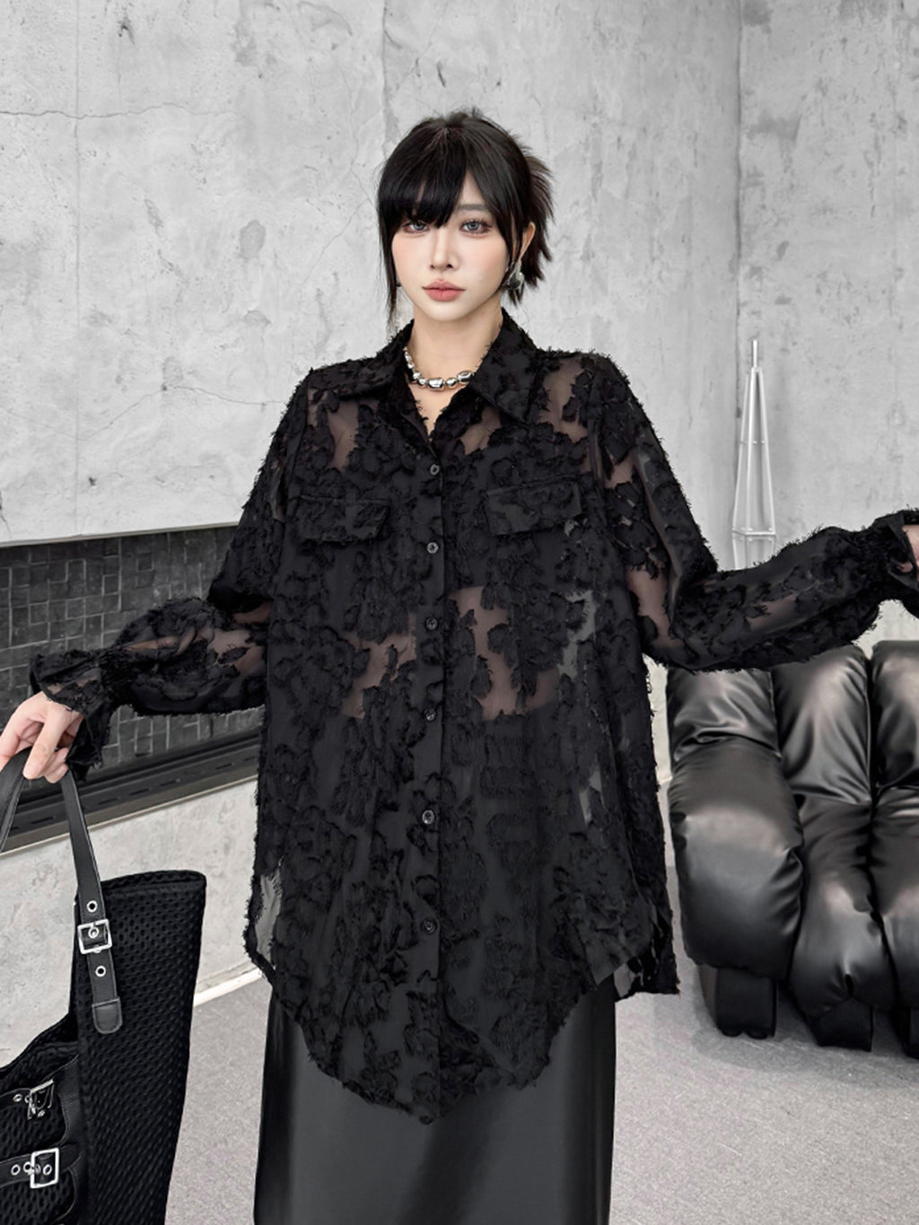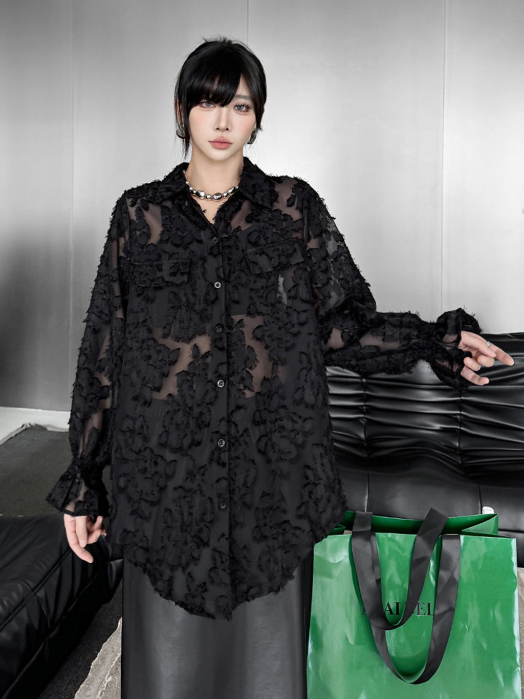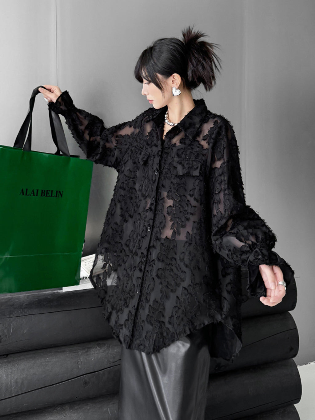 透け感のあるシフォン素材に、花柄のフロッキー加工を全面に施したブラウス。ドロップショルダーのシルエットとゆったりした袖に加え、カフ部分にはシャーリング風のギャザーを入れ、柔らかな表情をプラス。前開きの比翼仕立てに加え、胸元にはフラップポケットを配置。後ろ下がりのアシンメトリーなヘムラインが動きと奥行きを与える。シンプルなボトムスと合わせるだけで存在感が際立つ1枚。