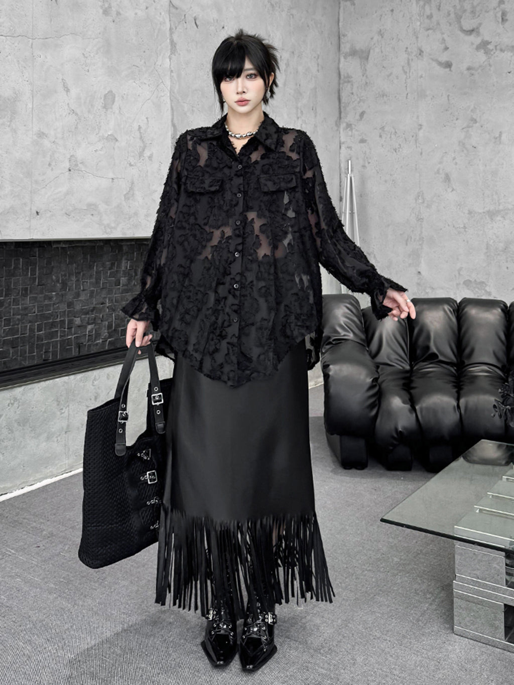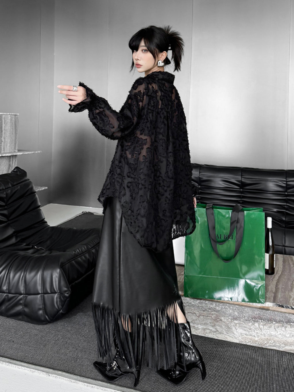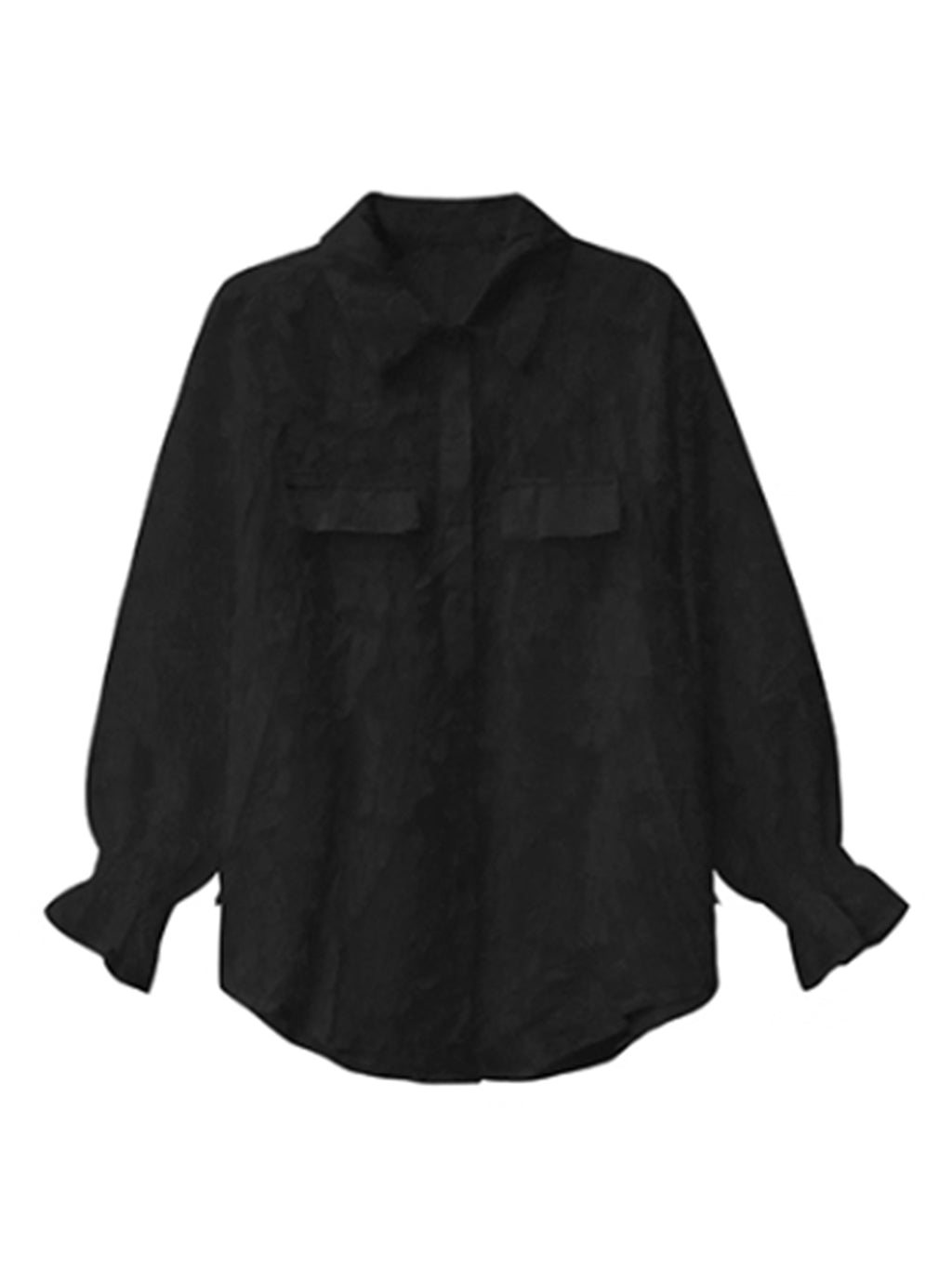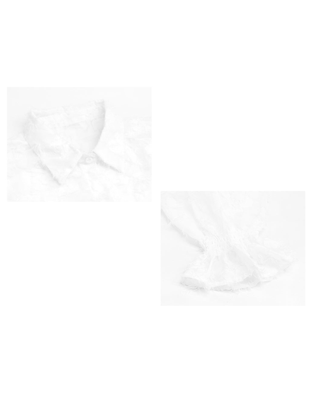 透け感のあるシフォン素材に、花柄のフロッキー加工を全面に施したブラウス。ドロップショルダーのシルエットとゆったりした袖に加え、カフ部分にはシャーリング風のギャザーを入れ、柔らかな表情をプラス。前開きの比翼仕立てに加え、胸元にはフラップポケットを配置。後ろ下がりのアシンメトリーなヘムラインが動きと奥行きを与える。シンプルなボトムスと合わせるだけで存在感が際立つ1枚。