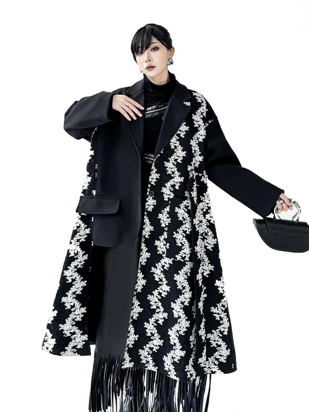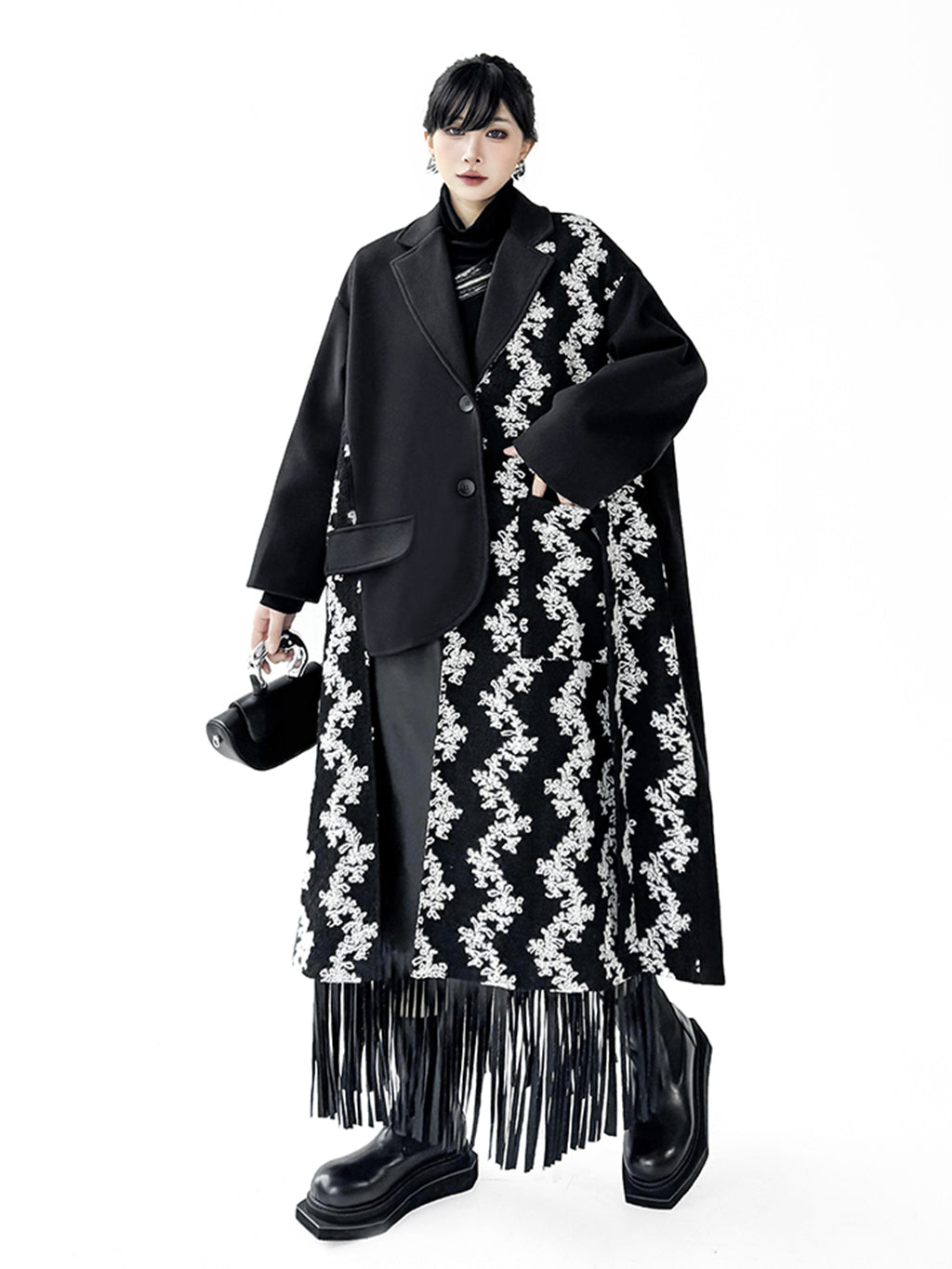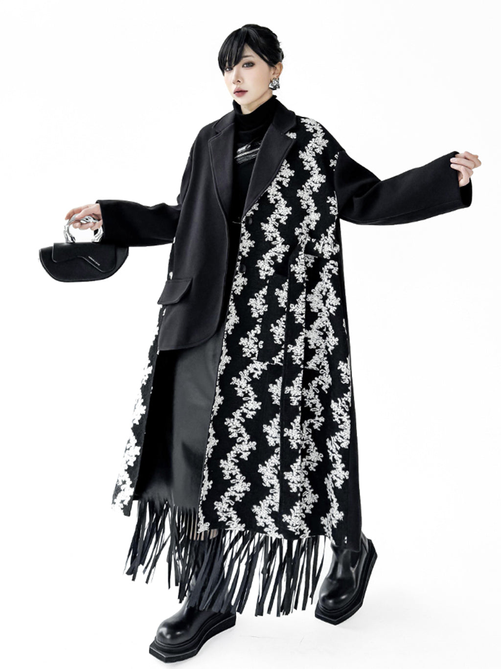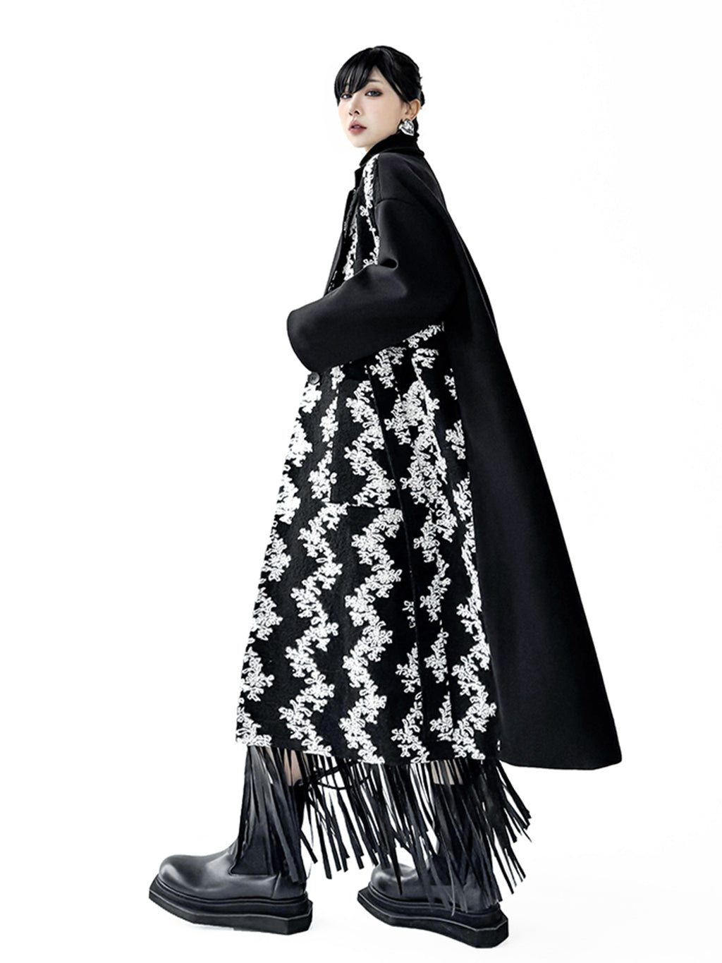 無地とフローラルパターンを大胆に切り替えたロングコート。構築的なショルダーラインと広がりのあるシルエットが、動きに合わせて流れるようなラインを生む。厚みのある生地が空気を含み、立体的なフォルムを形成。フリンジを覗かせるレイヤードスタイルにも相性が良く、エッジの効いたモードな存在感を際立たせる。