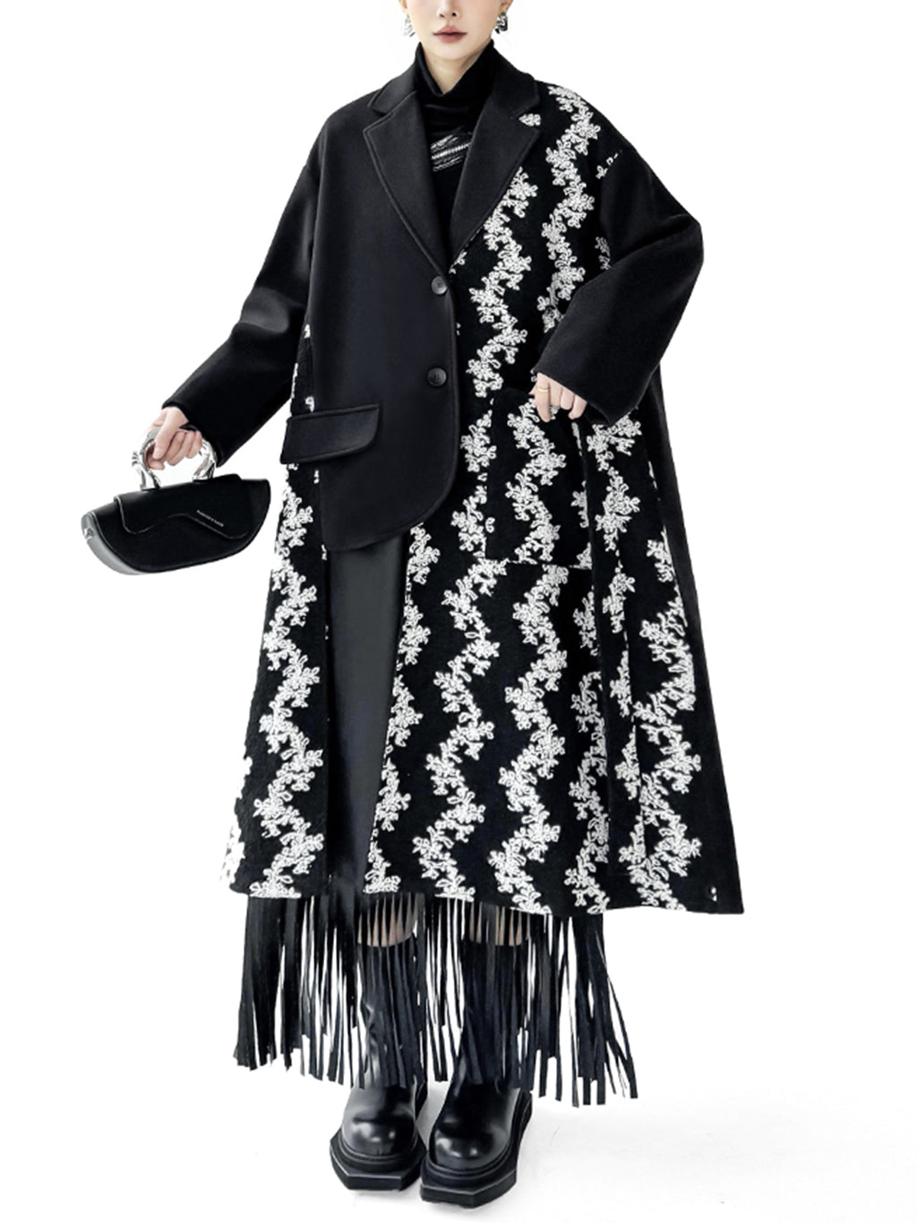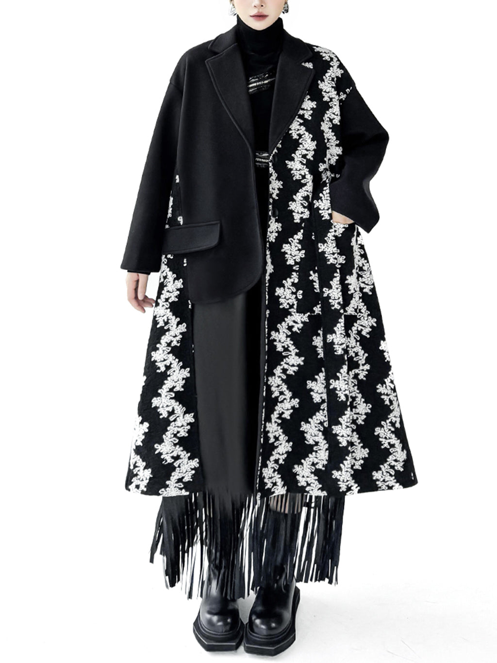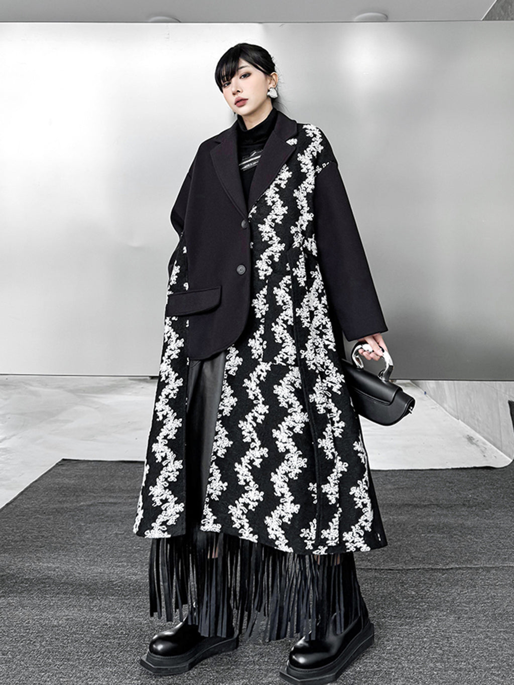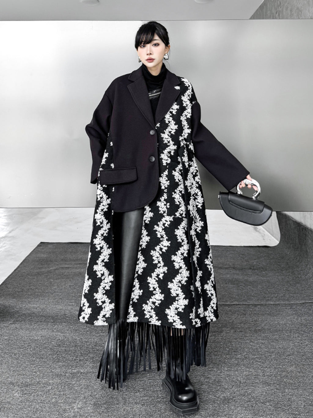 無地とフローラルパターンを大胆に切り替えたロングコート。構築的なショルダーラインと広がりのあるシルエットが、動きに合わせて流れるようなラインを生む。厚みのある生地が空気を含み、立体的なフォルムを形成。フリンジを覗かせるレイヤードスタイルにも相性が良く、エッジの効いたモードな存在感を際立たせる。
