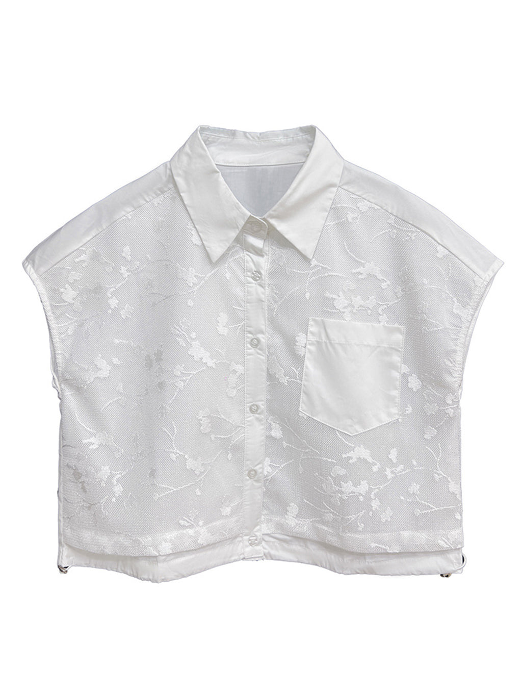 立体的なフラワージャカードをフロント全面にあしらい、シアーな質感と構築的なシルエットが融合したクロップド丈シャツ。肩を落とした幅広のショルダーラインがモードな雰囲気を演出し、裾にはドローストリング入りでシルエットの調整も自在。胸ポケットと比翼風ボタンデザインがミニマルな印象を引き立てる。カジュアルにもエッジィにも振れる万能な一枚。
