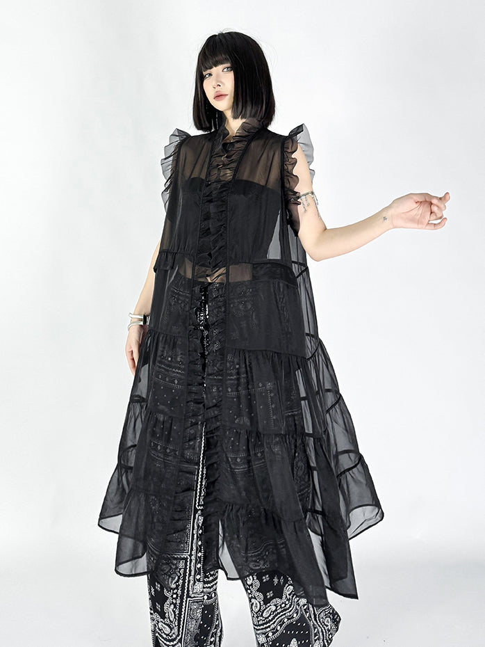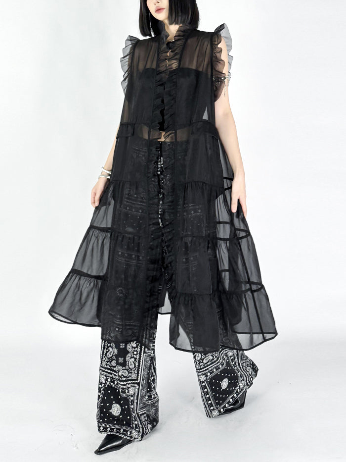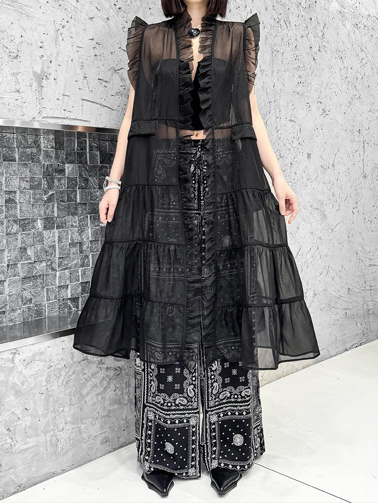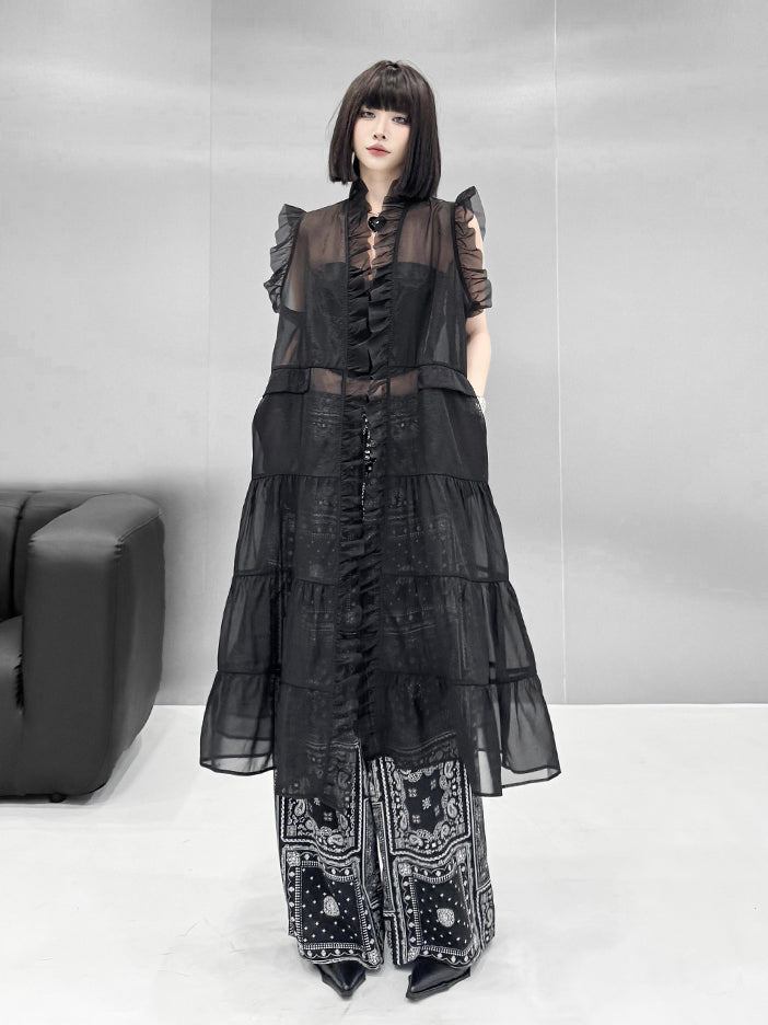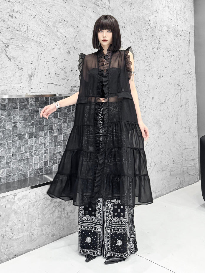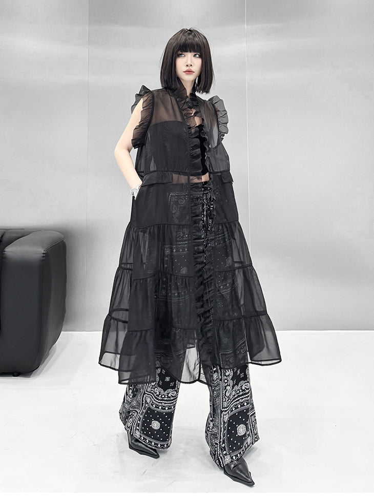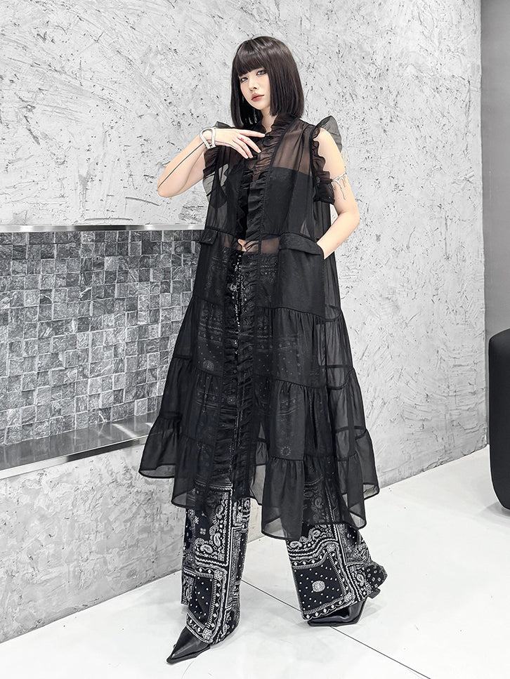 透け感のある軽やかなブラックシアー素材を使用したロングドレス。ネックラインから裾にかけて細やかなフリルが施され、縦のラインを強調。ティアード構造による奥行きと動きのあるシルエットが印象を深める。袖や肩にもボリューム感を出すフリルを配置し、全体に立体的なニュアンスを持たせている。モードな柄パンツとのレイヤードでエッジの効いたスタイルを完成させられる