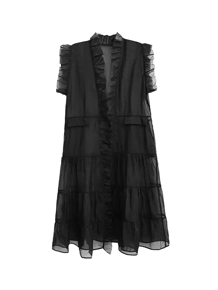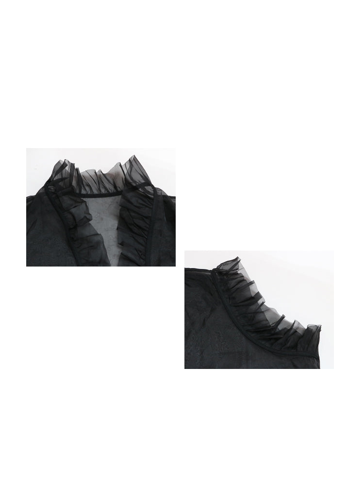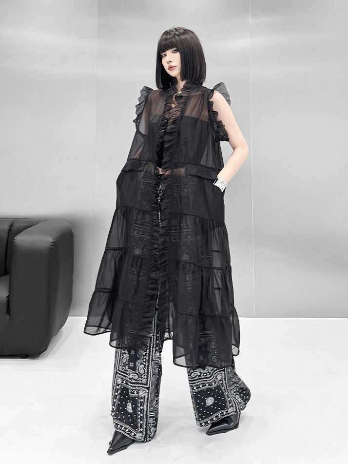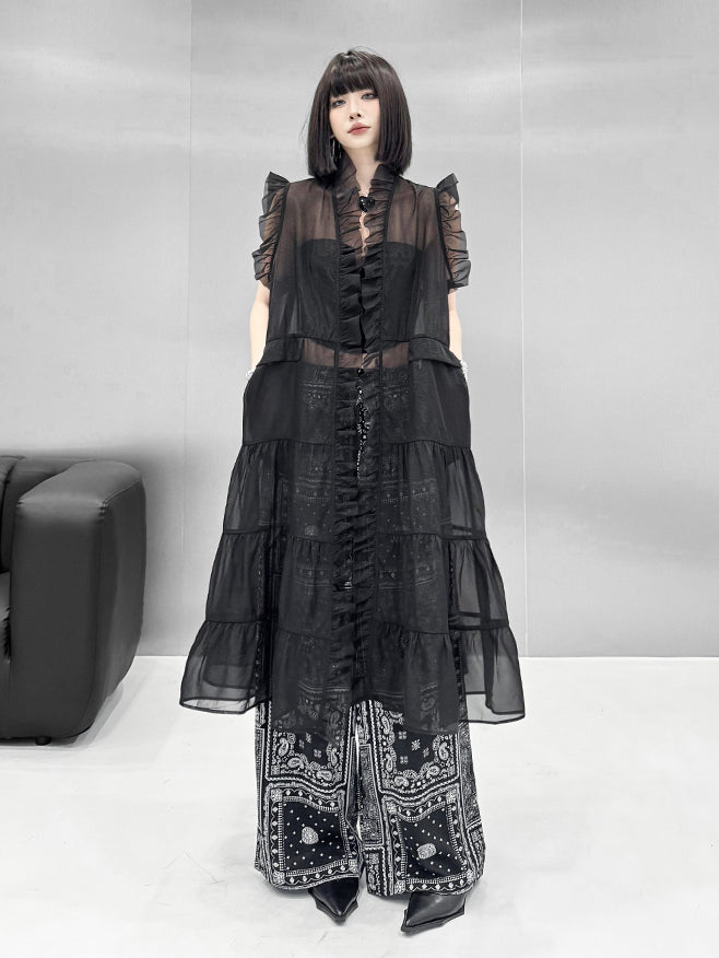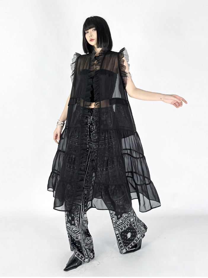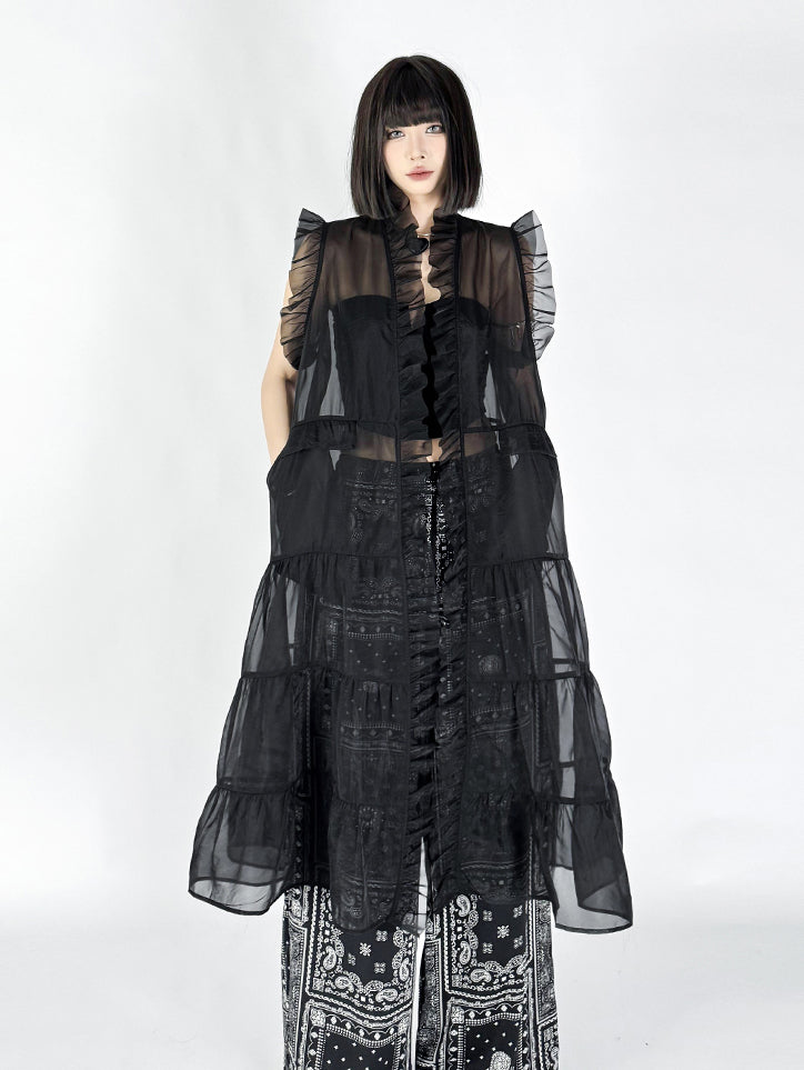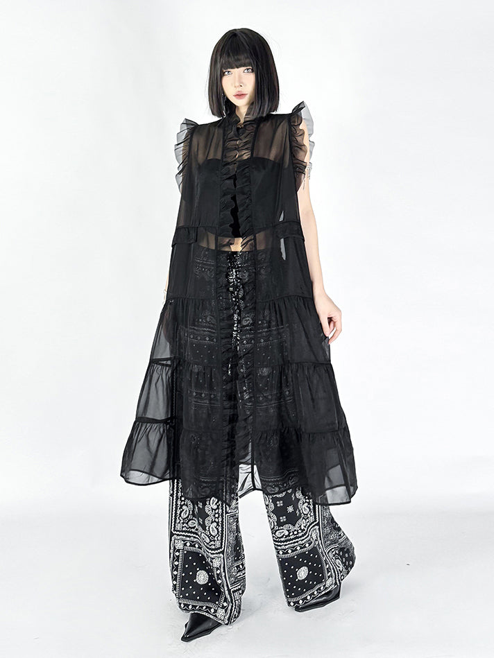 透け感のある軽やかなブラックシアー素材を使用したロングドレス。ネックラインから裾にかけて細やかなフリルが施され、縦のラインを強調。ティアード構造による奥行きと動きのあるシルエットが印象を深める。袖や肩にもボリューム感を出すフリルを配置し、全体に立体的なニュアンスを持たせている。モードな柄パンツとのレイヤードでエッジの効いたスタイルを完成させられる