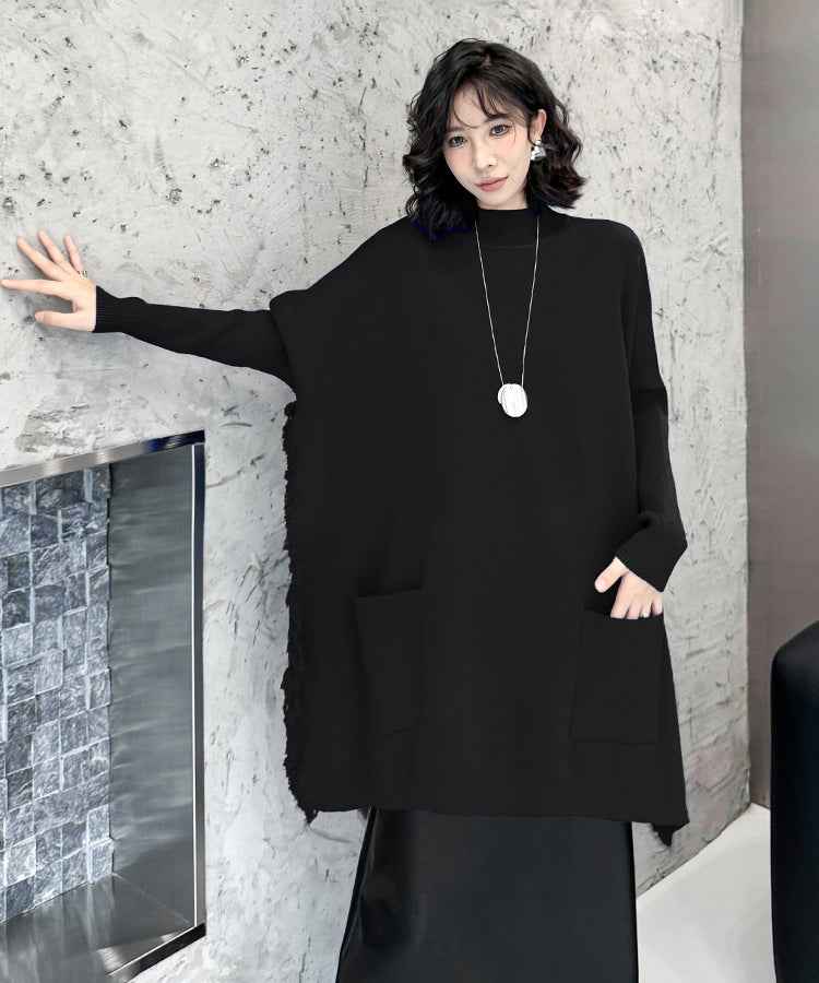 両サイドにフリンジディテールを施したスリット入りのセーター。直線的なラインを描くワイドな肩幅と、袖口まで続くリブの切り替えが構築的な印象を与える。モックネックが首元をすっきりと見せ、前後差をつけた裾のラウンドカットが自然な落ち感を生む。滑らかでやや厚みのあるコットンブレンドニットがボリュームのあるドレープを描き、フロントの大きめポケットがアクセントに。