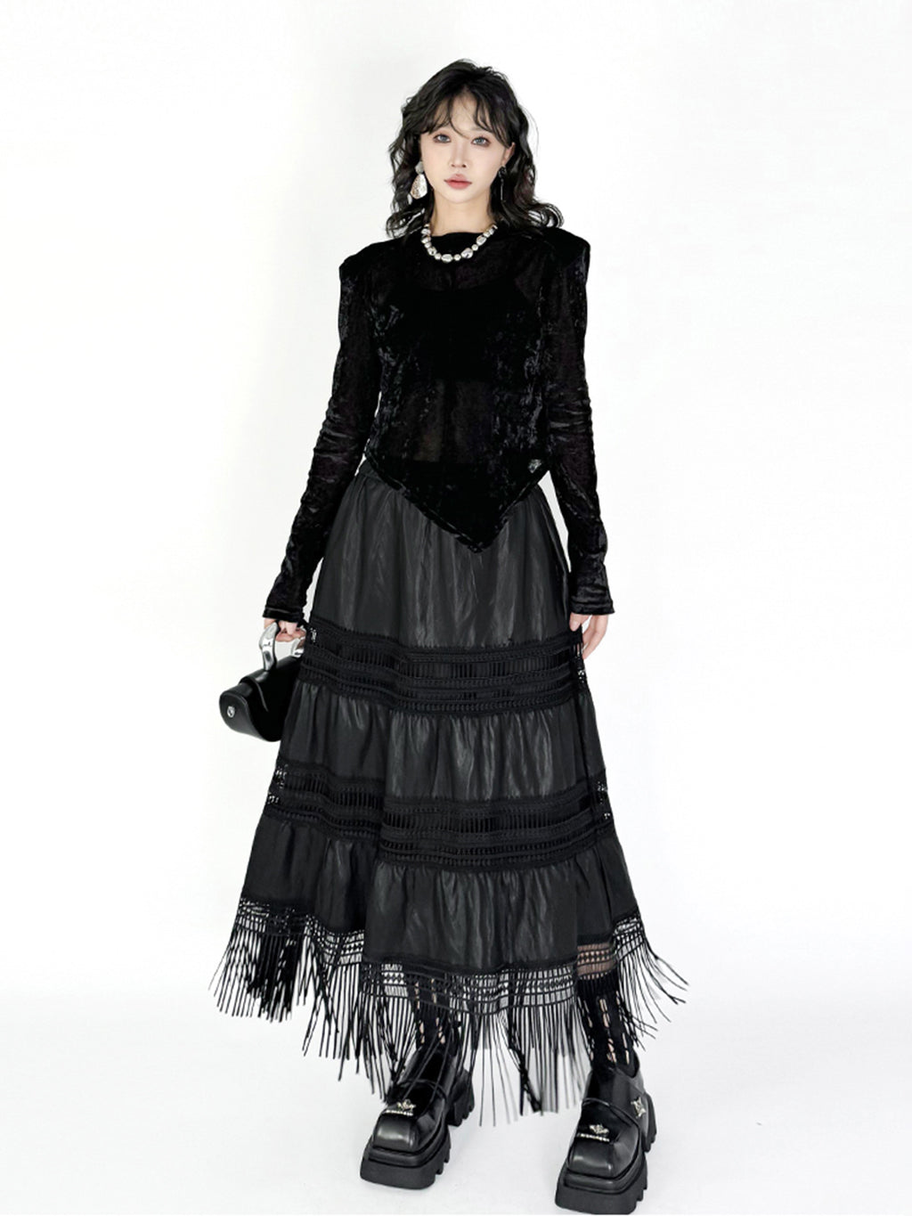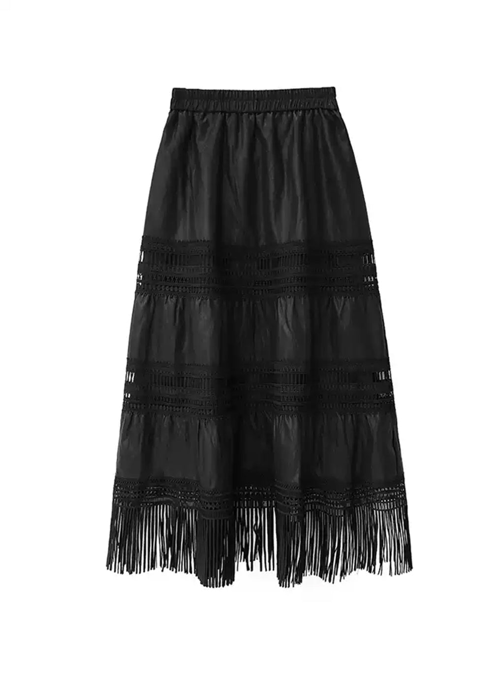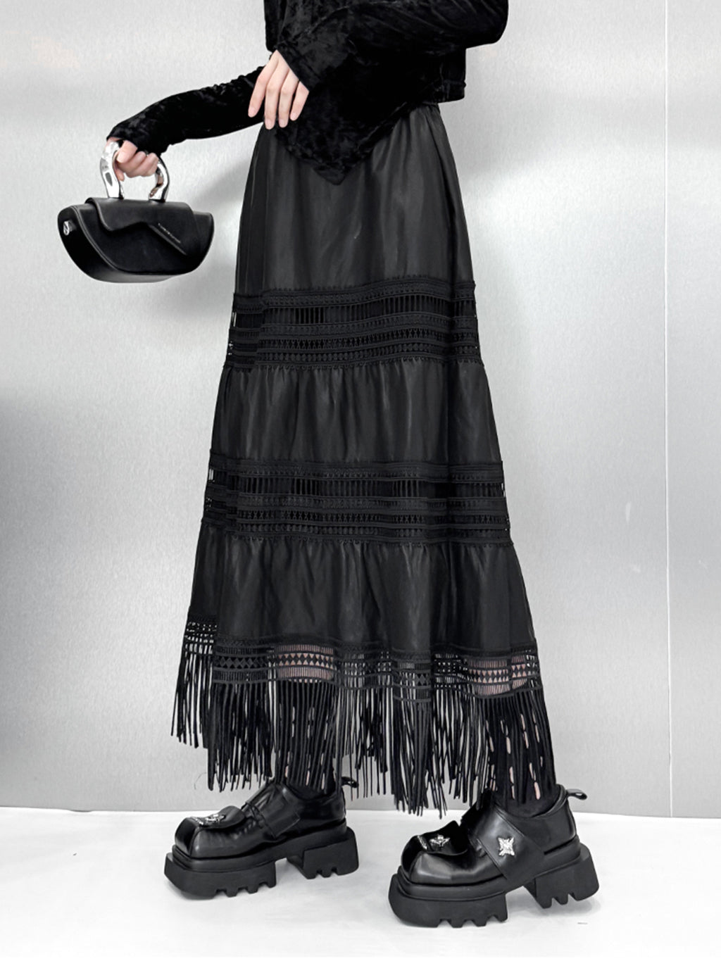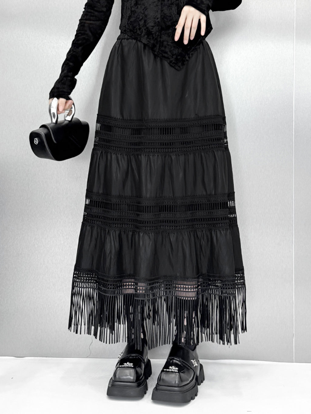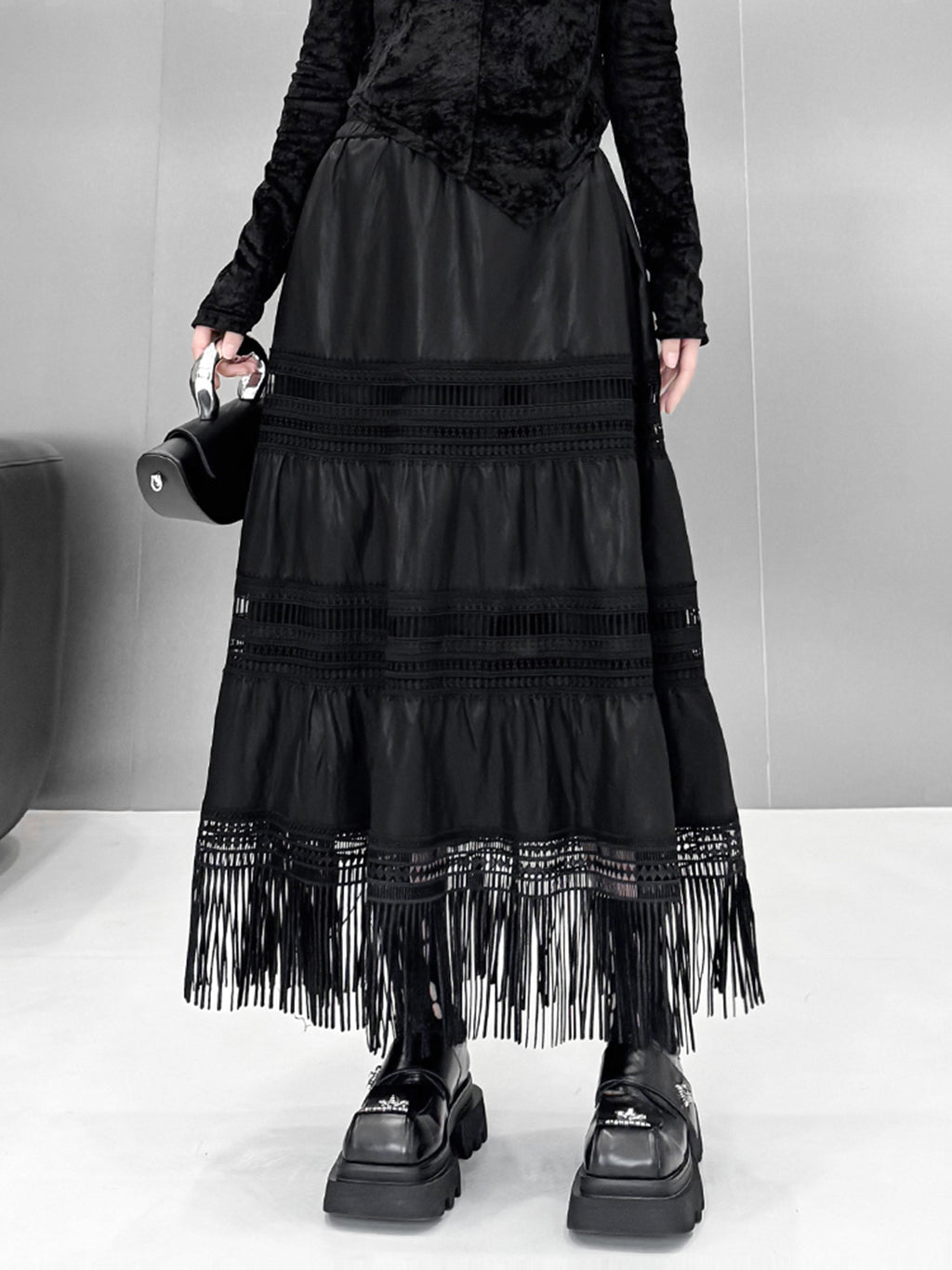 艶のある合成素材をベースに、3段のレース切り替えとロングフリンジをあしらったレイヤードスカート。ほどよいハリ感のある生地がシルエットを際立たせ、歩くたびに揺れるフリンジが動きに表情を添える。ウエストは総ゴム仕様でフィット感を高め、裏地付きで透け感を軽減。クラフト感あるレースデザインがモードな装いにも馴染み、スタイリングに奥行きを生み出す。
