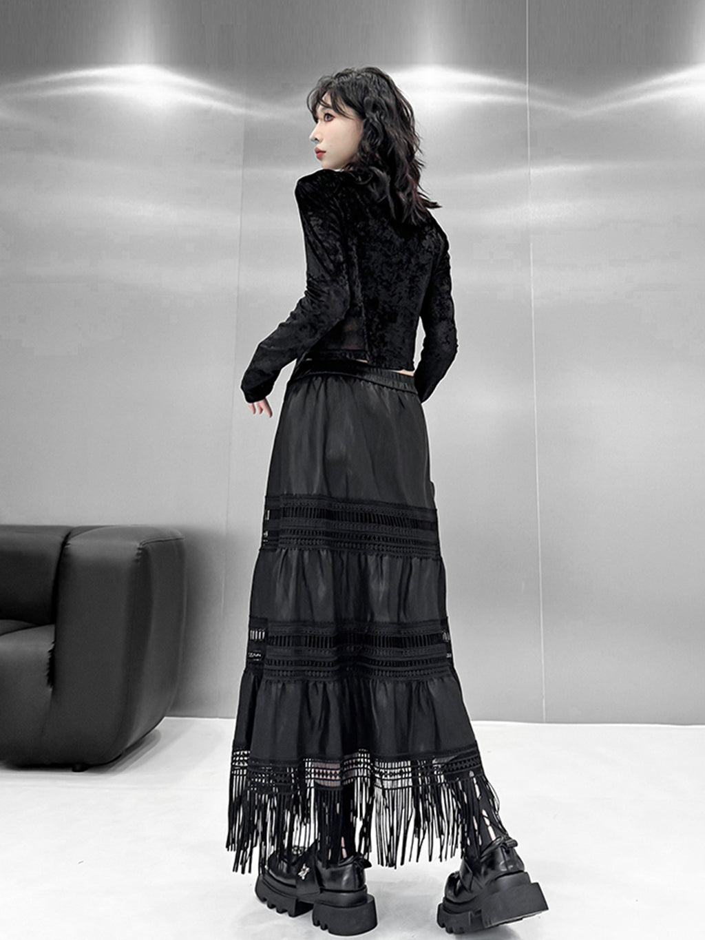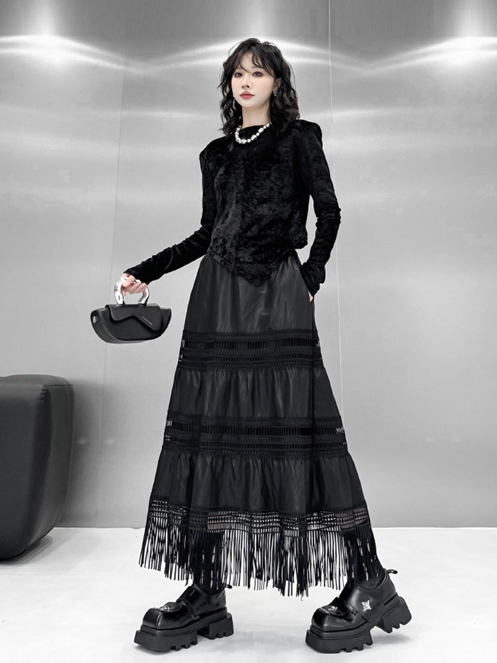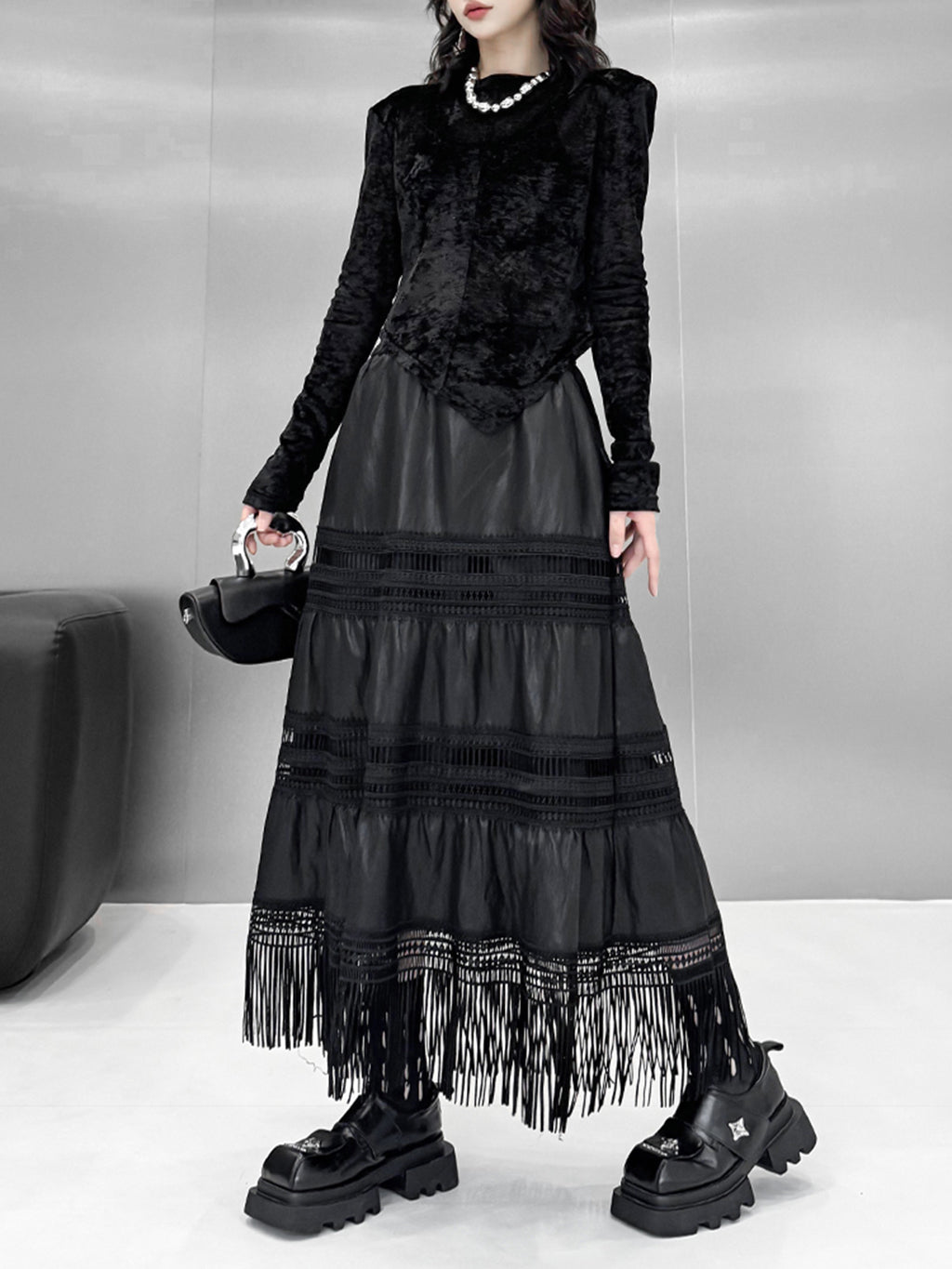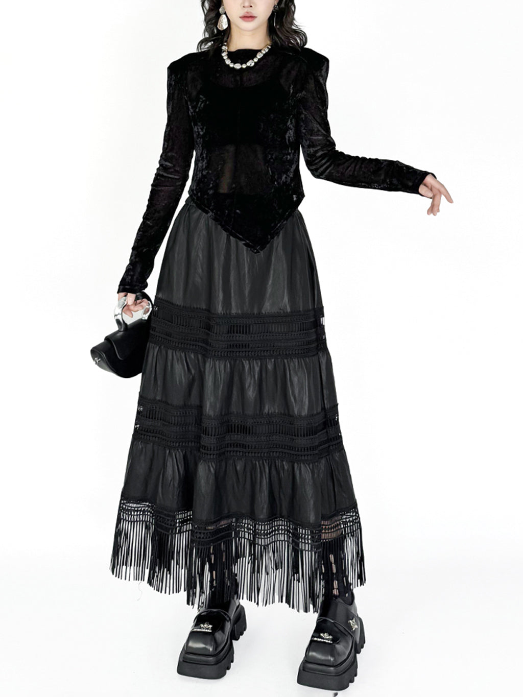 艶のある合成素材をベースに、3段のレース切り替えとロングフリンジをあしらったレイヤードスカート。ほどよいハリ感のある生地がシルエットを際立たせ、歩くたびに揺れるフリンジが動きに表情を添える。ウエストは総ゴム仕様でフィット感を高め、裏地付きで透け感を軽減。クラフト感あるレースデザインがモードな装いにも馴染み、スタイリングに奥行きを生み出す。