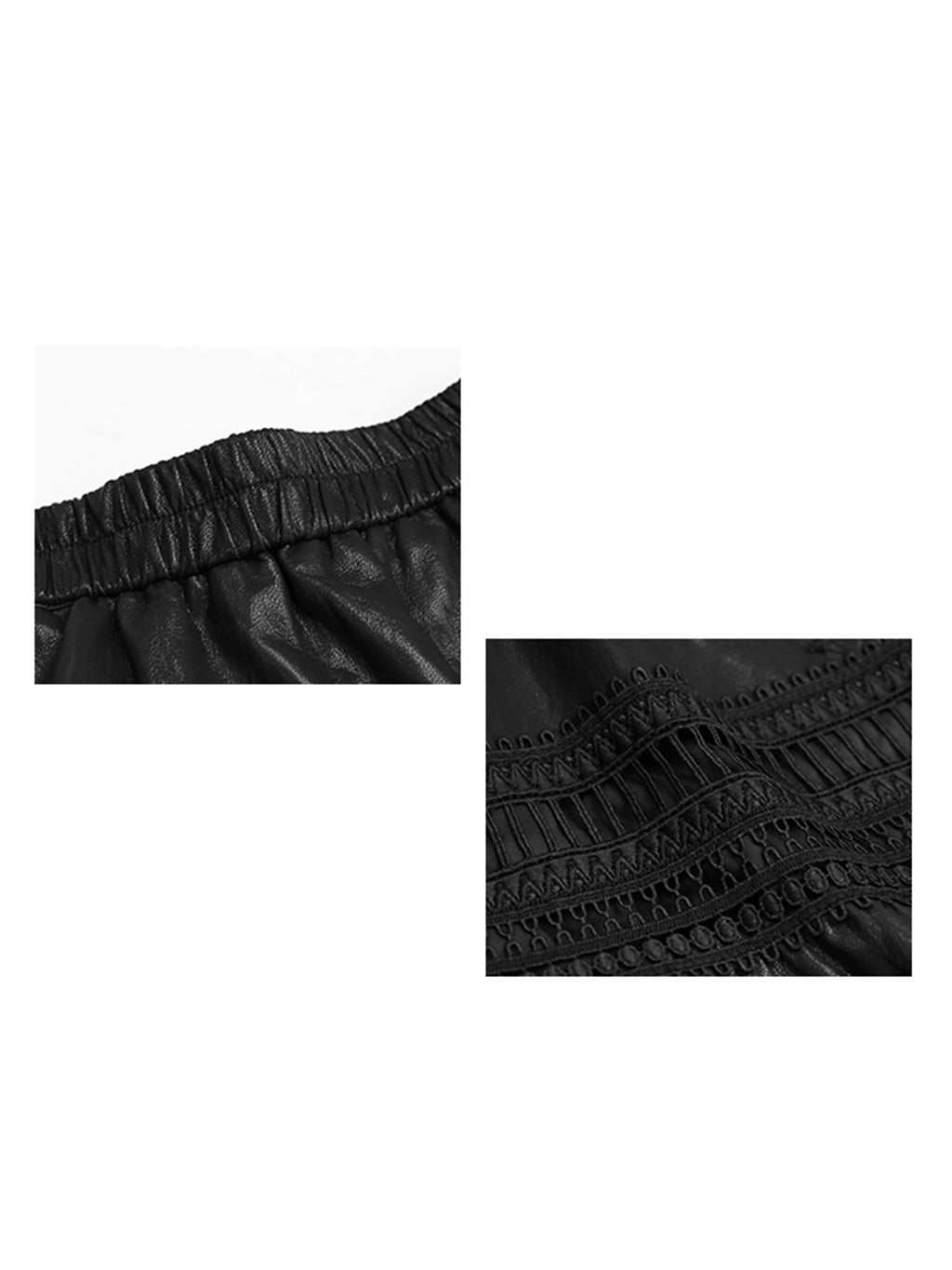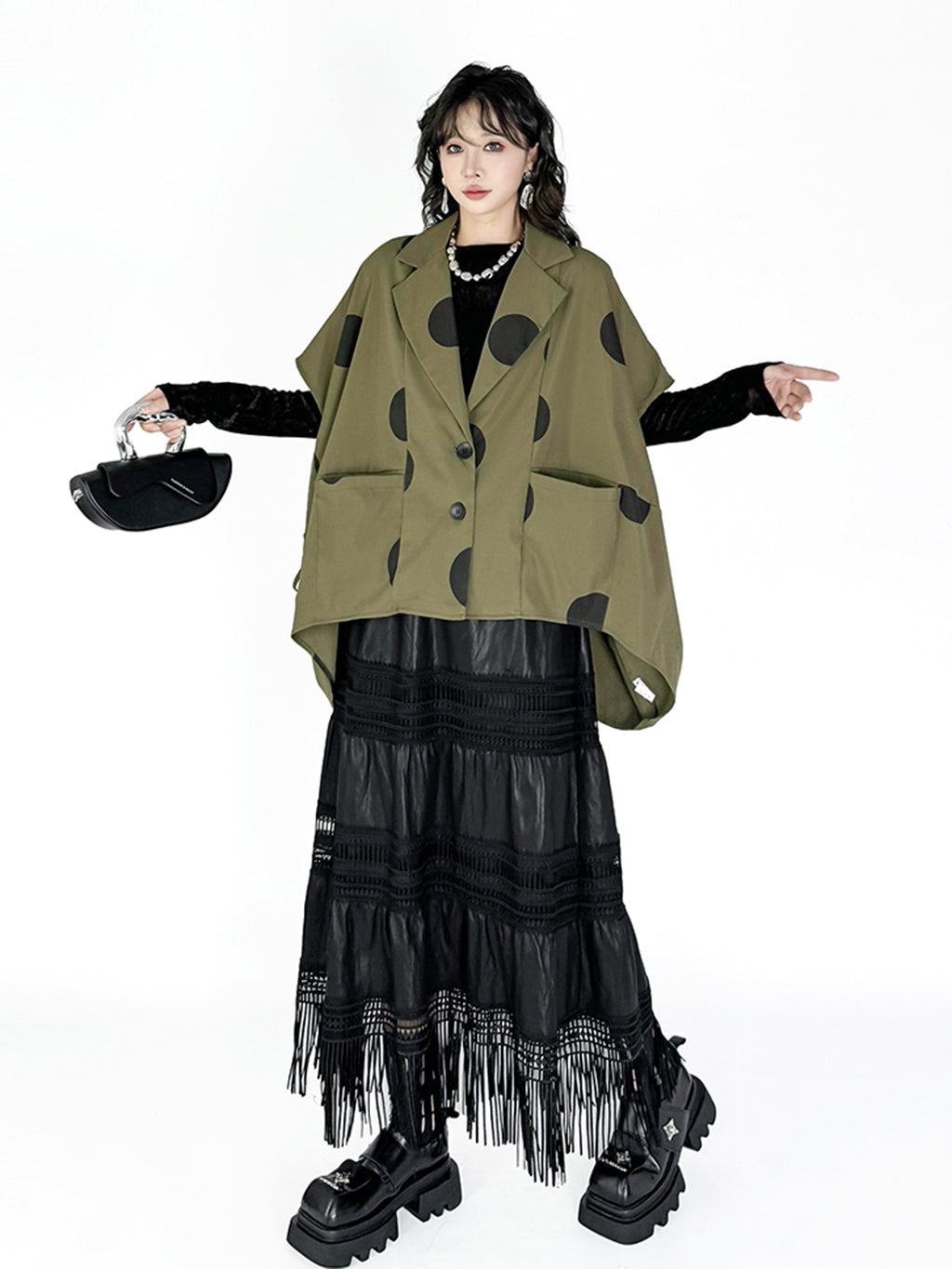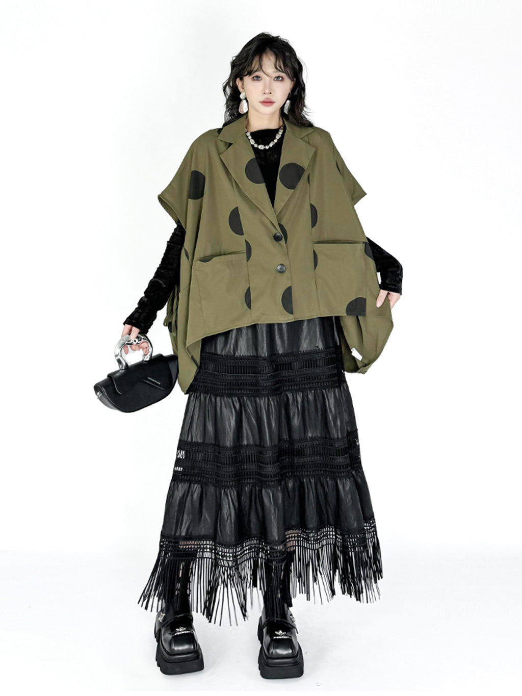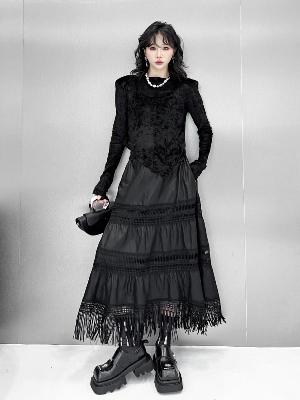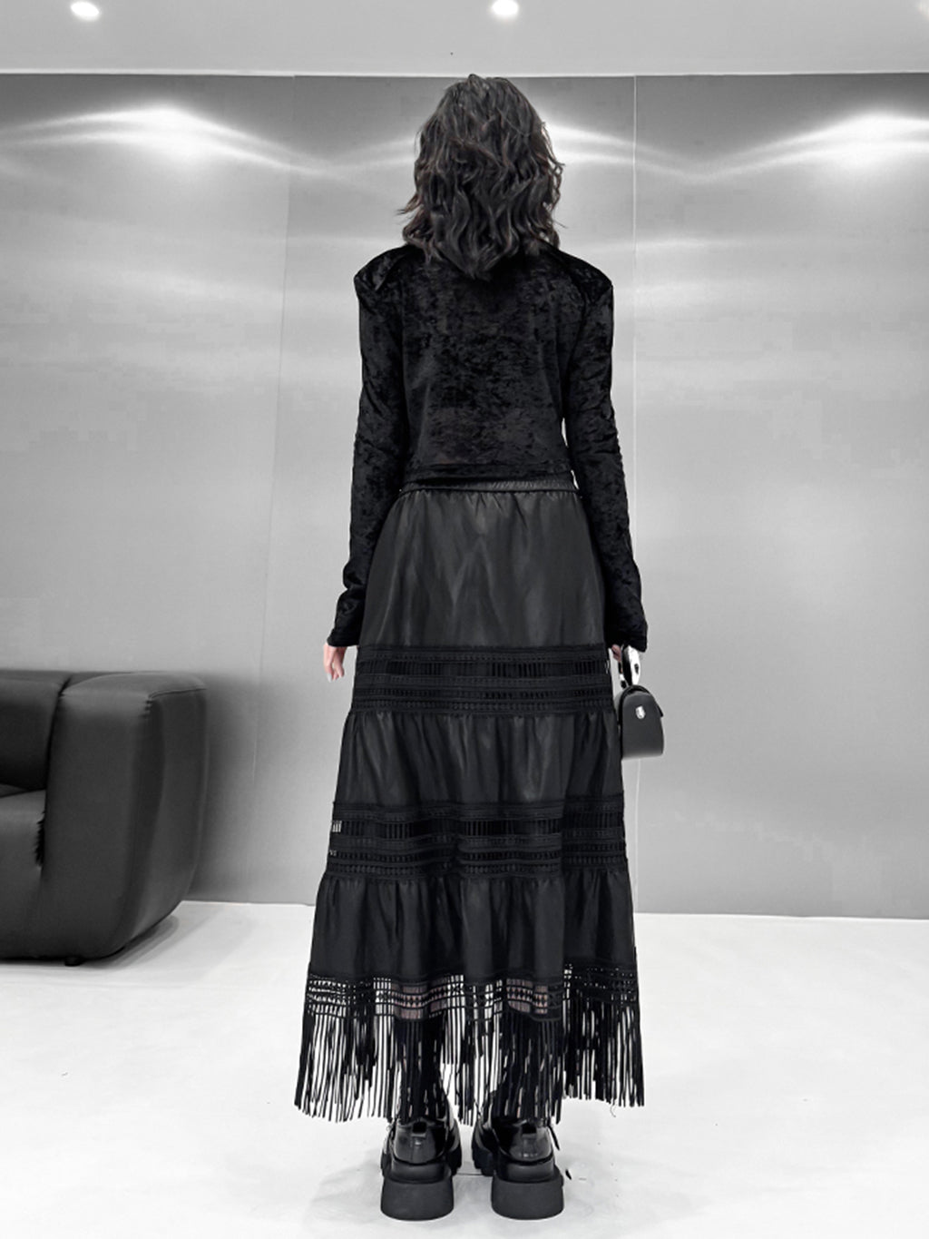 艶のある合成素材をベースに、3段のレース切り替えとロングフリンジをあしらったレイヤードスカート。ほどよいハリ感のある生地がシルエットを際立たせ、歩くたびに揺れるフリンジが動きに表情を添える。ウエストは総ゴム仕様でフィット感を高め、裏地付きで透け感を軽減。クラフト感あるレースデザインがモードな装いにも馴染み、スタイリングに奥行きを生み出す。