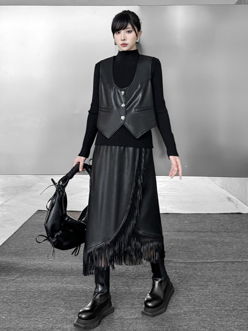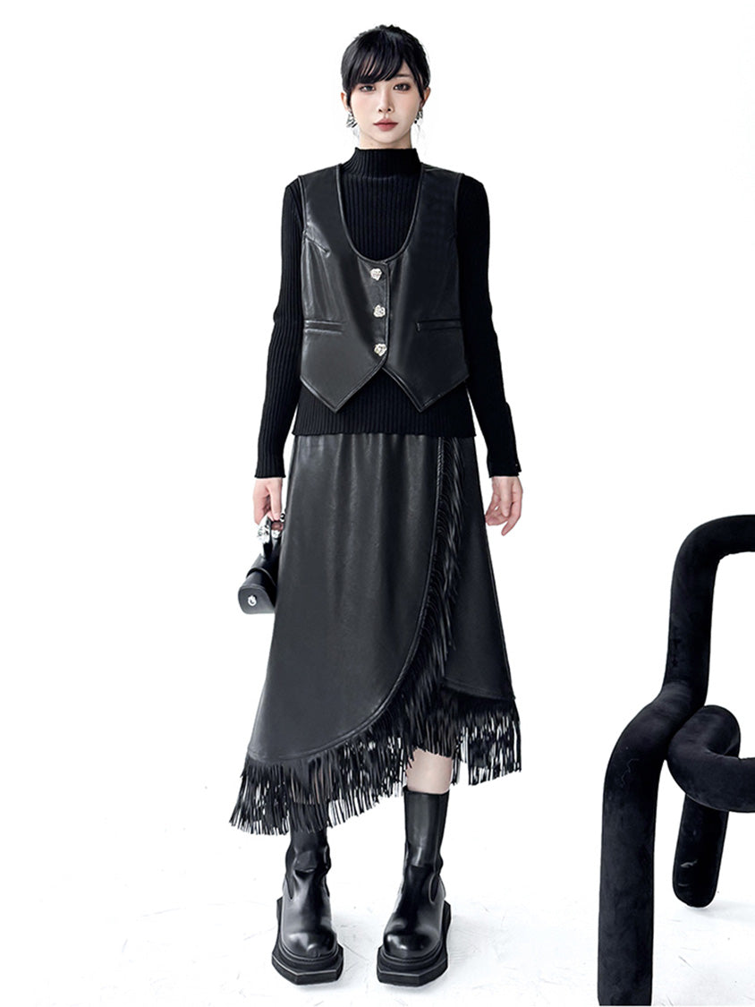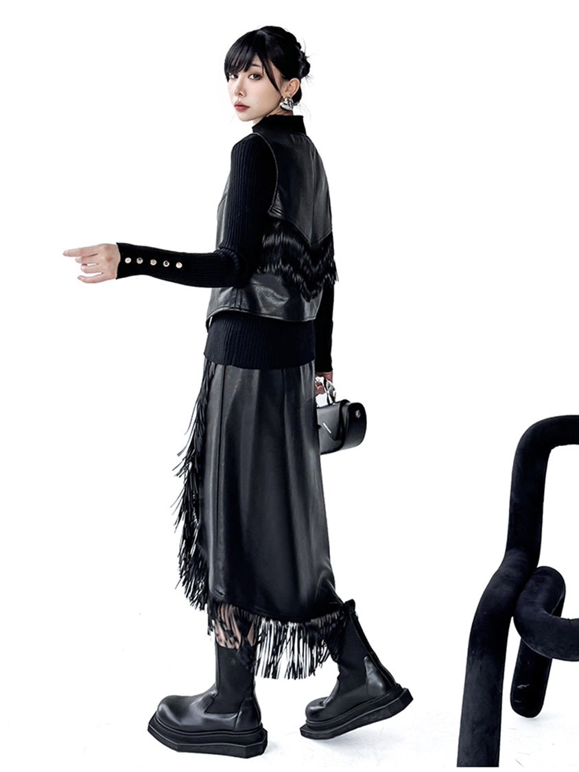 厚みのある生地にフリンジを走らせたベストと、流れを描くスカートで構成されたシリーズ。